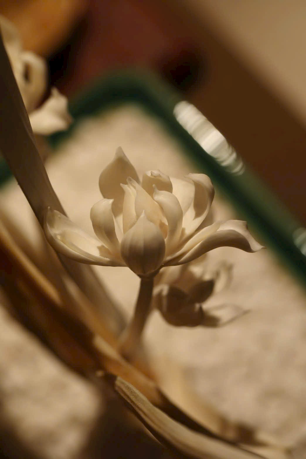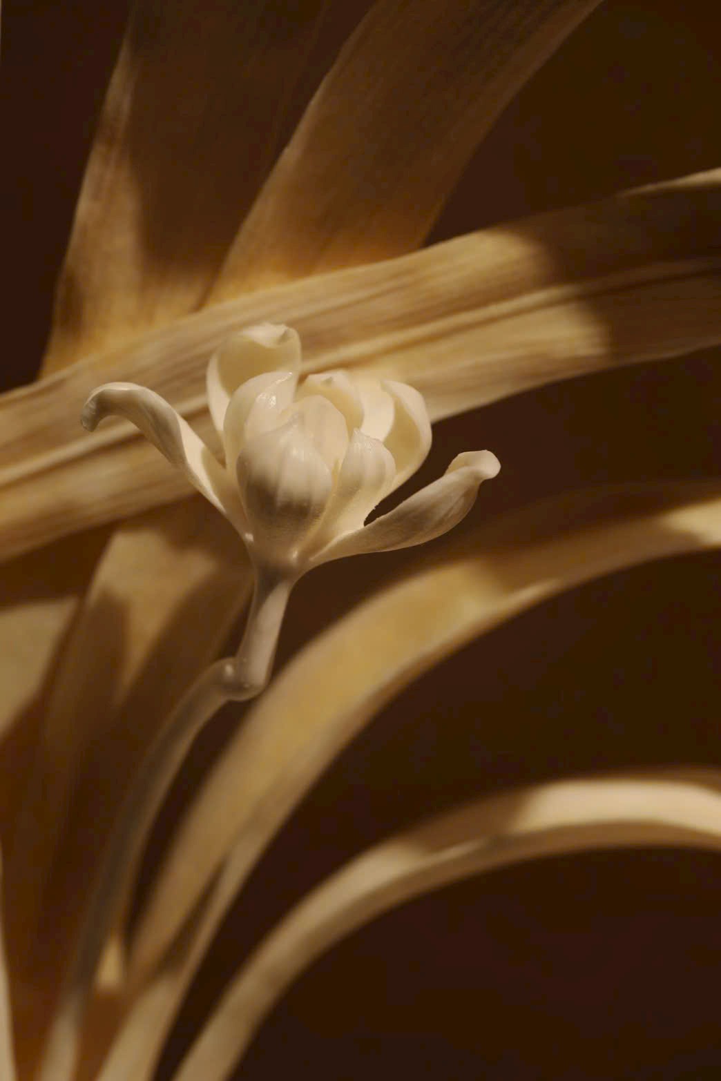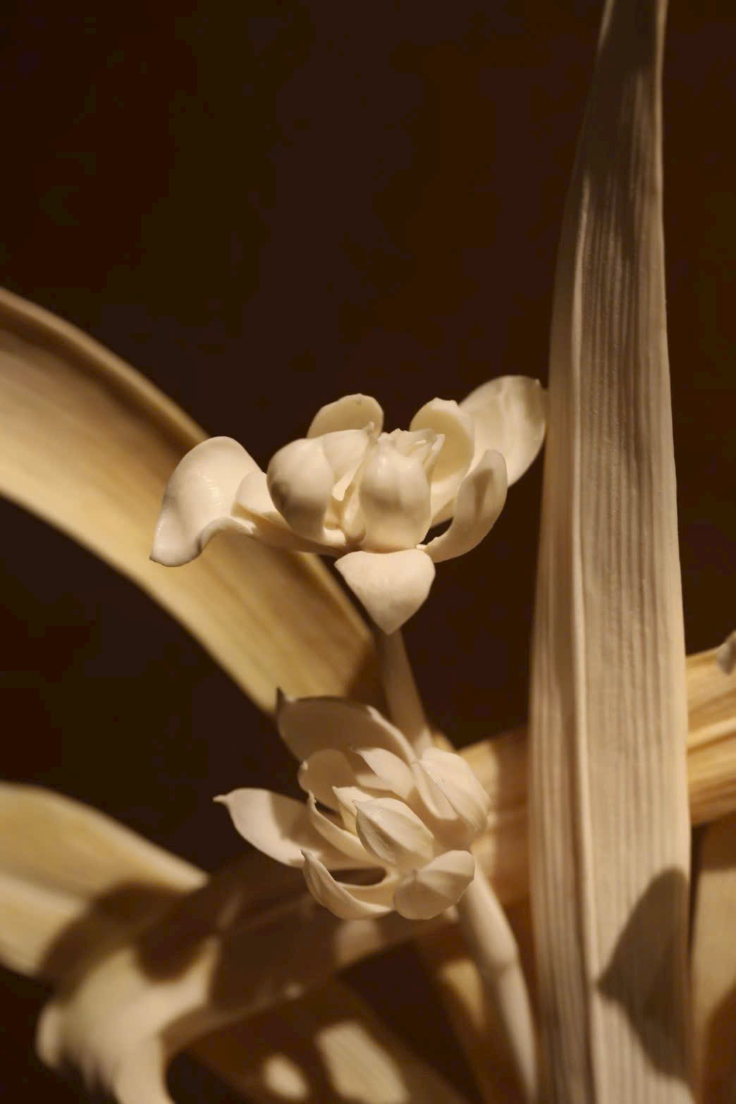 Đường dao phóng khoáng, hoa lá vươn nở thanh nhã, dáng đứng trang nhã tinh tế, động – tĩnh hài hòa, tràn đầy sinh khí. Tựa như làn gió nhẹ lướt qua, hương thơm kín đáo lan tỏa. Bày trên án thư, lặng lẽ tỏa hương, bốn mùa như hoa nở không tàn. Kết hợp chậu đế gốm sứ.