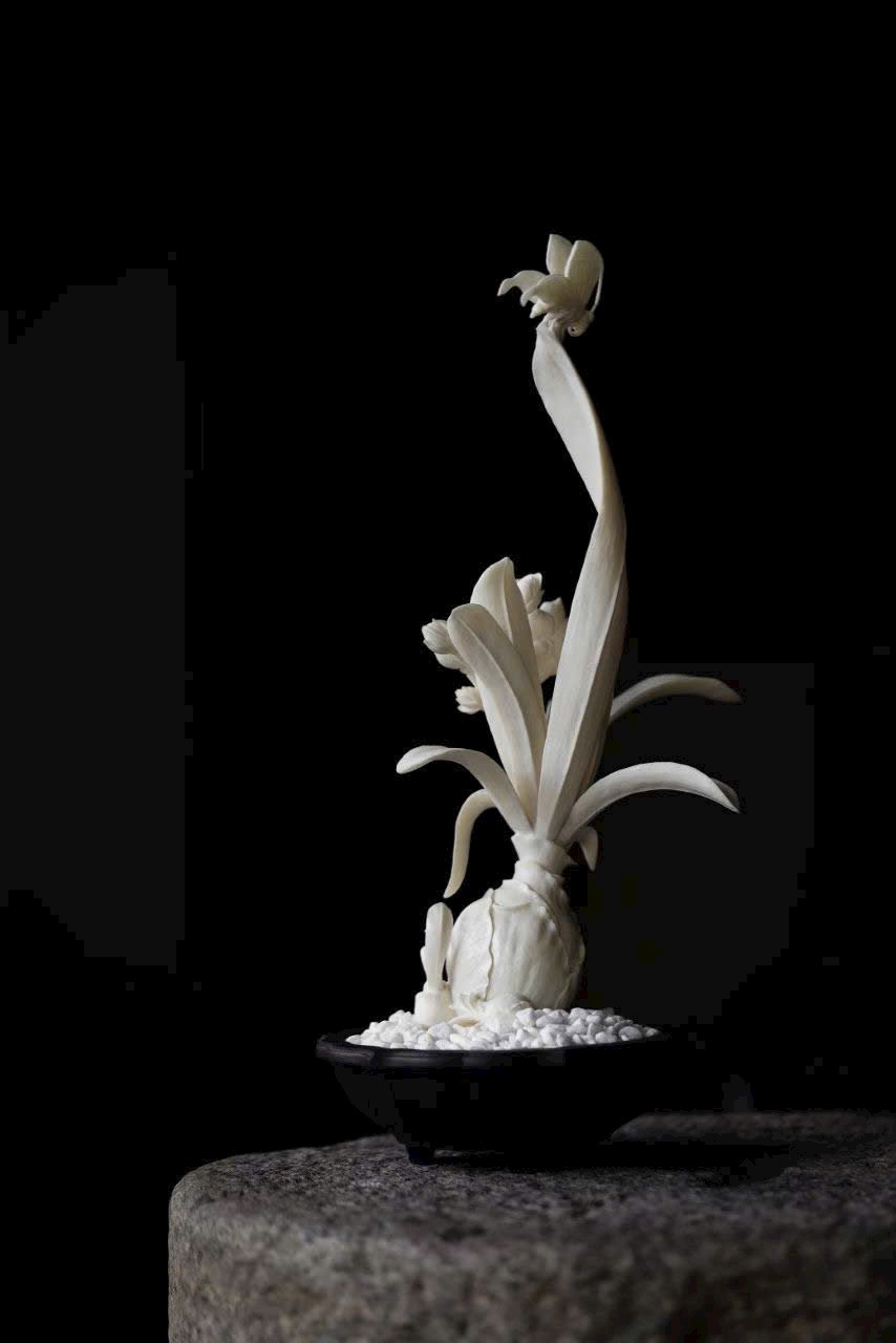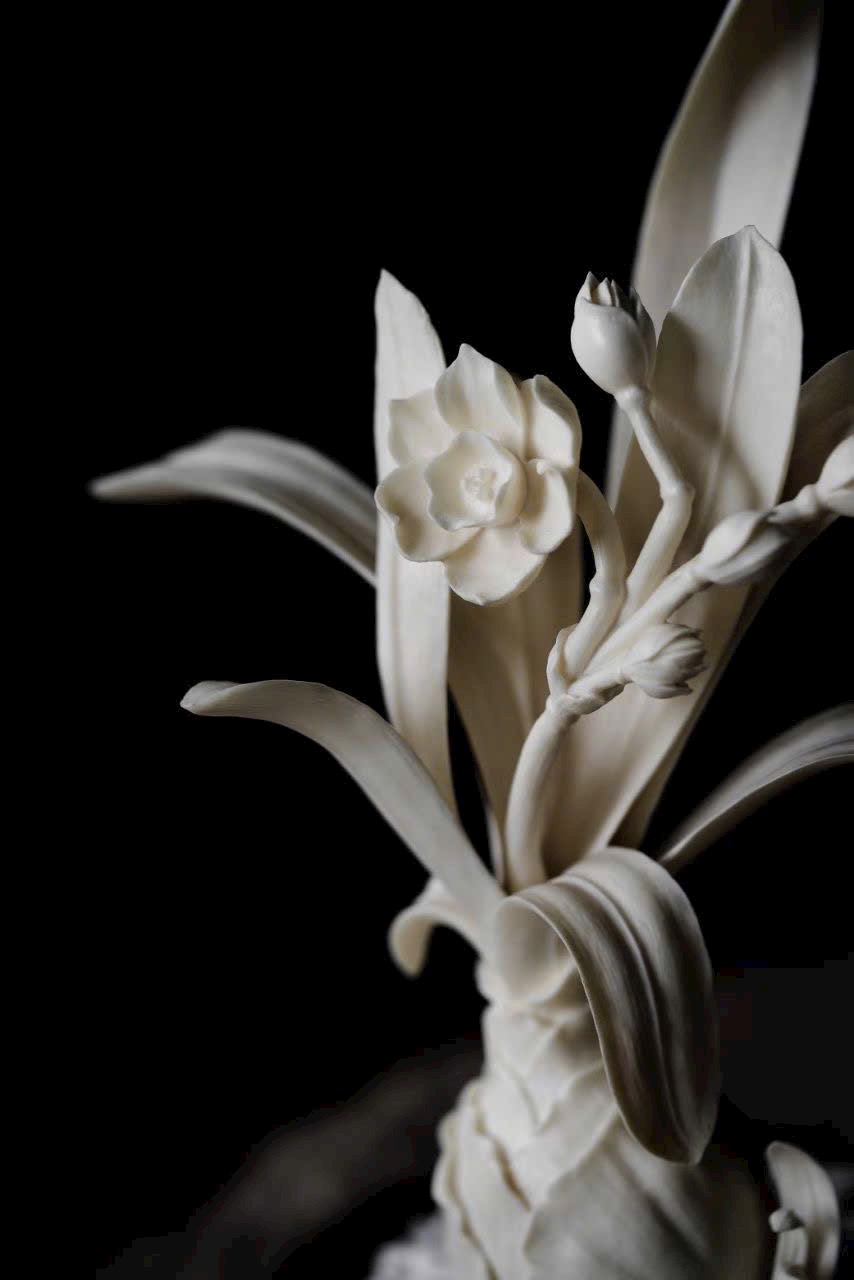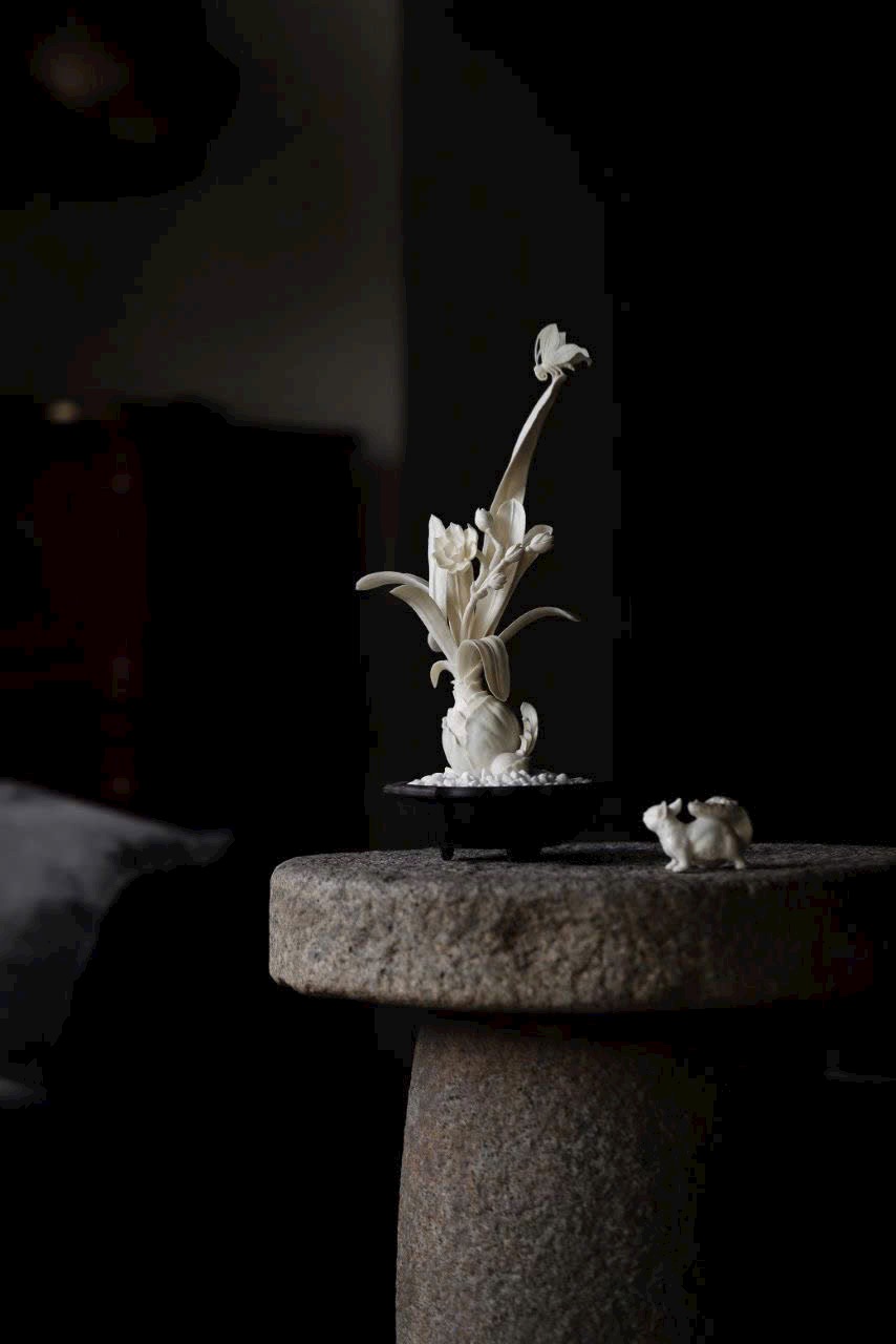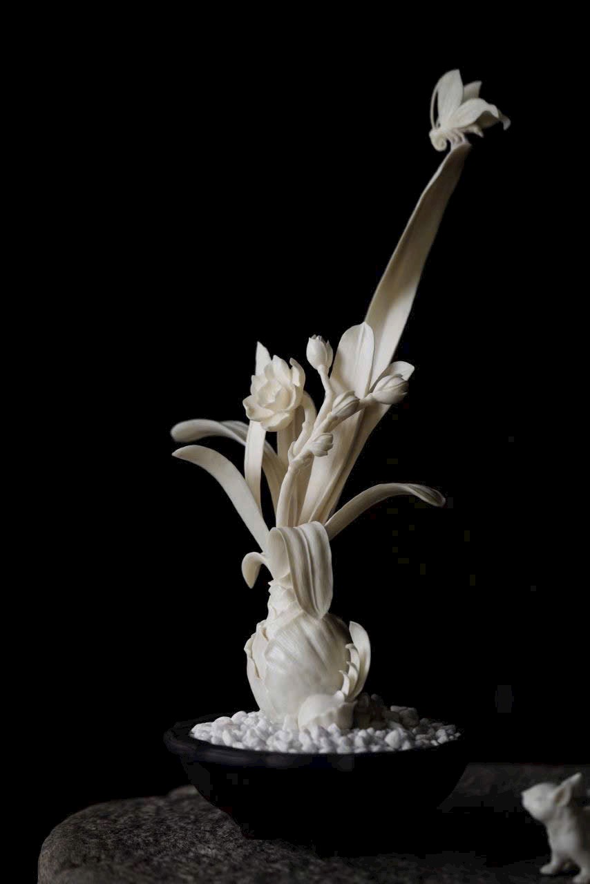 Chạm khắc tinh xảo hoa thủy tiên thanh tao, cánh bướm rung nhẹ đậu trên cánh ngọc, từng đường gân lá mảnh mai đều hiện rõ sống động.