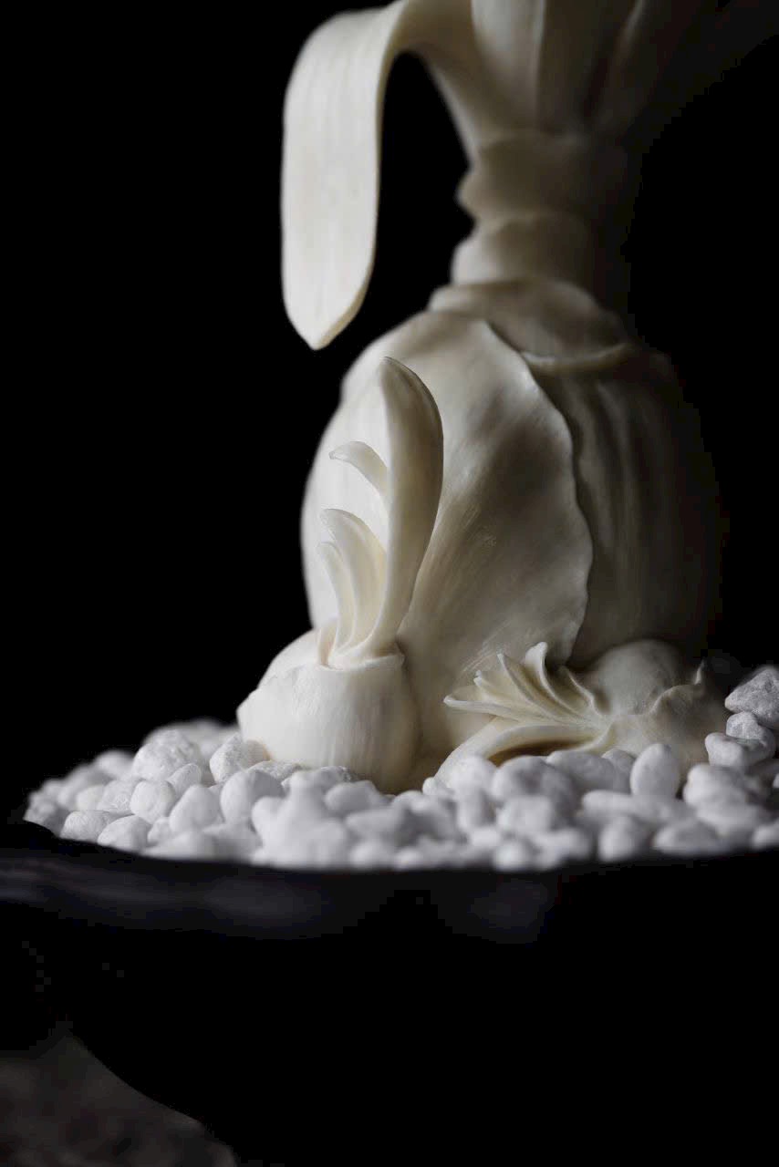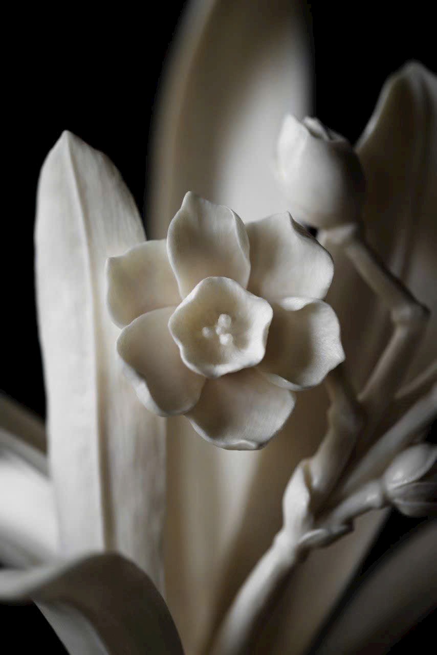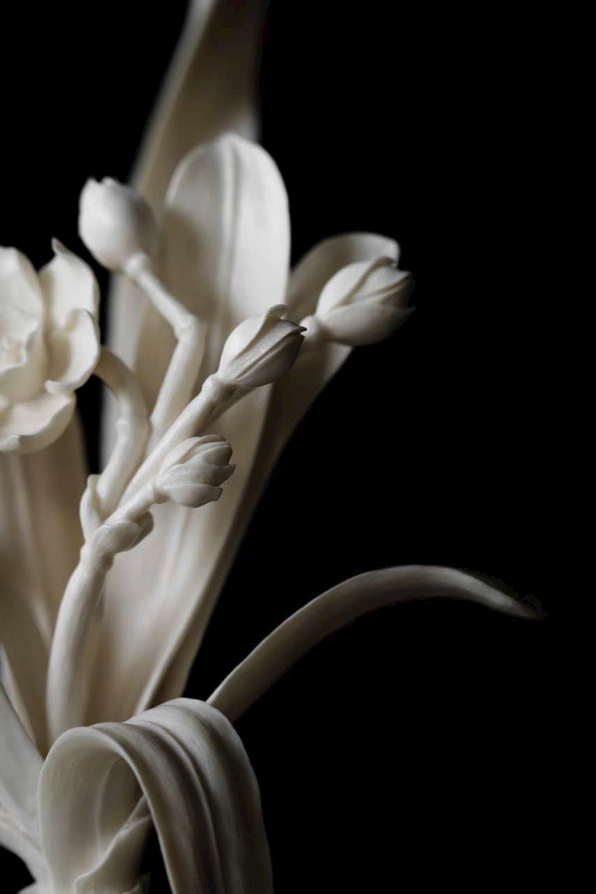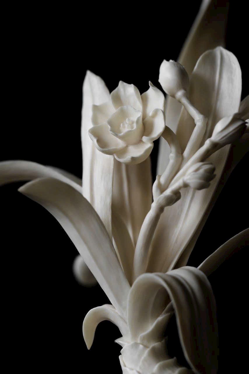 Chạm khắc tinh xảo hoa thủy tiên thanh tao, cánh bướm rung nhẹ đậu trên cánh ngọc, từng đường gân lá mảnh mai đều hiện rõ sống động.