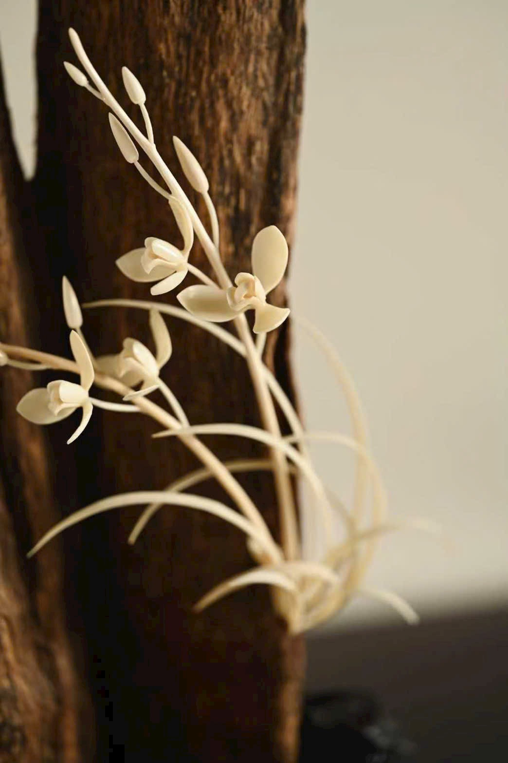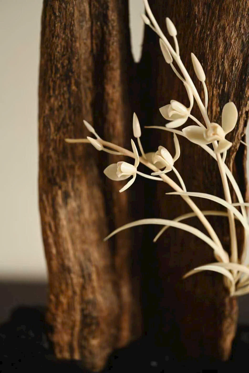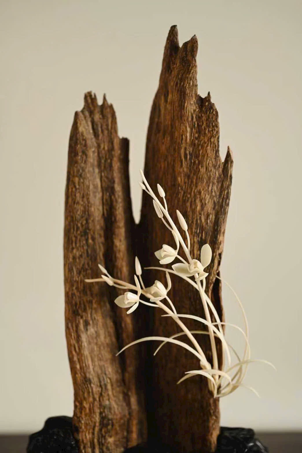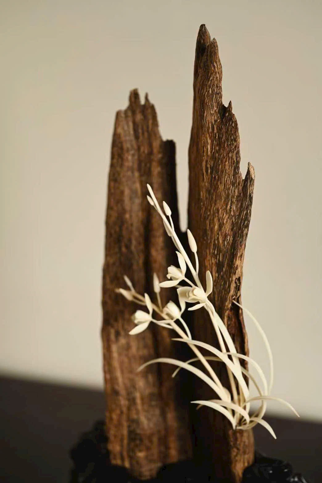 Chất liệu tự nhiên, đường vân và hình thái sống động như vách đá nguyên sinh gồ ghề kỳ thú. Trên đó điểm khắc đóa lan thanh nhã, cánh hoa mềm mại, lá lan vươn nở, đẹp mà không phô trương. Bày trên án thư, khí vị tao nhã bộc lộ trọn vẹn.