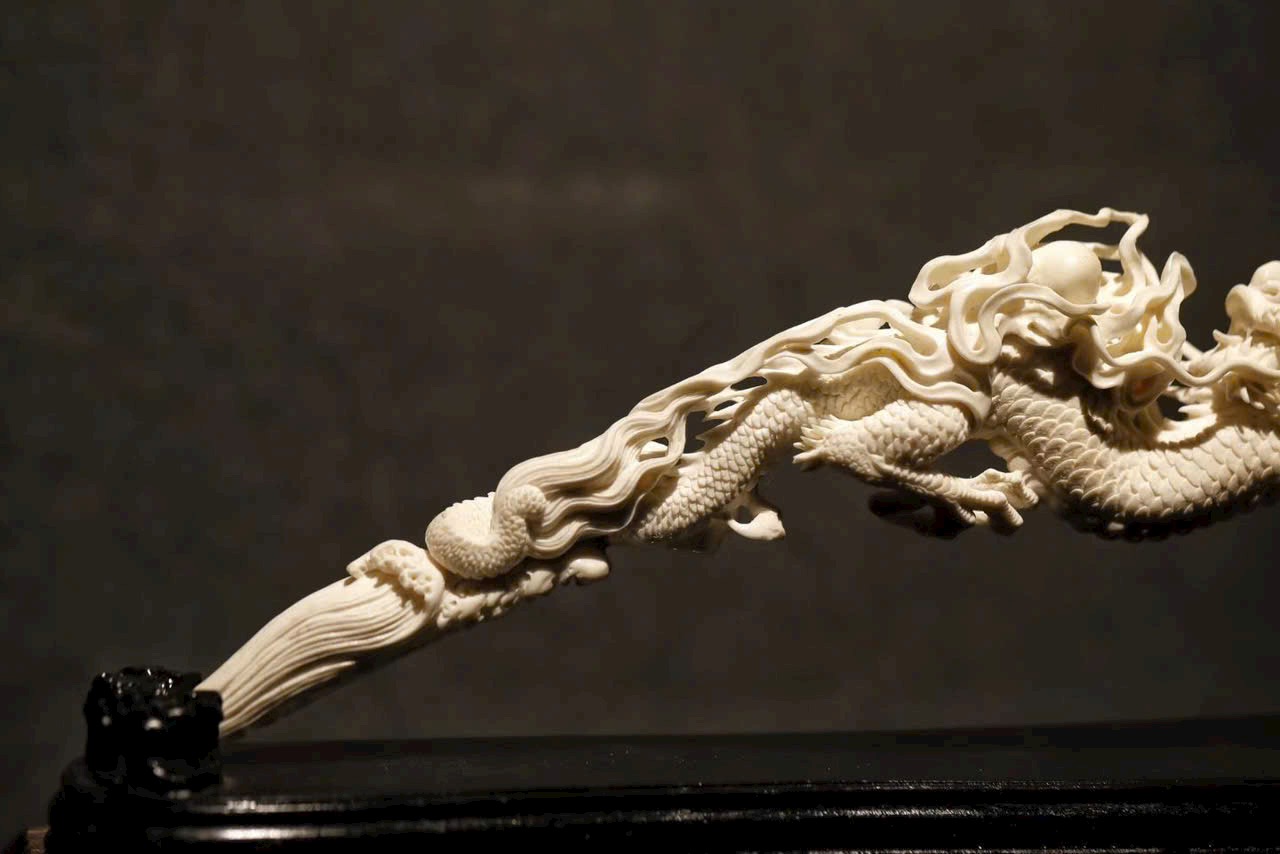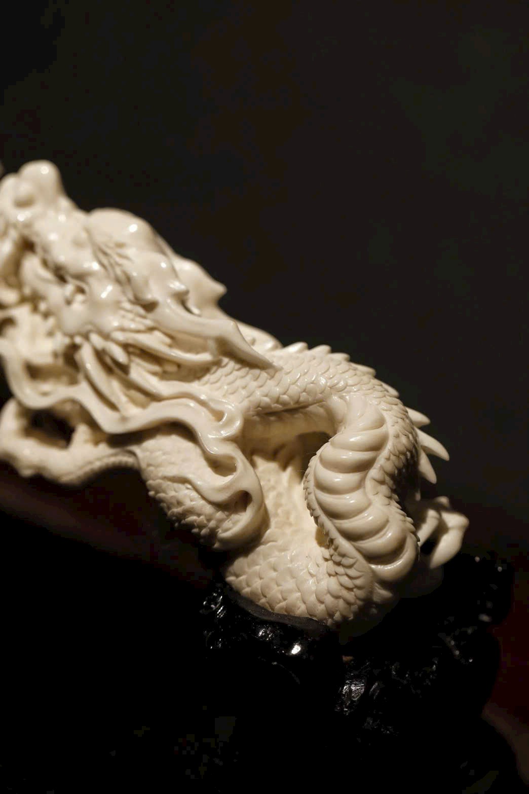 Tận dụng sự ôn nhuận của sừng hươu, khắc họa uy thần của rồng du ngoạn. Thân rồng khỏe khoắn tung bay, râu rồng linh động phất cao, ngoảnh đầu hí châu, khí vận hiên ngang, phô bày sự tinh xảo tuyệt mỹ của tay nghề điêu khắc. Bày nơi án thư, nạp phúc nghênh tường, càng làm nổi bật phong vận tao nhã của tàng phẩm.