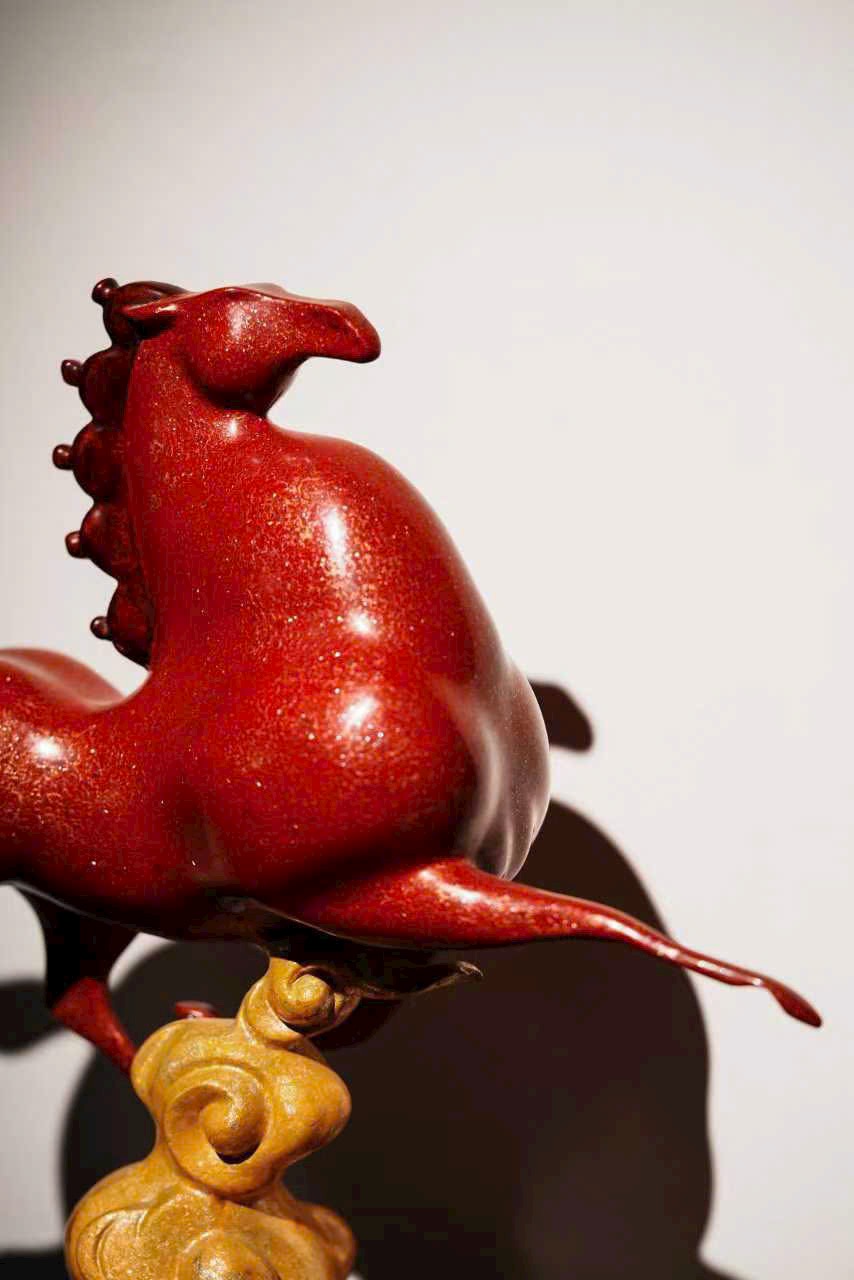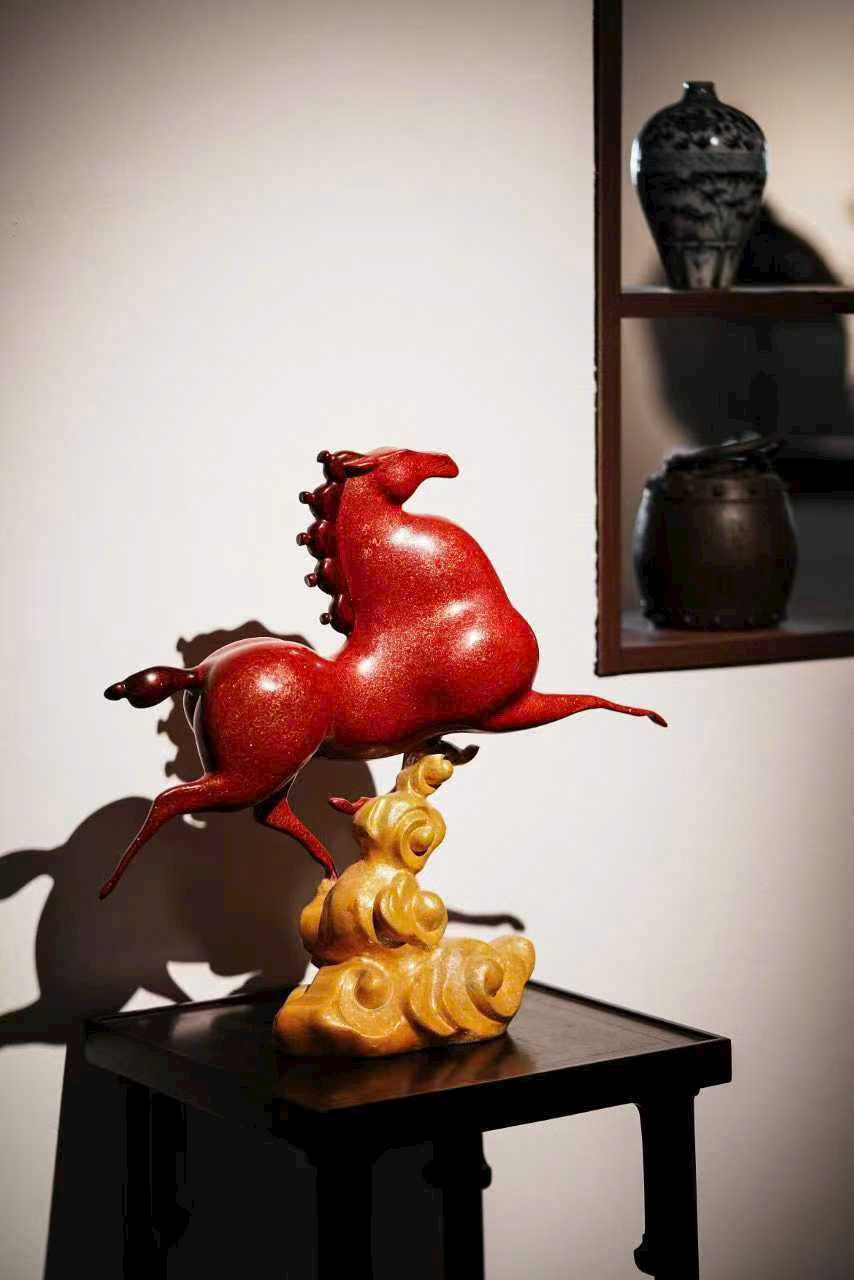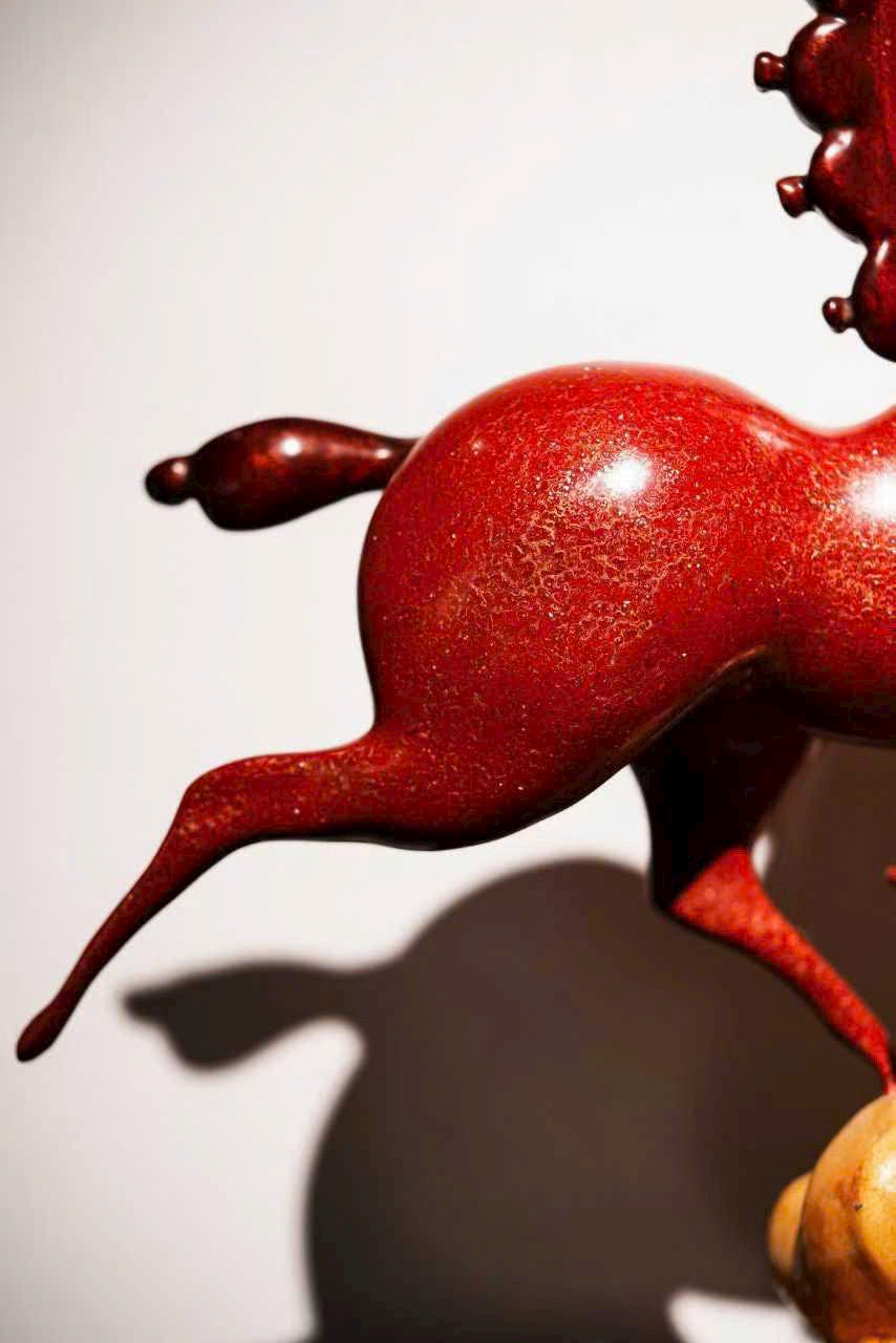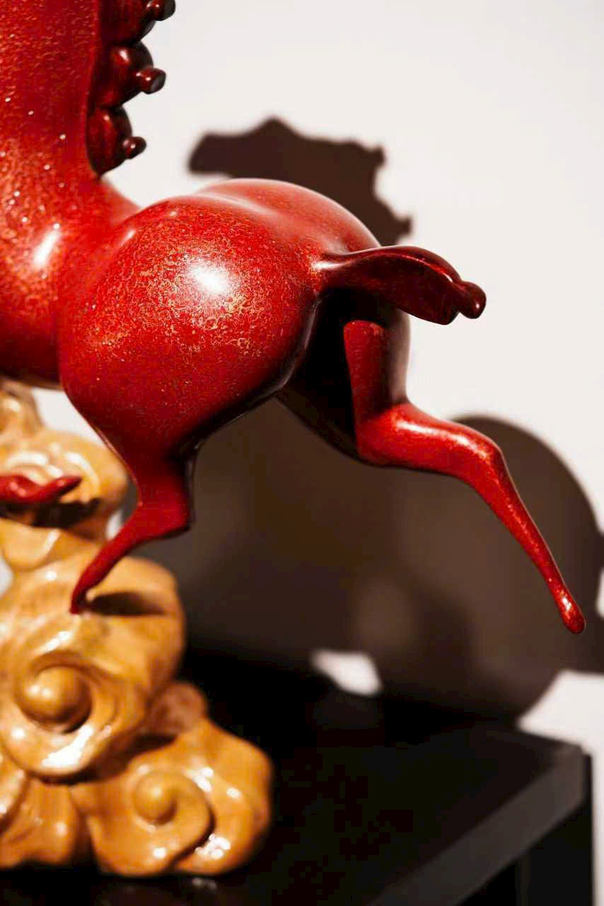 Cốt đồng vững chắc, phủ sơn chu sa rực như lửa chảy; tuấn mã tung vó đạp yến, khí thế bừng bừng. Bờm đuôi bay vút ánh kim dung hợp, thớ cơ cuộn nổi ẩn phong lôi; yên cương khảm xà cừ tỏa quang sắc cầu vồng.