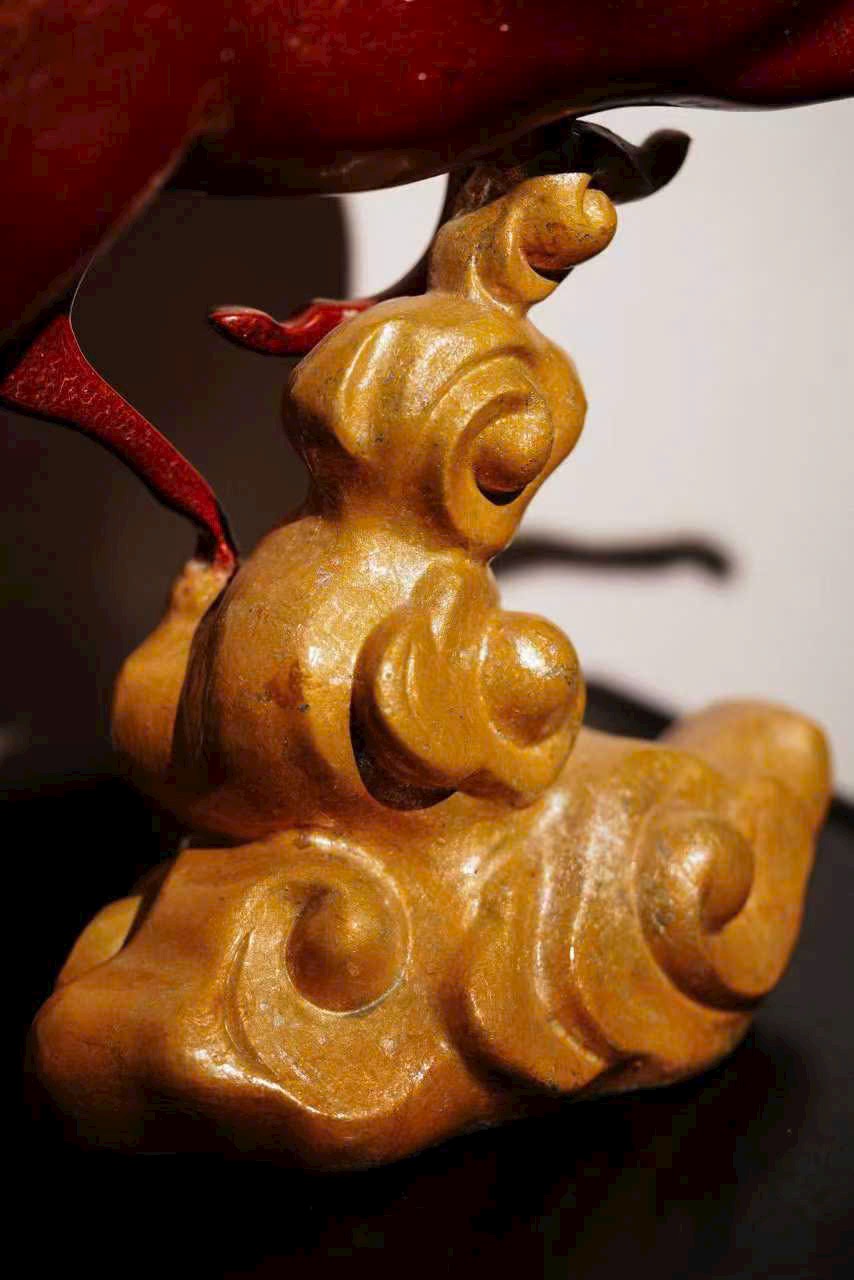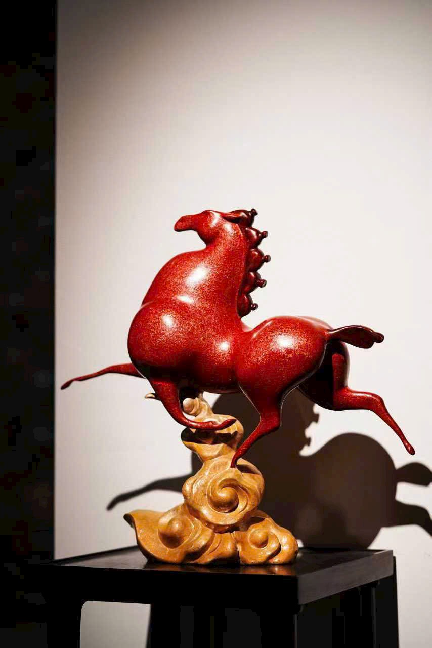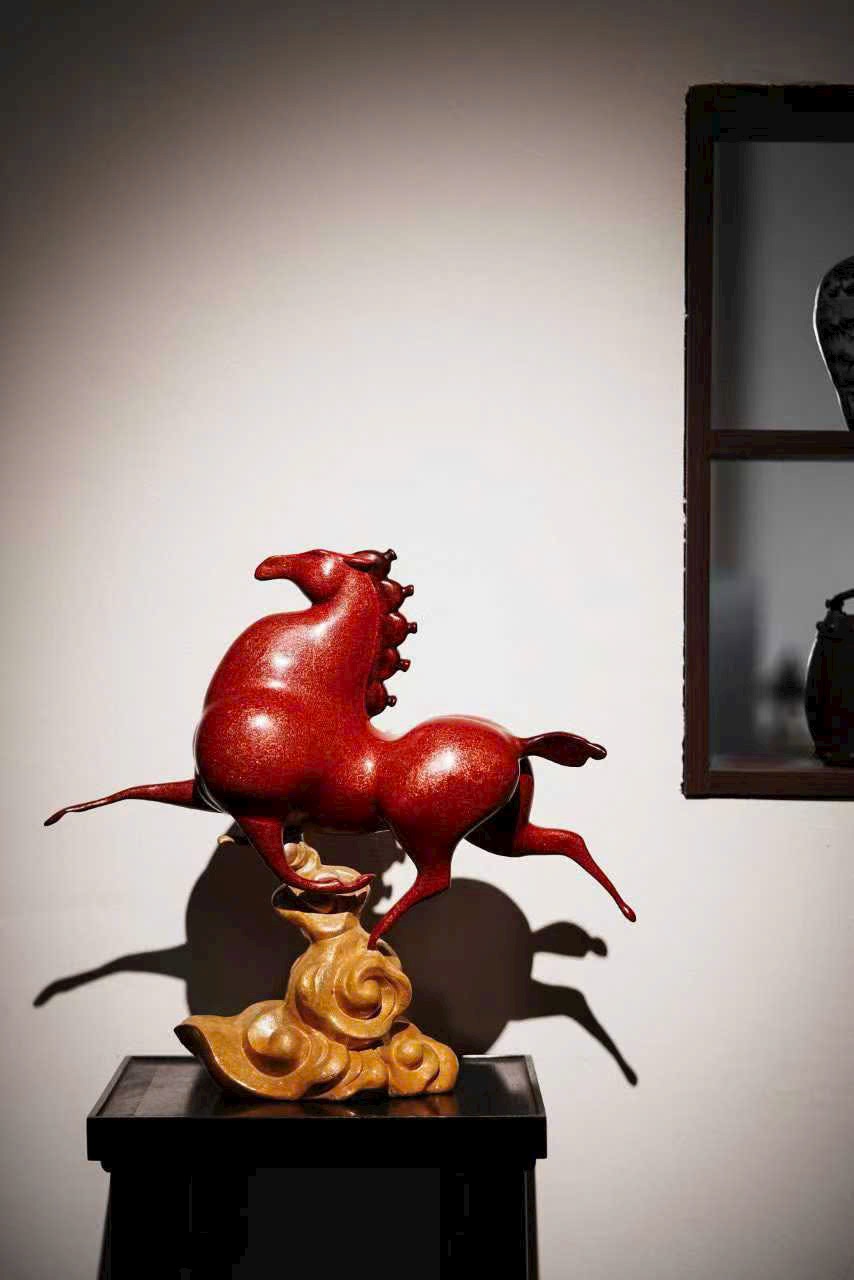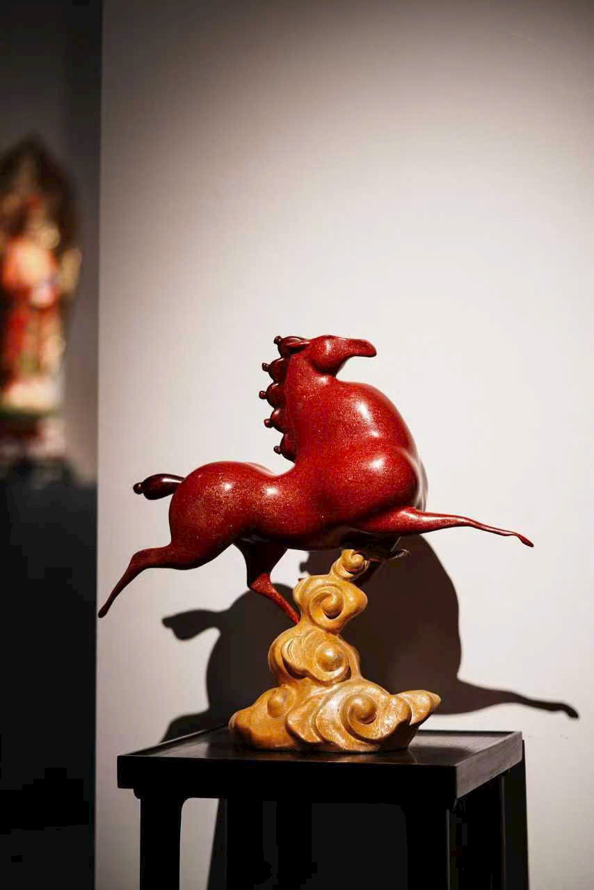 Cốt đồng vững chắc, phủ sơn chu sa rực như lửa chảy; tuấn mã tung vó đạp yến, khí thế bừng bừng. Bờm đuôi bay vút ánh kim dung hợp, thớ cơ cuộn nổi ẩn phong lôi; yên cương khảm xà cừ tỏa quang sắc cầu vồng.
