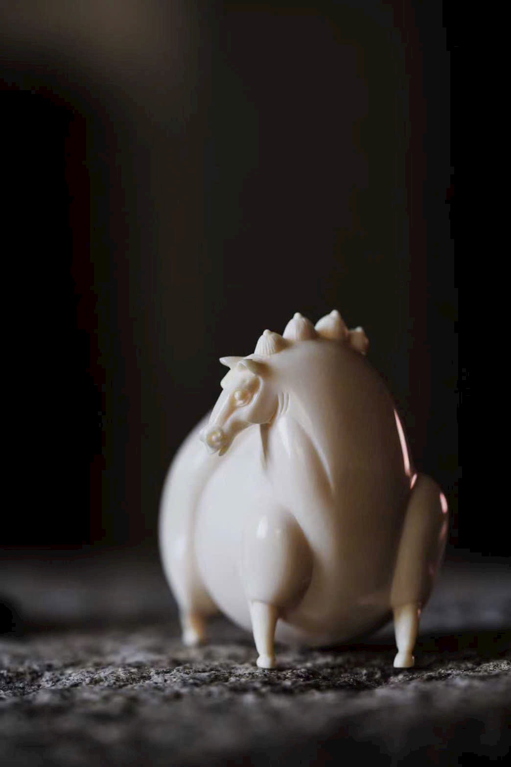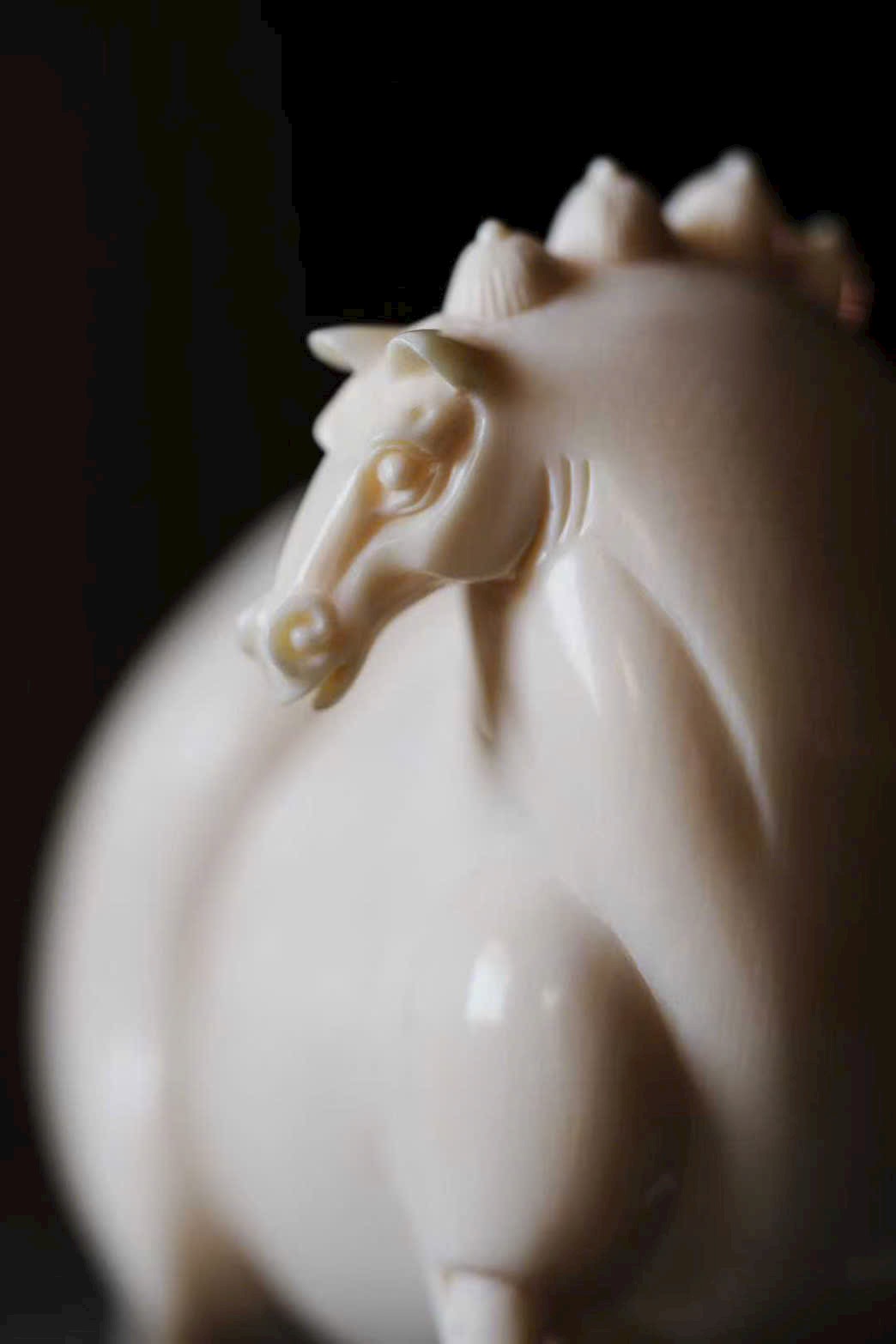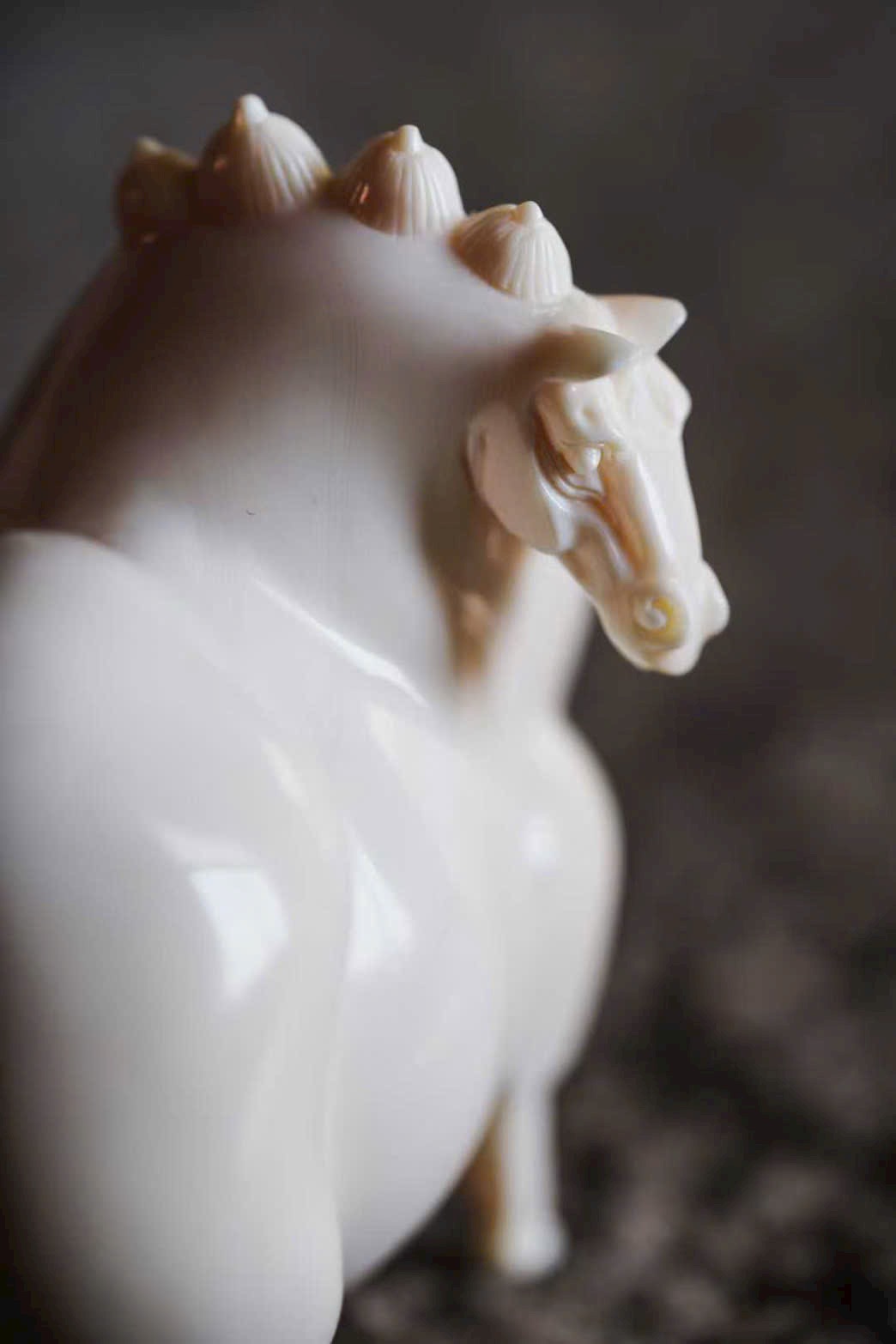 Màu n.gà trắng mịn như mỡ đông, tượng ngựa được tạc tròn đầy đặn, dáng vẻ phúc hậu. Cổ cong như vầng trăng tròn, bốn vó tròn trịa như đạp mây, đuôi bờm cuộn xoăn tạo nét đáng yêu. Có thể đặt trong lòng bàn tay để thưởng chơi, chạm vào ấm tay, mang khí vận Đại Đường, tượng trưng cho tháng năm yên ổn, bình an vững bền.