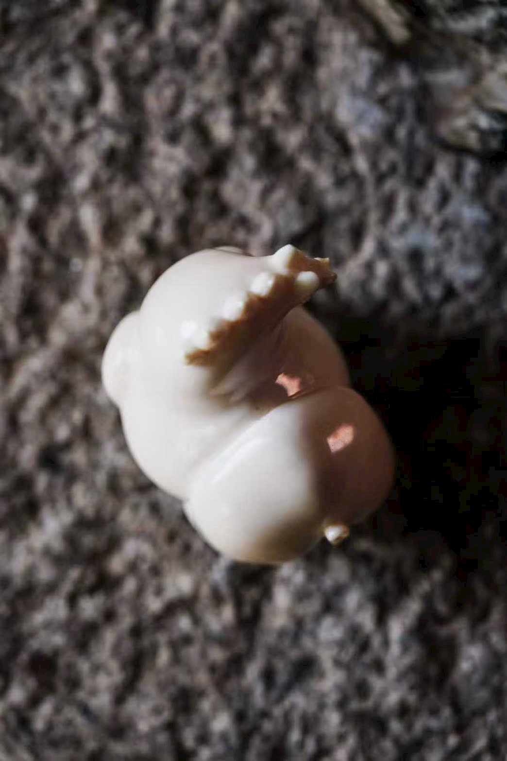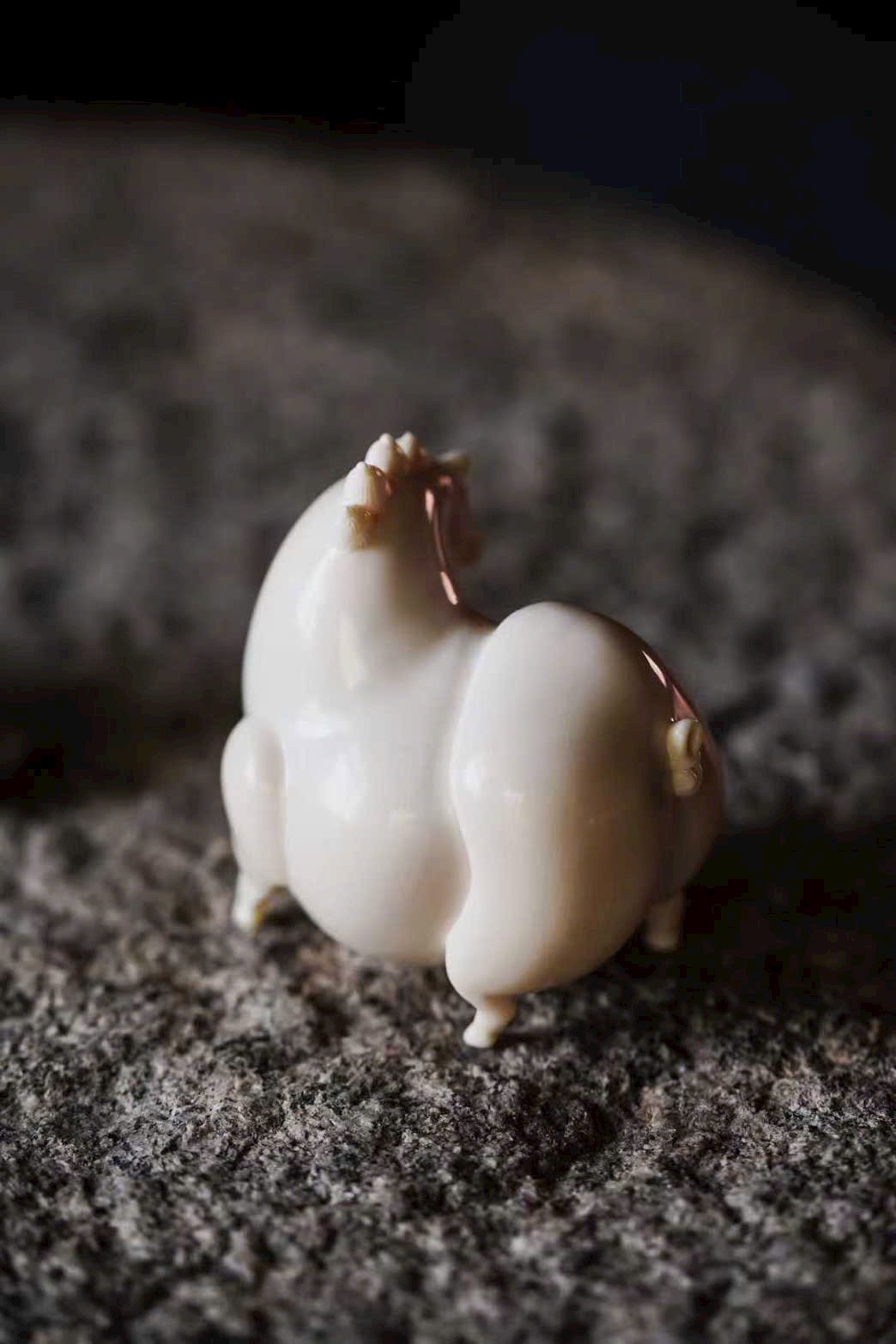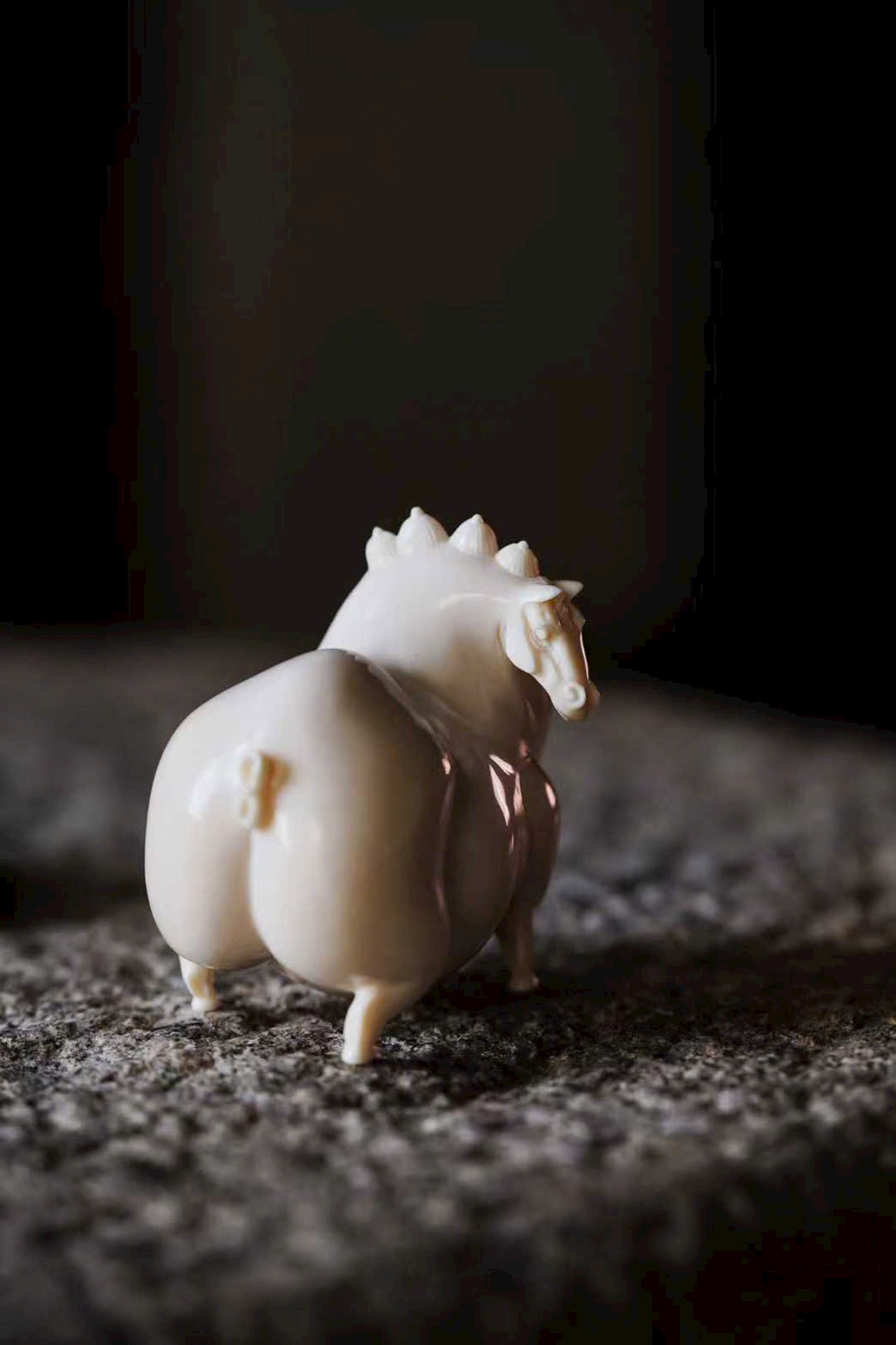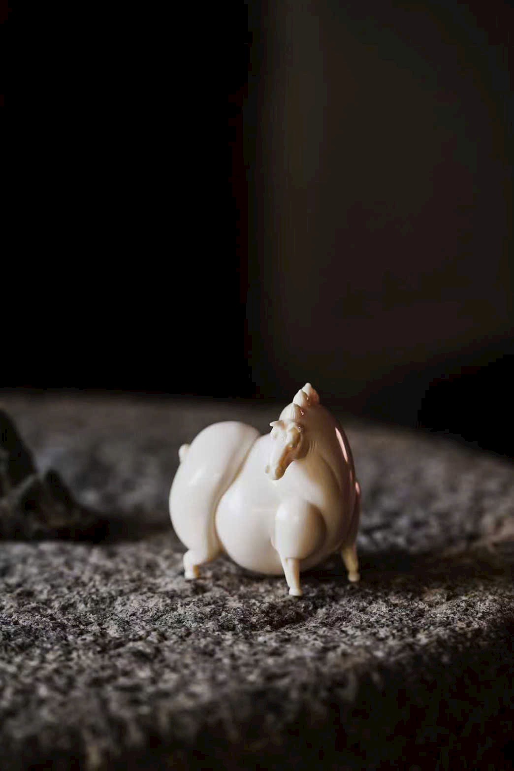 Màu n.gà trắng mịn như mỡ đông, tượng ngựa được tạc tròn đầy đặn, dáng vẻ phúc hậu. Cổ cong như vầng trăng tròn, bốn vó tròn trịa như đạp mây, đuôi bờm cuộn xoăn tạo nét đáng yêu. Có thể đặt trong lòng bàn tay để thưởng chơi, chạm vào ấm tay, mang khí vận Đại Đường, tượng trưng cho tháng năm yên ổn, bình an vững bền.