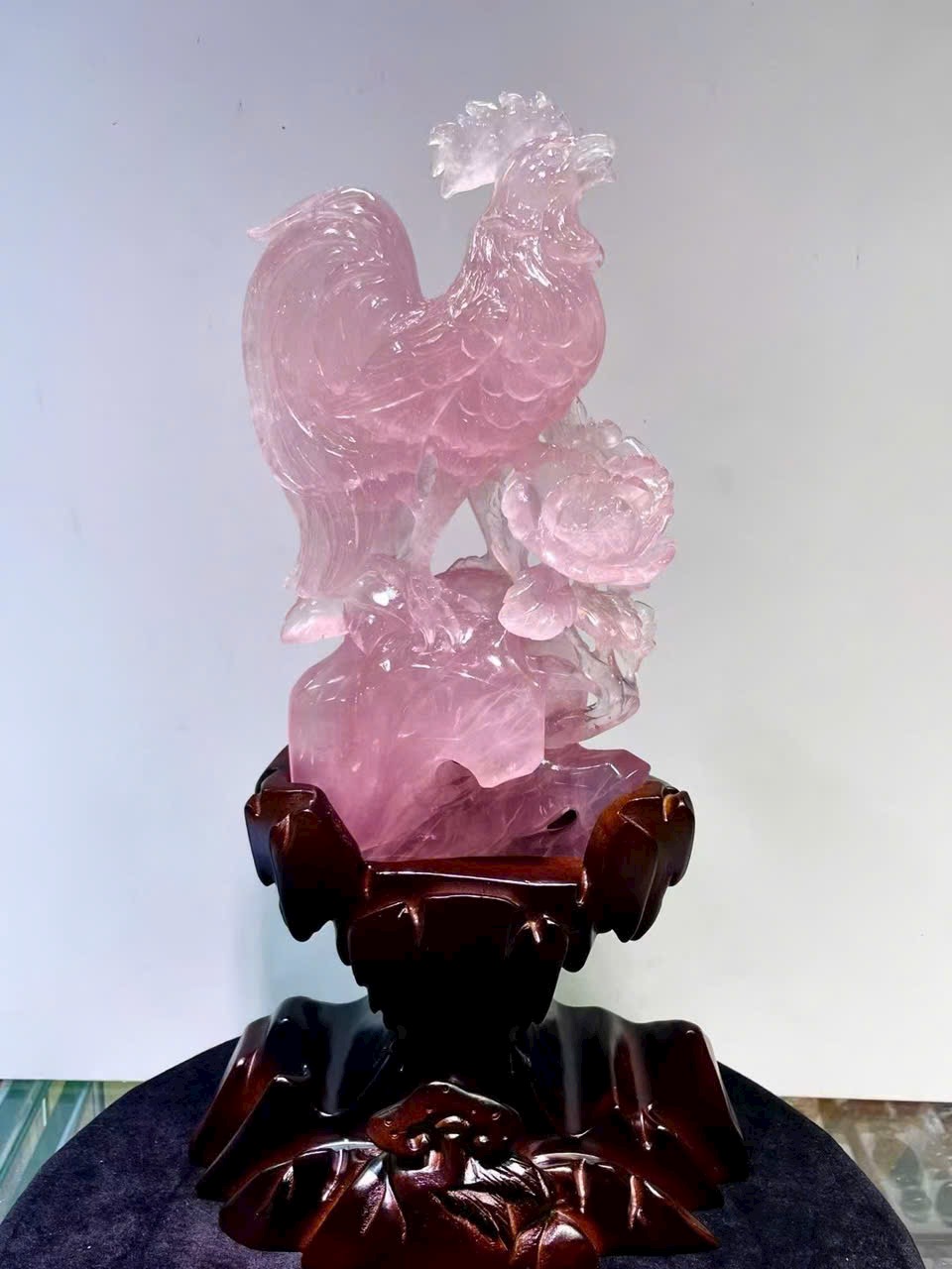 Tượng gà trống được chạm khắc khéo léo từ thạch anh hồng băng chủng thiên nhiên, tinh thể đẹp, điêu khắc 3D tinh xảo, tạo hình sinh động.