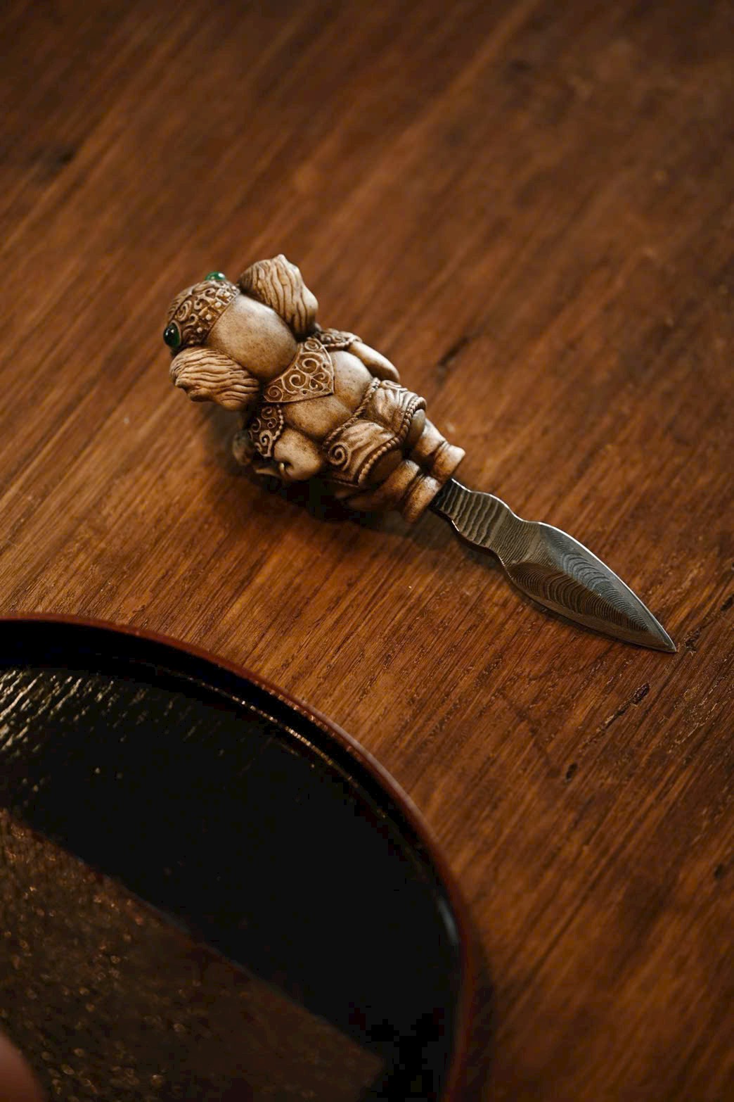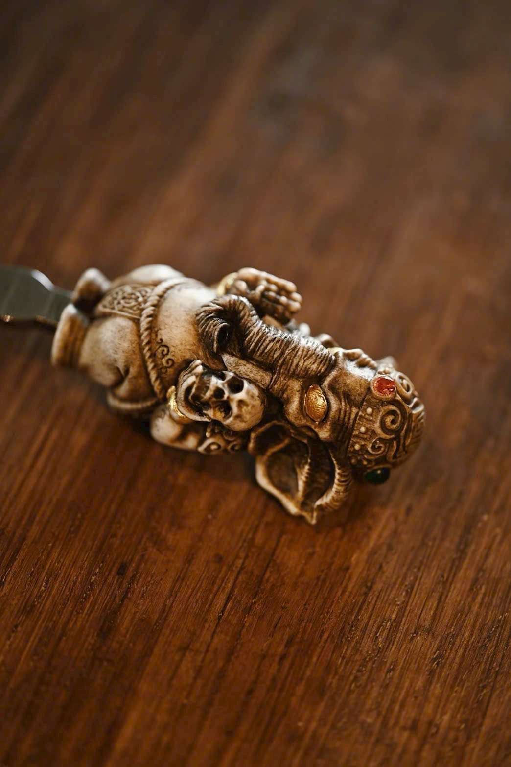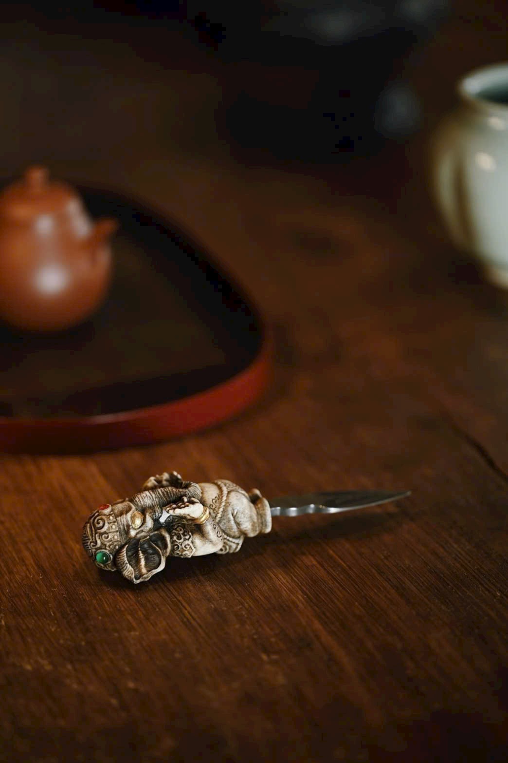 Tượng thần voi được chạm khắc với thần thái trang nghiêm, ánh mắt toát lên vẻ uy nghi lẫm liệt, dáng dấp đường hoàng tao nhã. Bày nơi bàn trà vừa để thưởng lãm vừa tiện dụng, biểu trưng cho trí tuệ, tài lộc và cát tường.