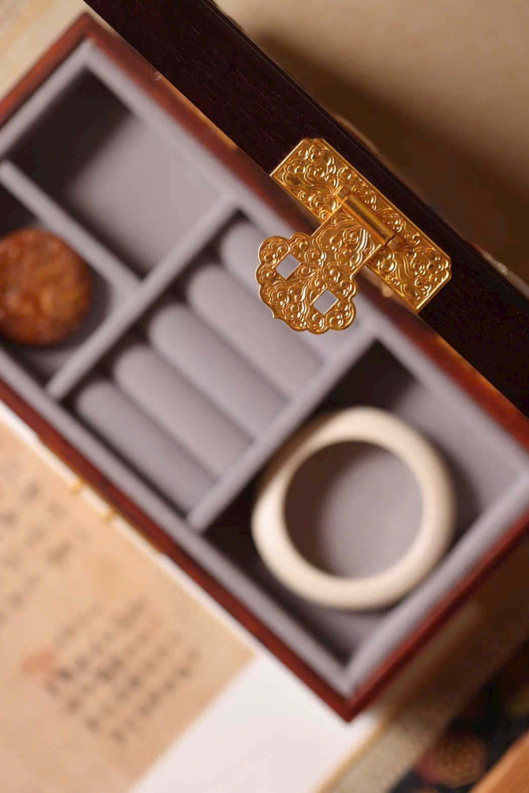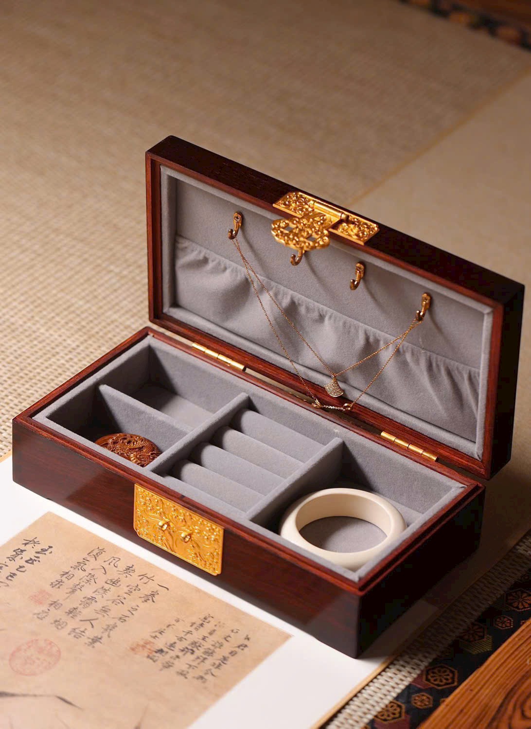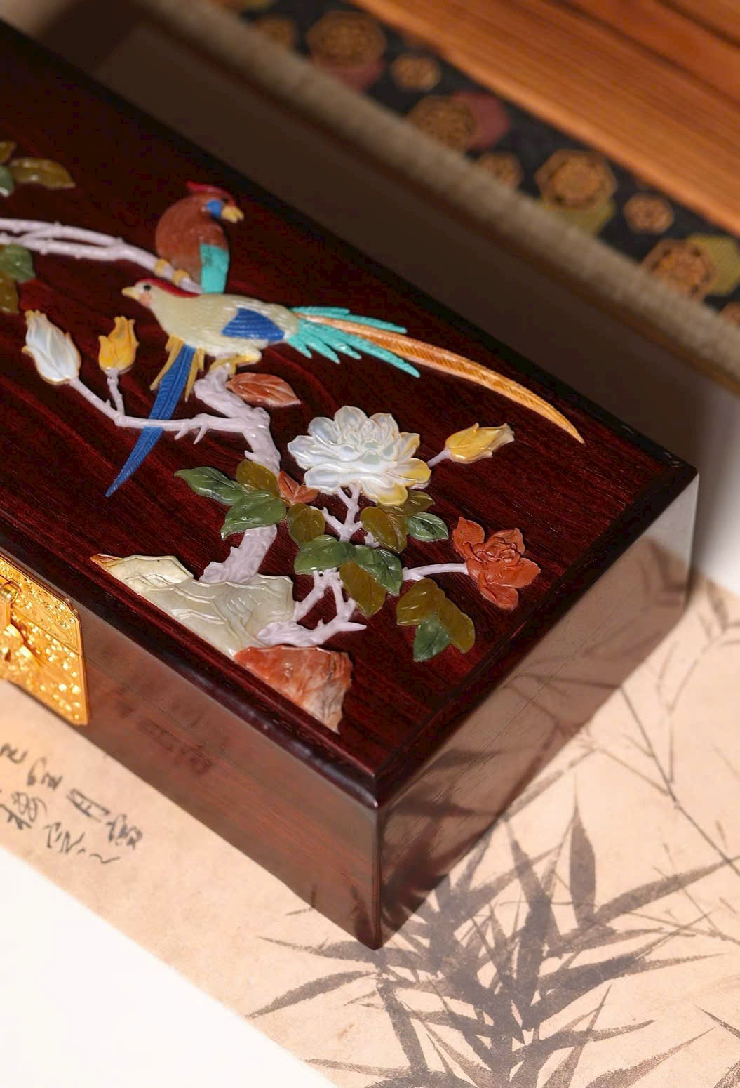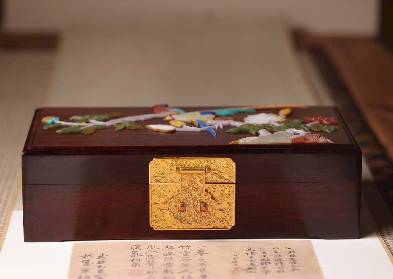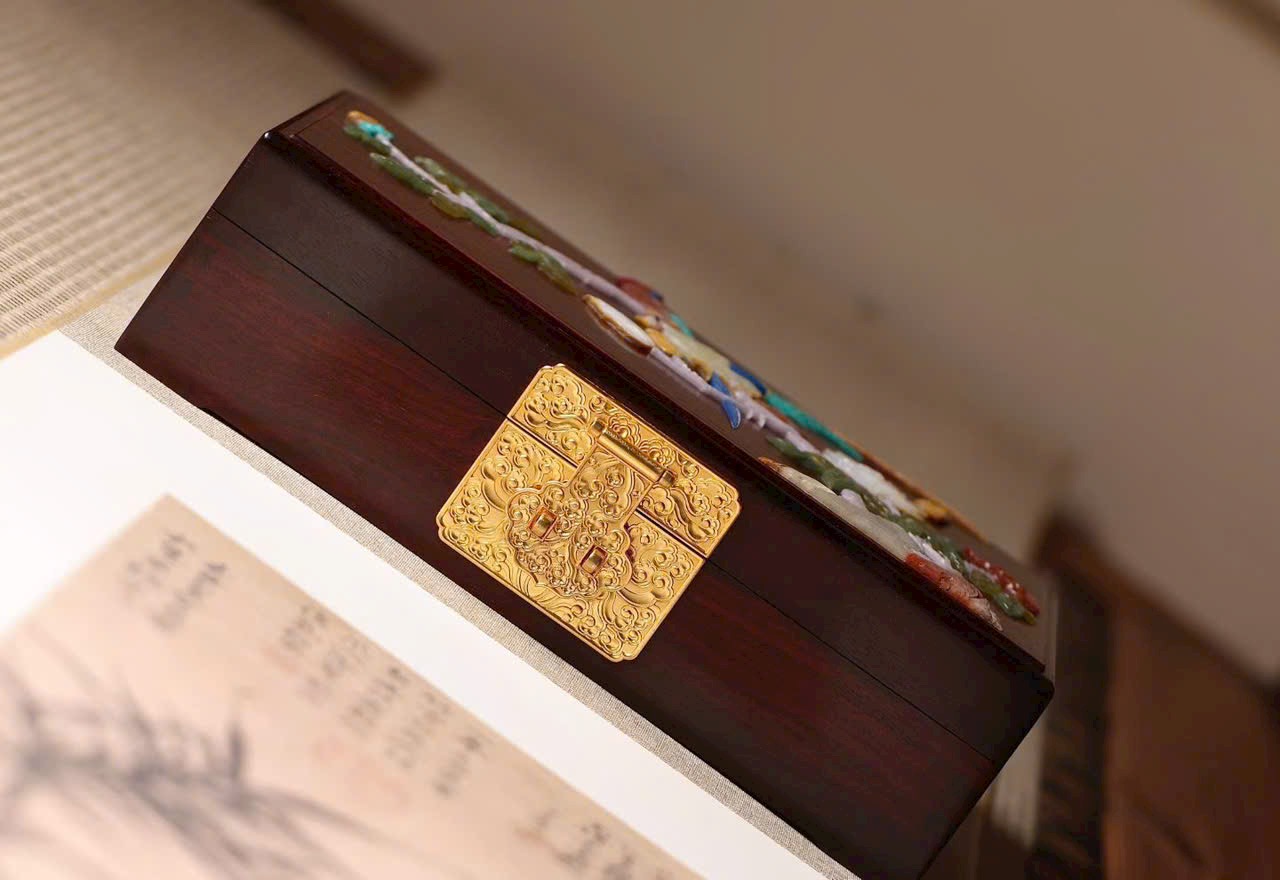 Tiểu diệp tử đàn × bách bảo khảm “Gấm hoa thêm sắc” – hộp trang sức dát vàng.