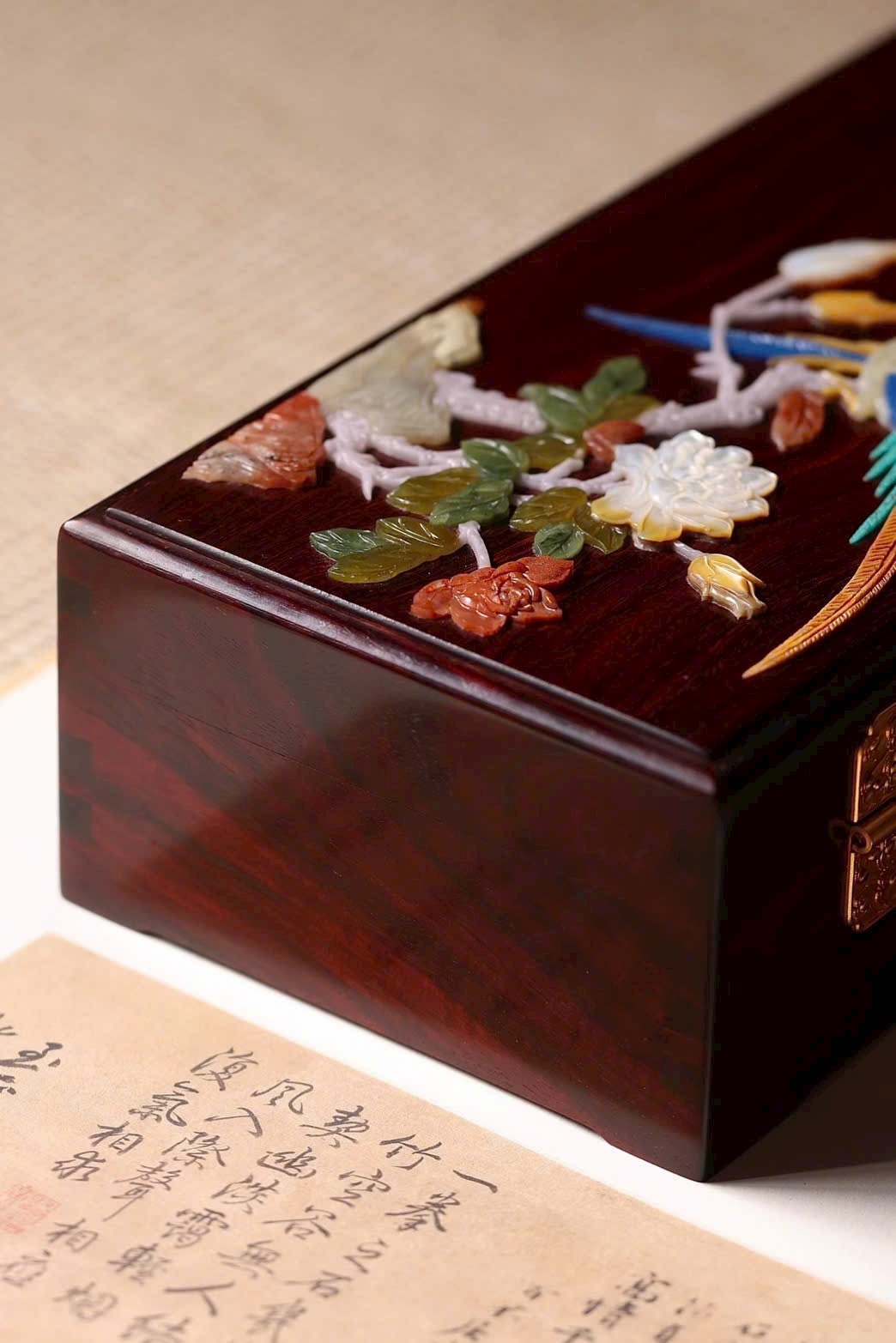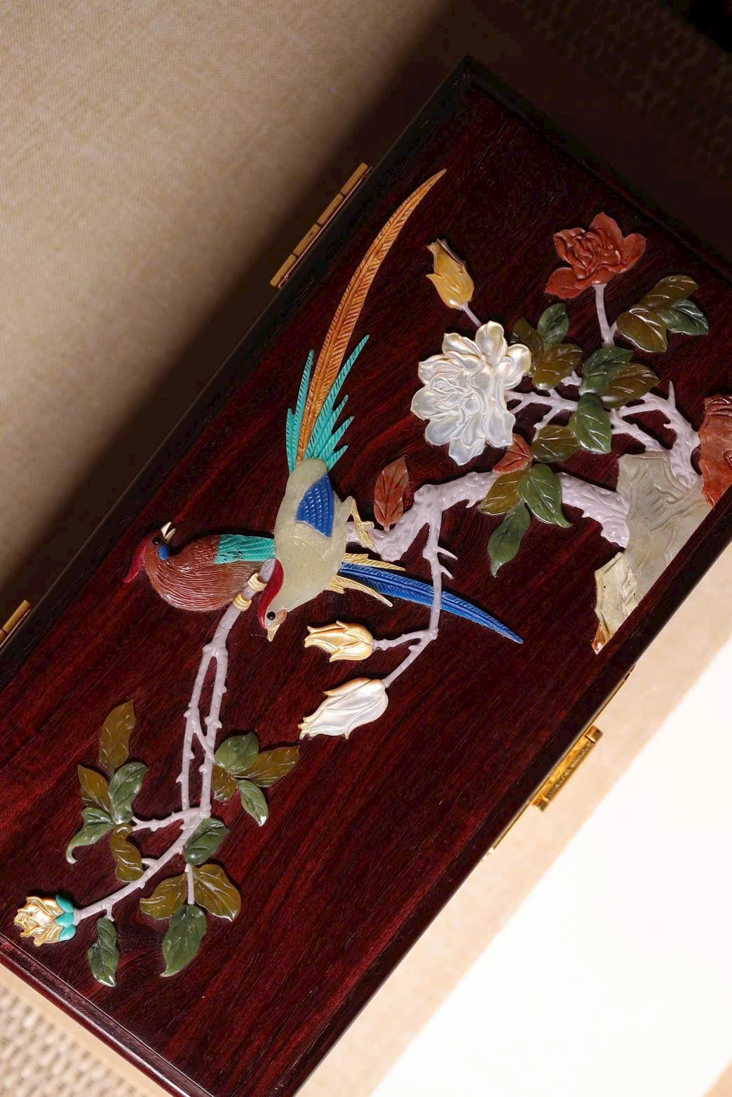 Chế tác từ tử đàn già, kết cấu mộng – thớ tinh xảo. Mặt hộp ứng dụng kỹ thuật bách bảo khảm phong cách cung đình, hoa nở rực rỡ, sinh động giàu sức sống, mang ý nghĩa cát tường. Đặt bàn tựa một bức cảnh, dùng cất giữ trang sức – đồ quý, thích hợp làm quà cưới/hồi môn, vừa thưởng vừa dùng đều đẹp.