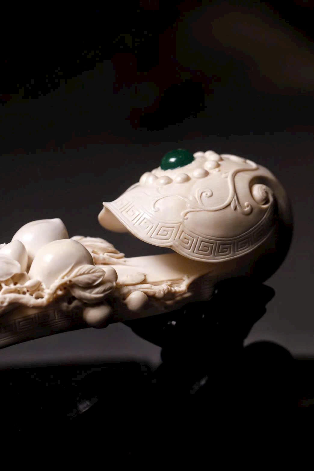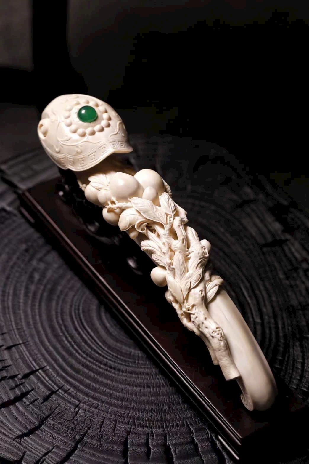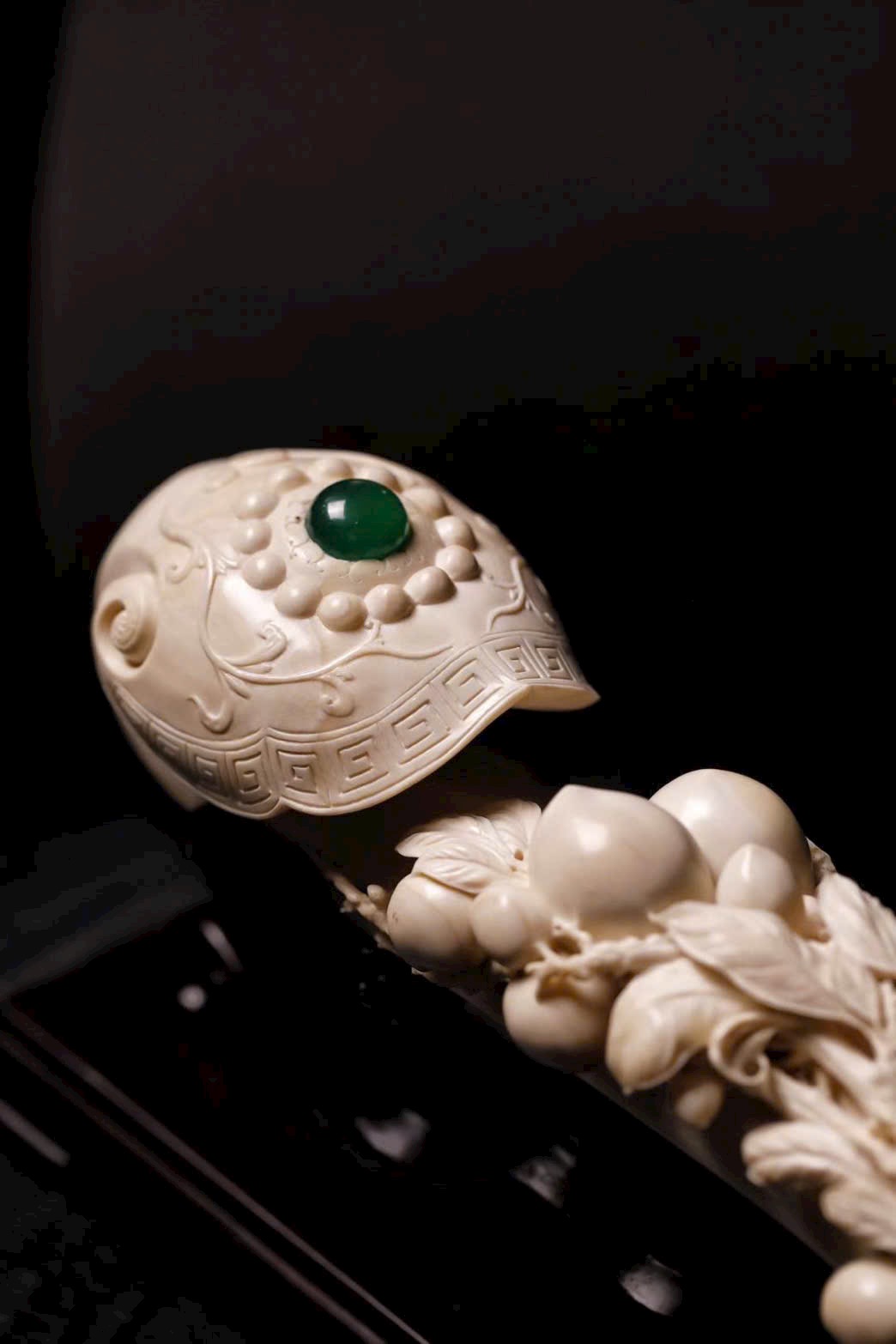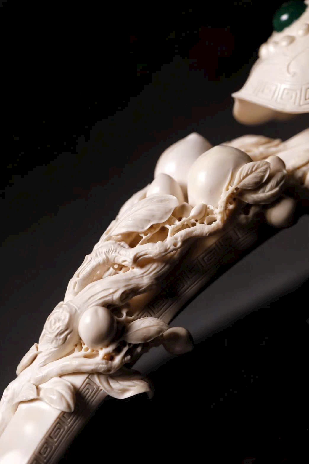Được chế tác nguyên khối từ n.gà voi ma mút. Đầu chạm khảm viên ngọc bích tròn, toàn thân tinh chạm hình đào thọ, cành lá uốn lượn sinh động, hàm ý phúc thọ miên trường.