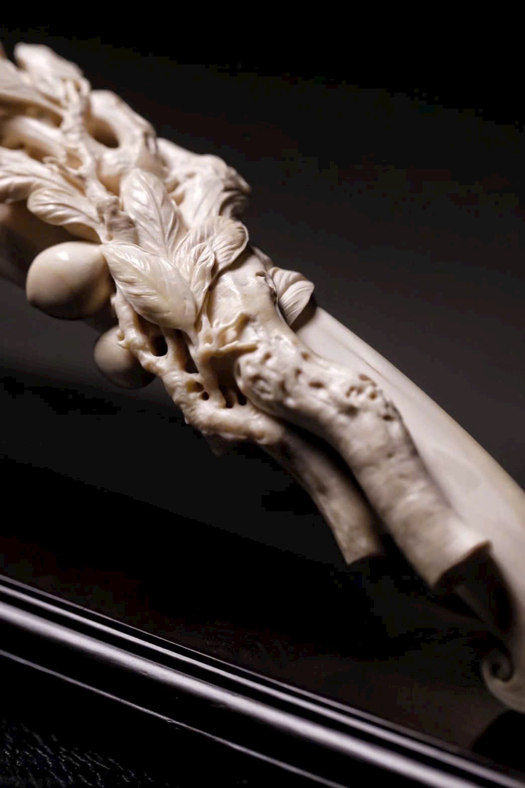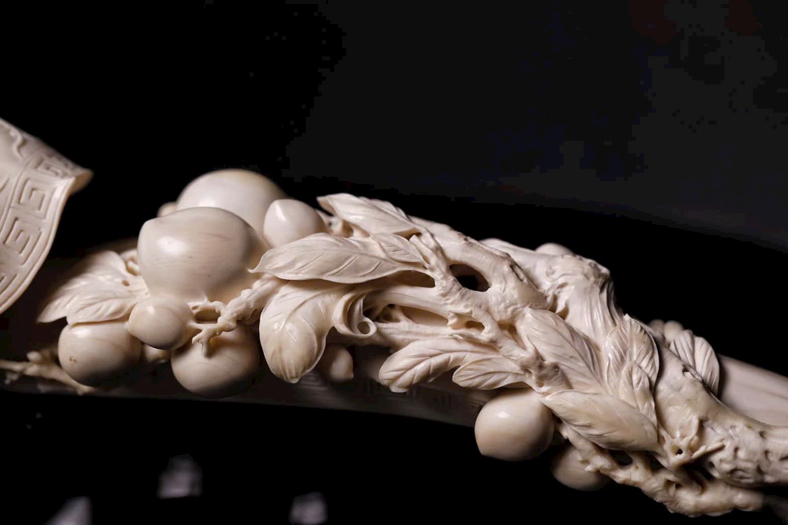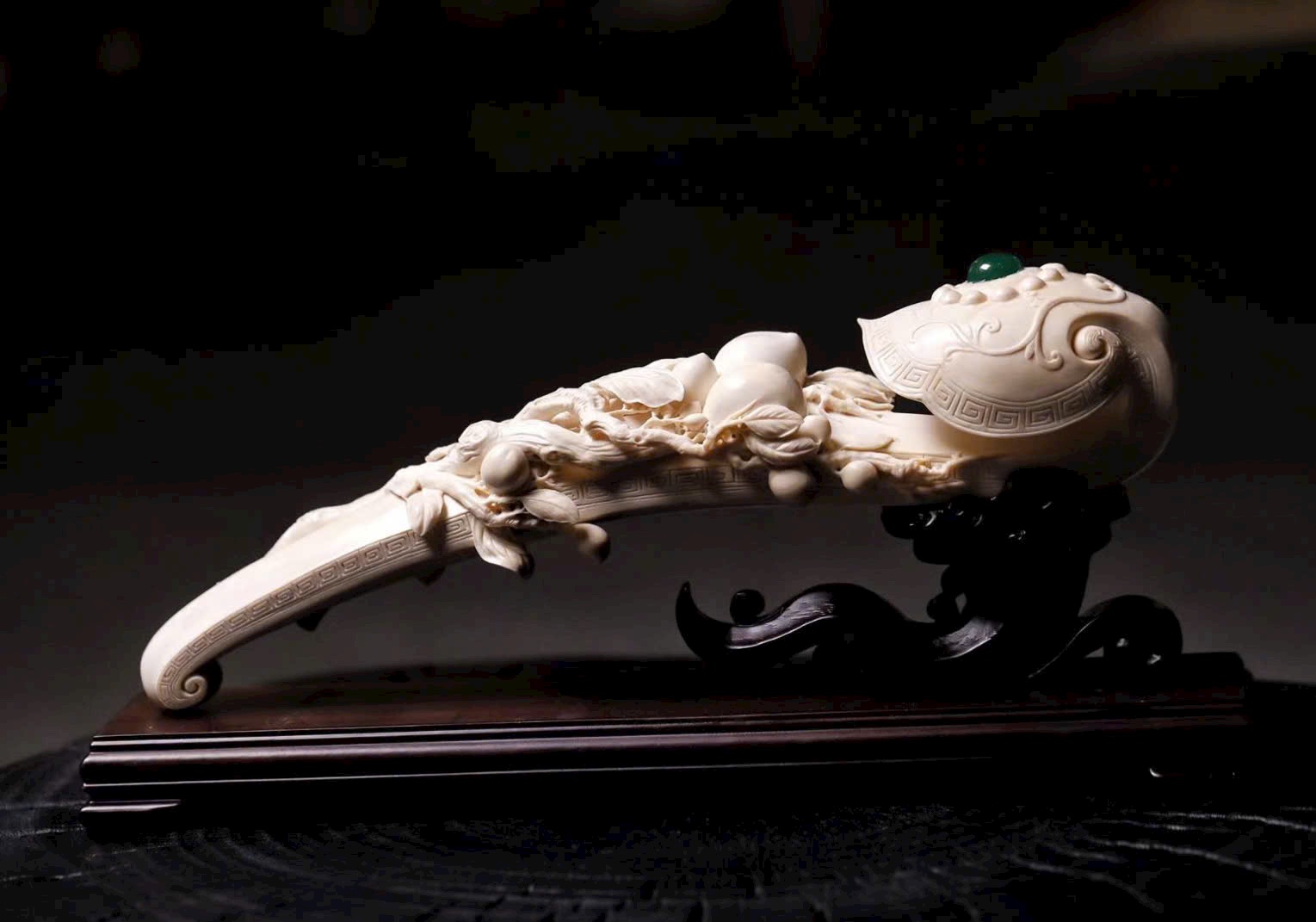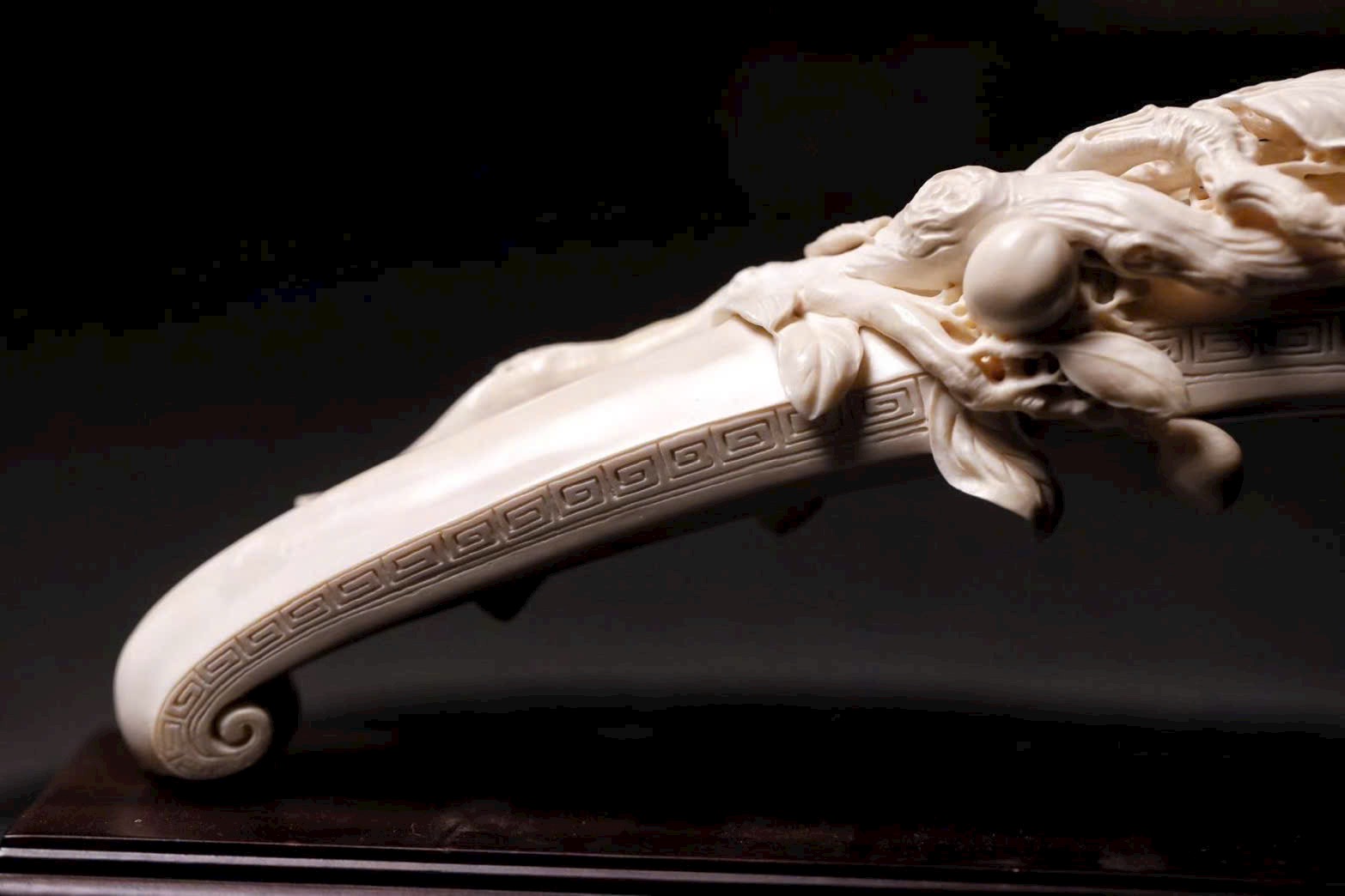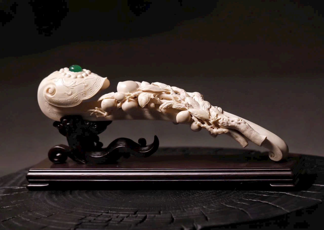 Được chế tác nguyên khối từ n.gà voi ma mút. Đầu chạm khảm viên ngọc bích tròn, toàn thân tinh chạm hình đào thọ, cành lá uốn lượn sinh động, hàm ý phúc thọ miên trường.