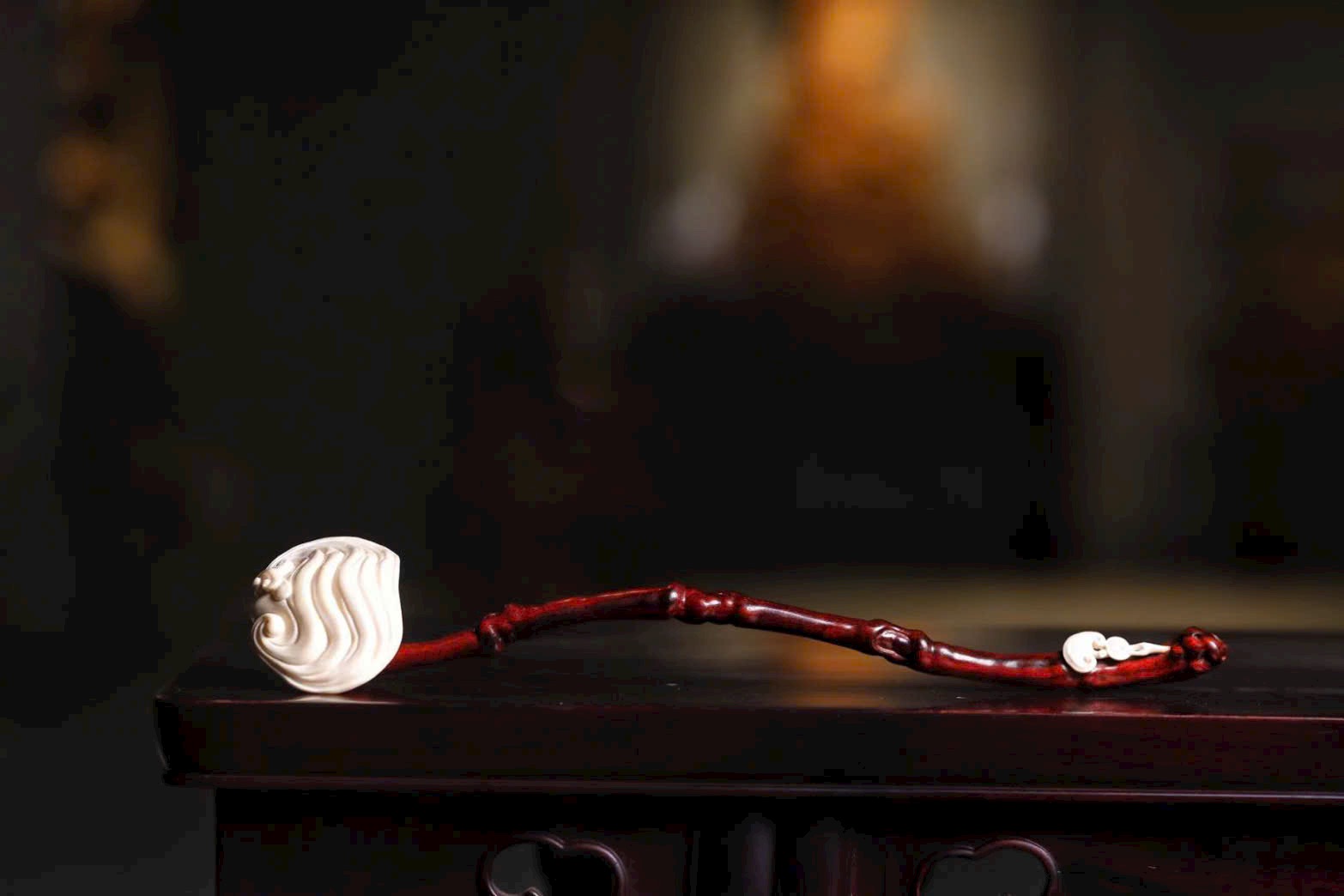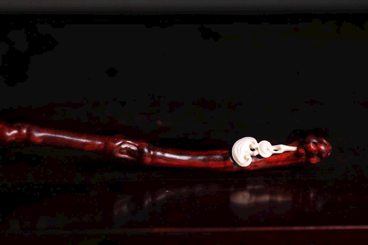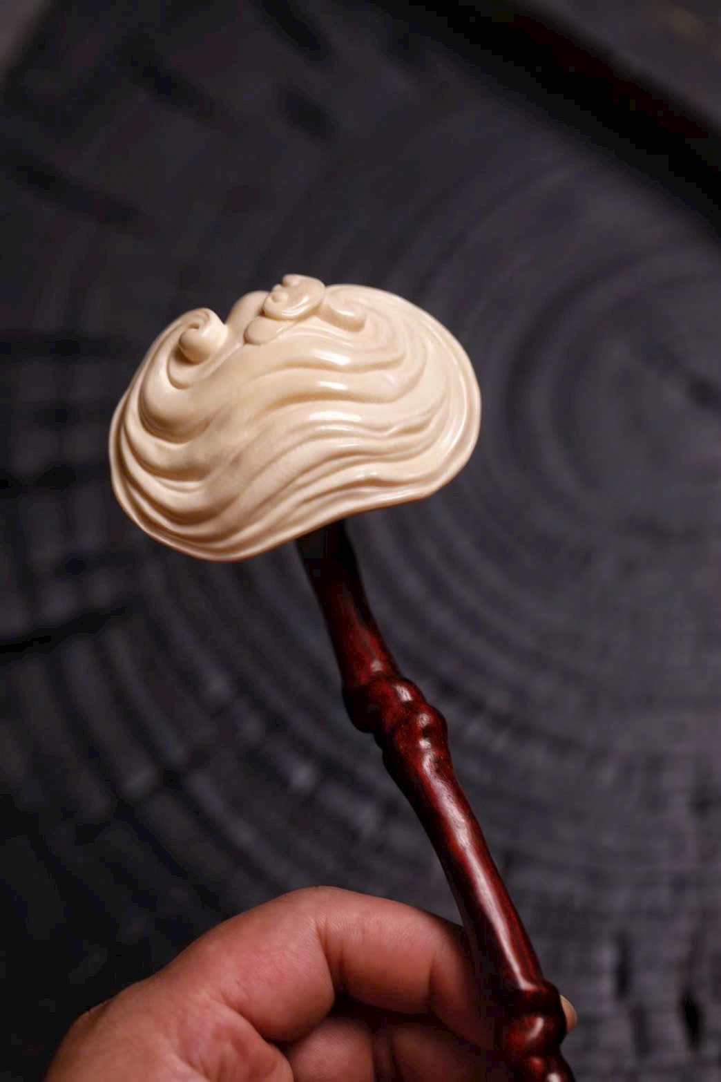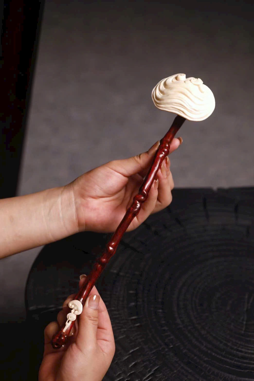 Cán làm từ gỗ tử đàn, gắn đầu ng.à ma mút chạm hình linh chi, đường vân tầng lớp như sóng nước, linh khí sinh động. “Linh chi” tượng trưng cho trường thọ cát tường, “như ý” gửi gắm thuận lợi an khang. Đặt nơi án thư, cầm trong tay liền thu trọn ý vị may mắn thanh nhã.