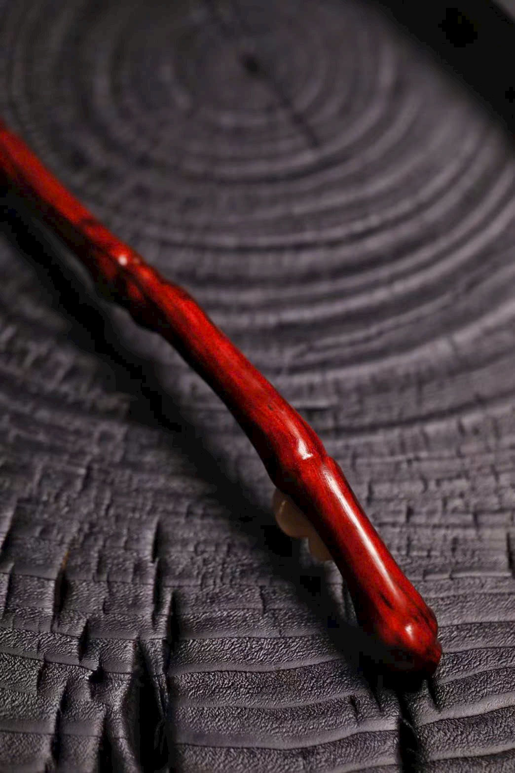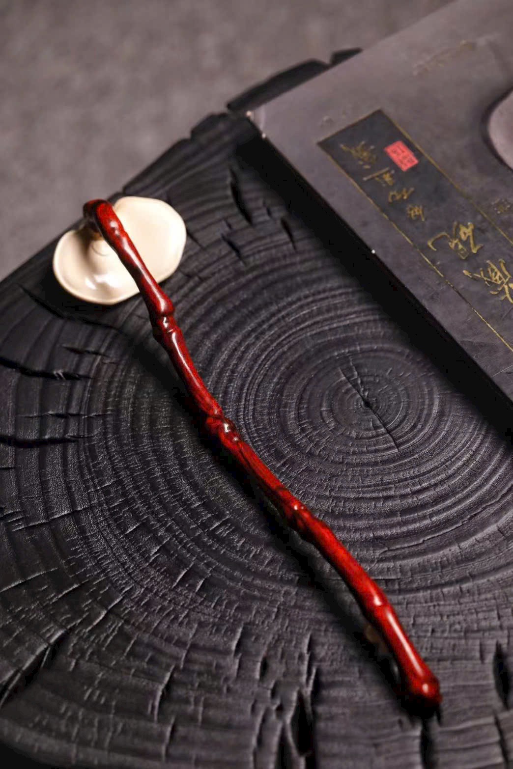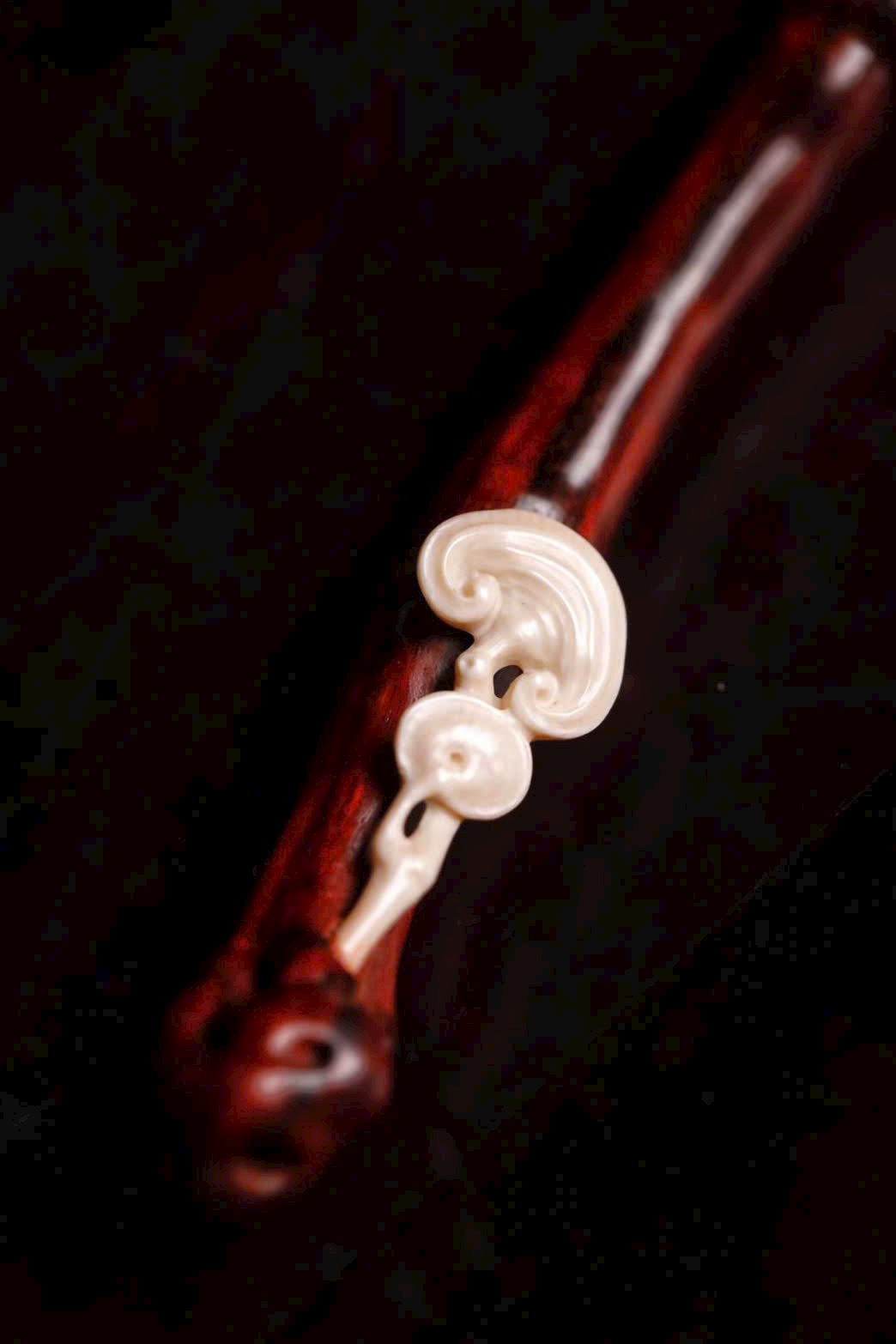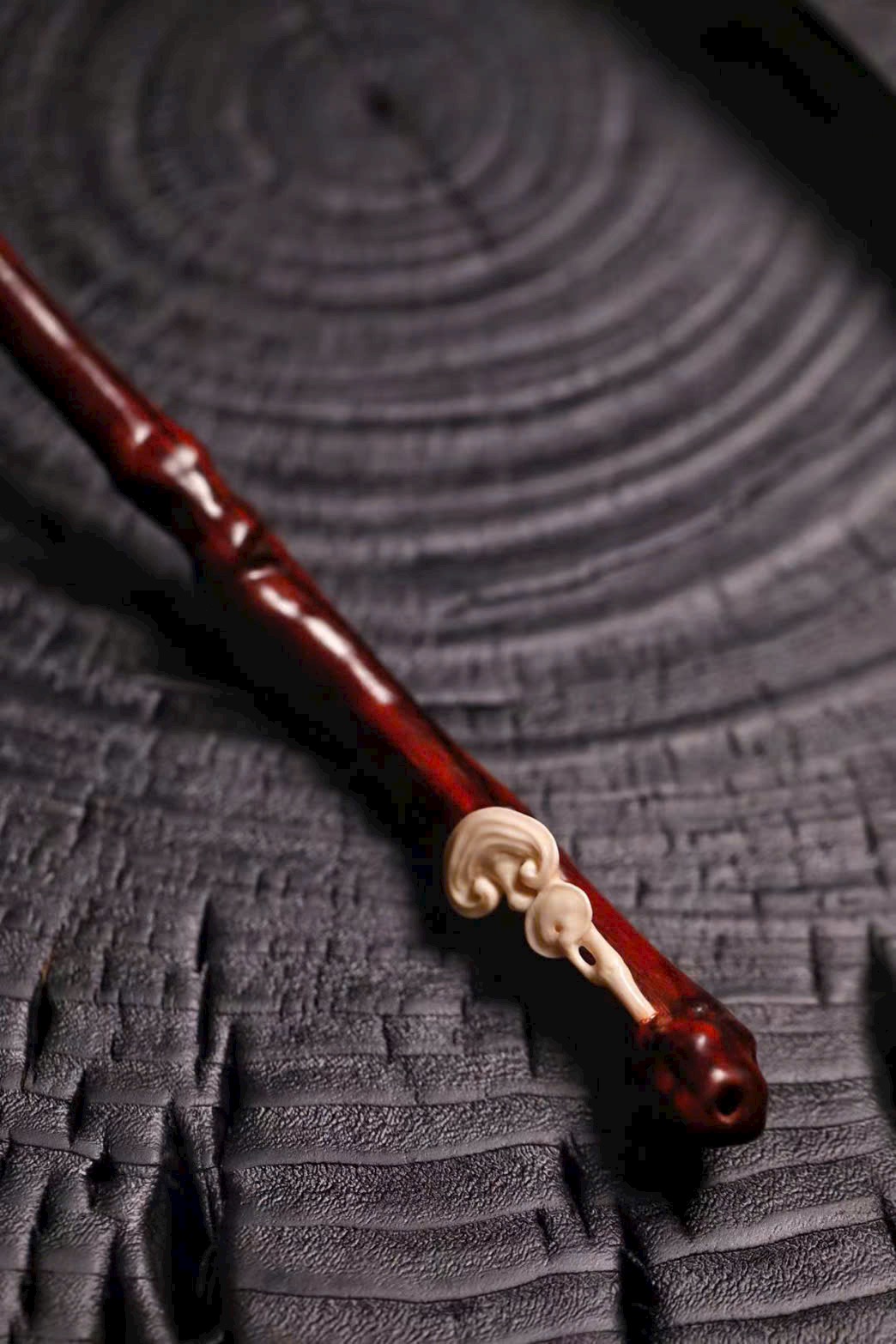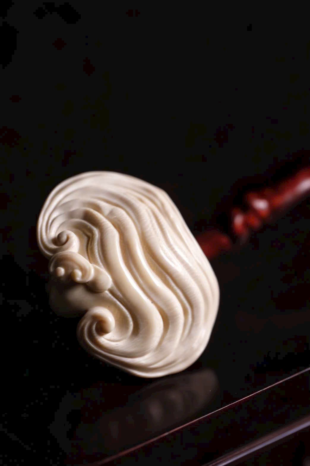 Cán làm từ gỗ tử đàn, gắn đầu ng.à ma mút chạm hình linh chi, đường vân tầng lớp như sóng nước, linh khí sinh động. “Linh chi” tượng trưng cho trường thọ cát tường, “như ý” gửi gắm thuận lợi an khang. Đặt nơi án thư, cầm trong tay liền thu trọn ý vị may mắn thanh nhã.
