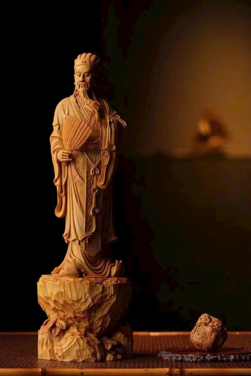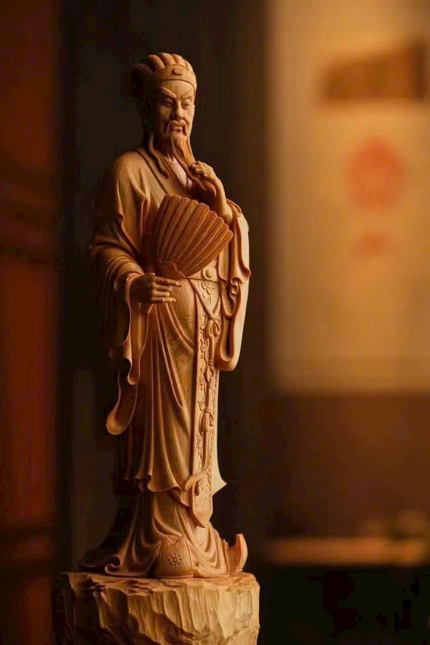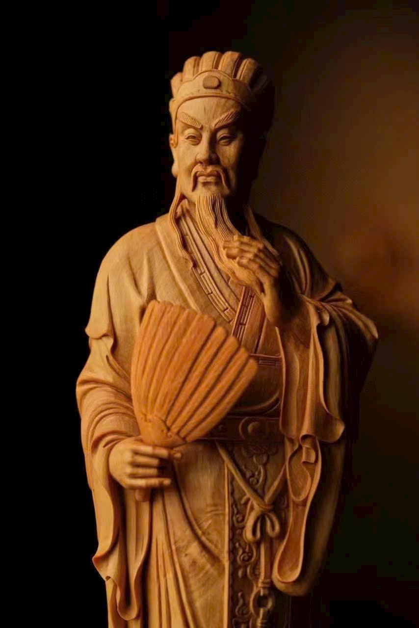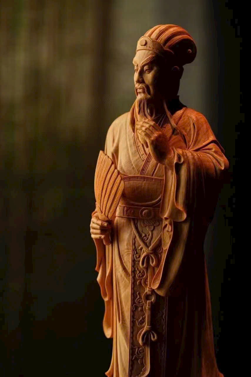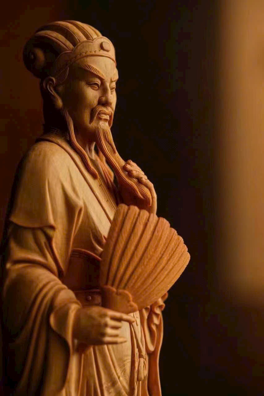 Gia Cát Lượng ngưng mắt nhìn xa, tay vuốt râu cầm quạt, như đang bày mưu tính kế, khí độ ung dung tự tại, phong thái vượt trội.
