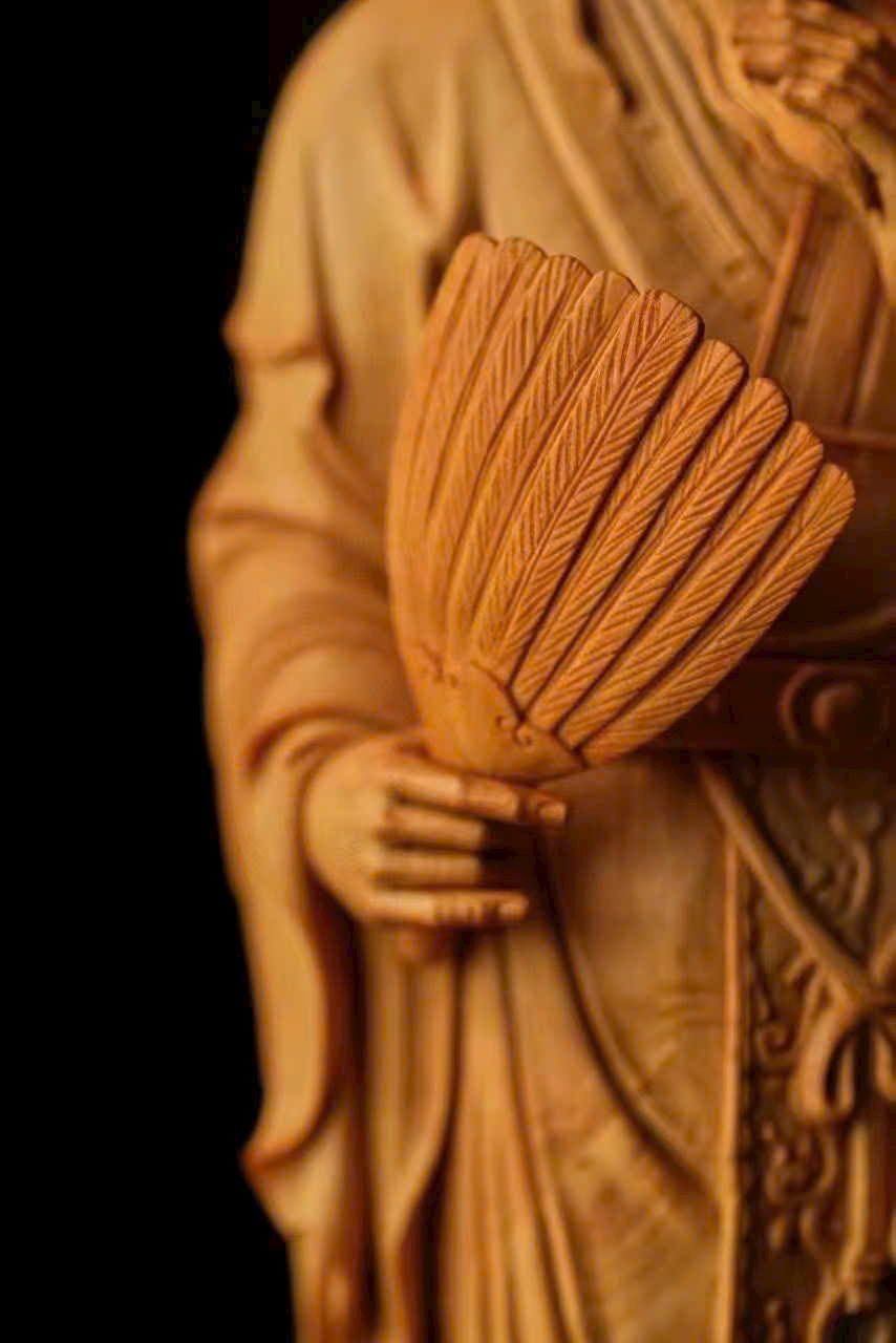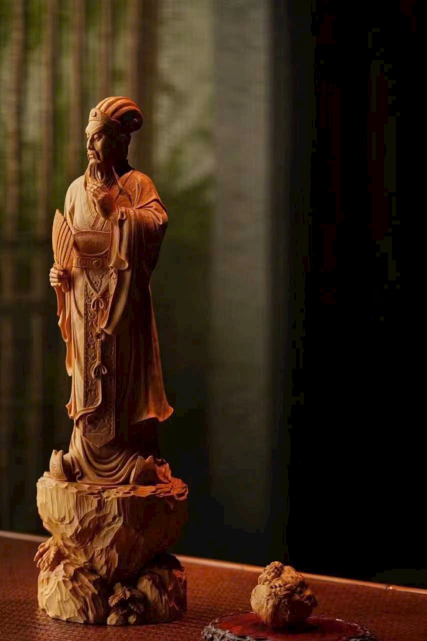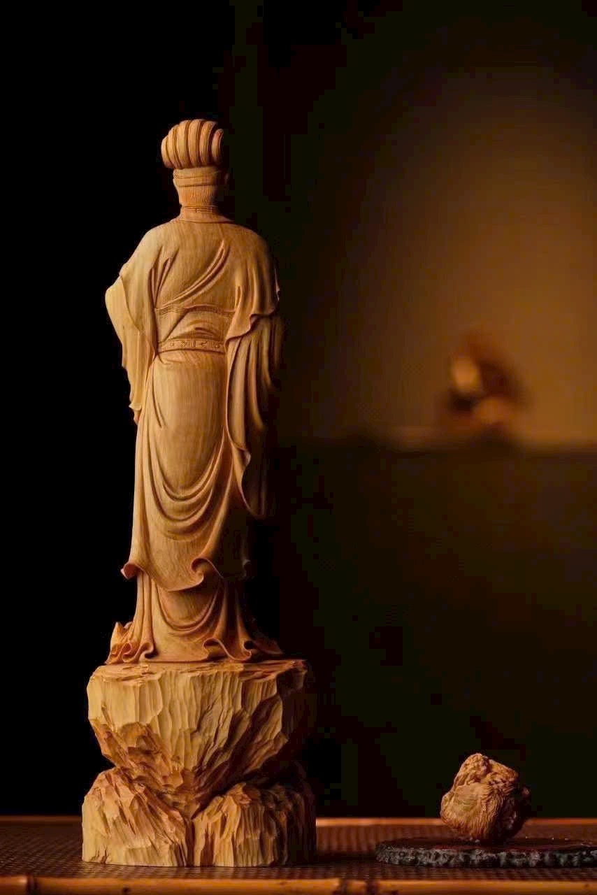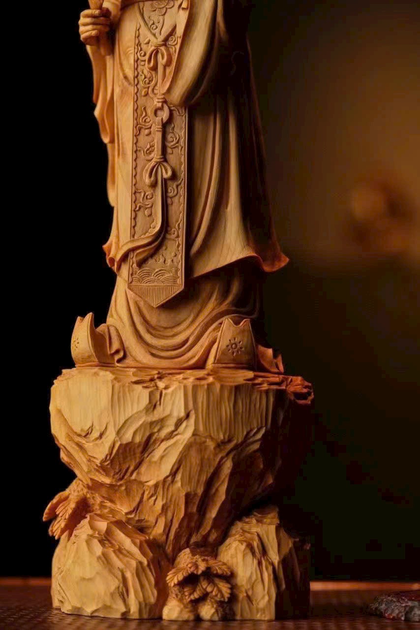 Tác phẩm nhất mộc nguyên khối, chạm khắc liền khối. Dáng hình thanh thoát, phong thái nho nhã, thần thái được khắc họa rất “đắt”.