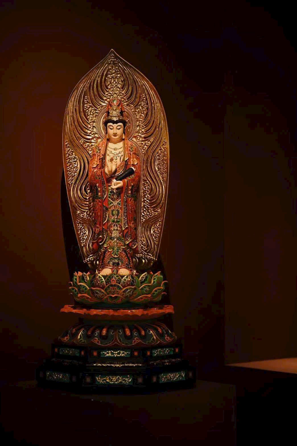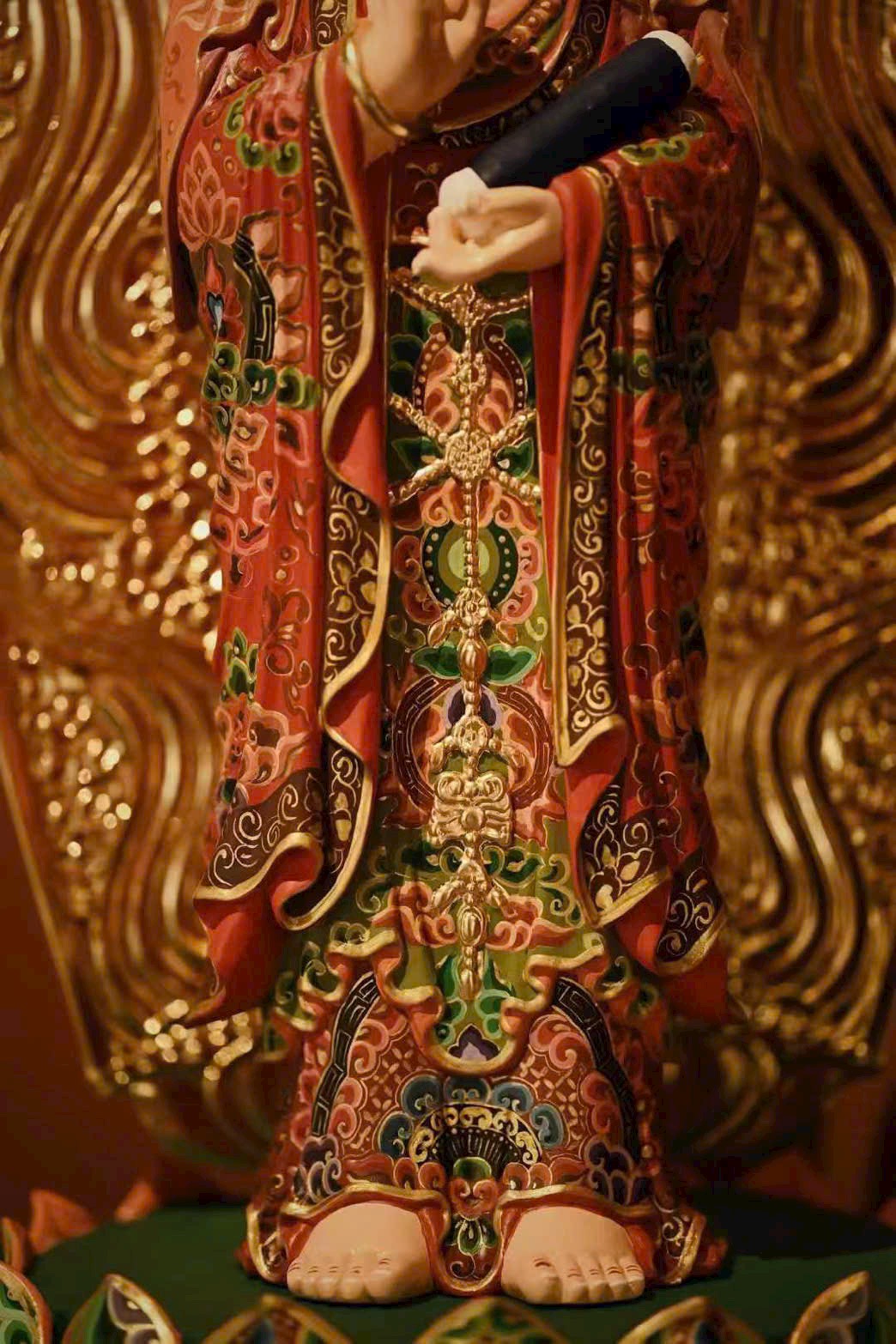 Tượng Quan Âm được chế tác từ gỗ Chương Mộc phối hợp thủ pháp điêu khắc mạnh mẽ, dứt khoát; chi tiết tinh xảo, sống động. Họa tiết vẽ vàng và sơn màu rực rỡ, y phục hoa lệ, đường nét suôn mềm; anh lạc, bảo xuyến tinh tế, thiên y buông rủ tự nhiên. Tay cầm kinh thư, gương mặt an tĩnh, hiền hòa, dáng vẻ thư thái, toát lên vẻ tôn quý, cát tường.