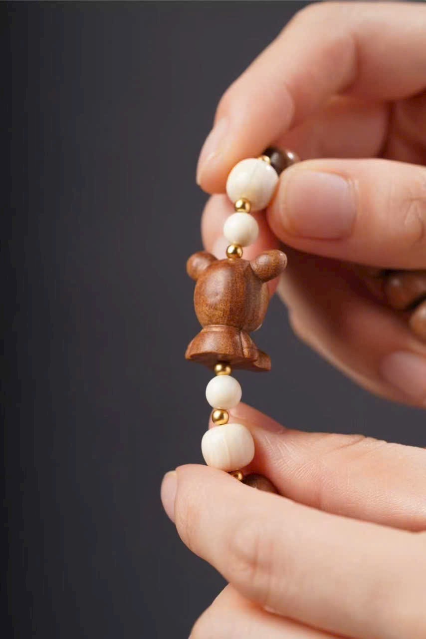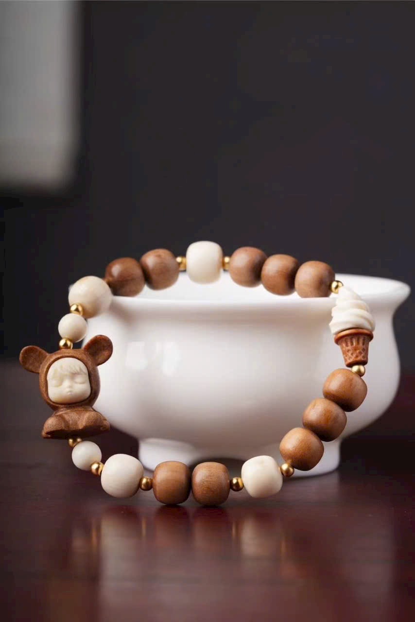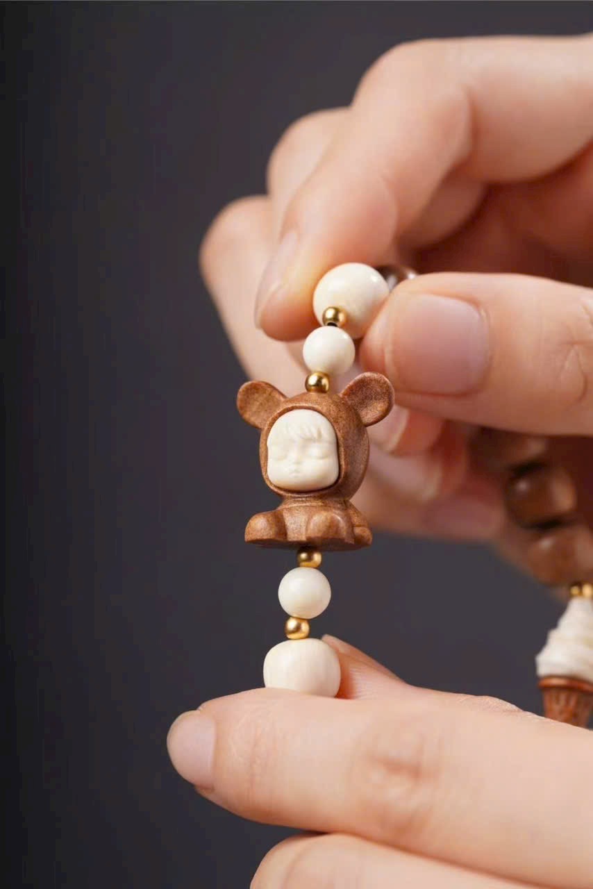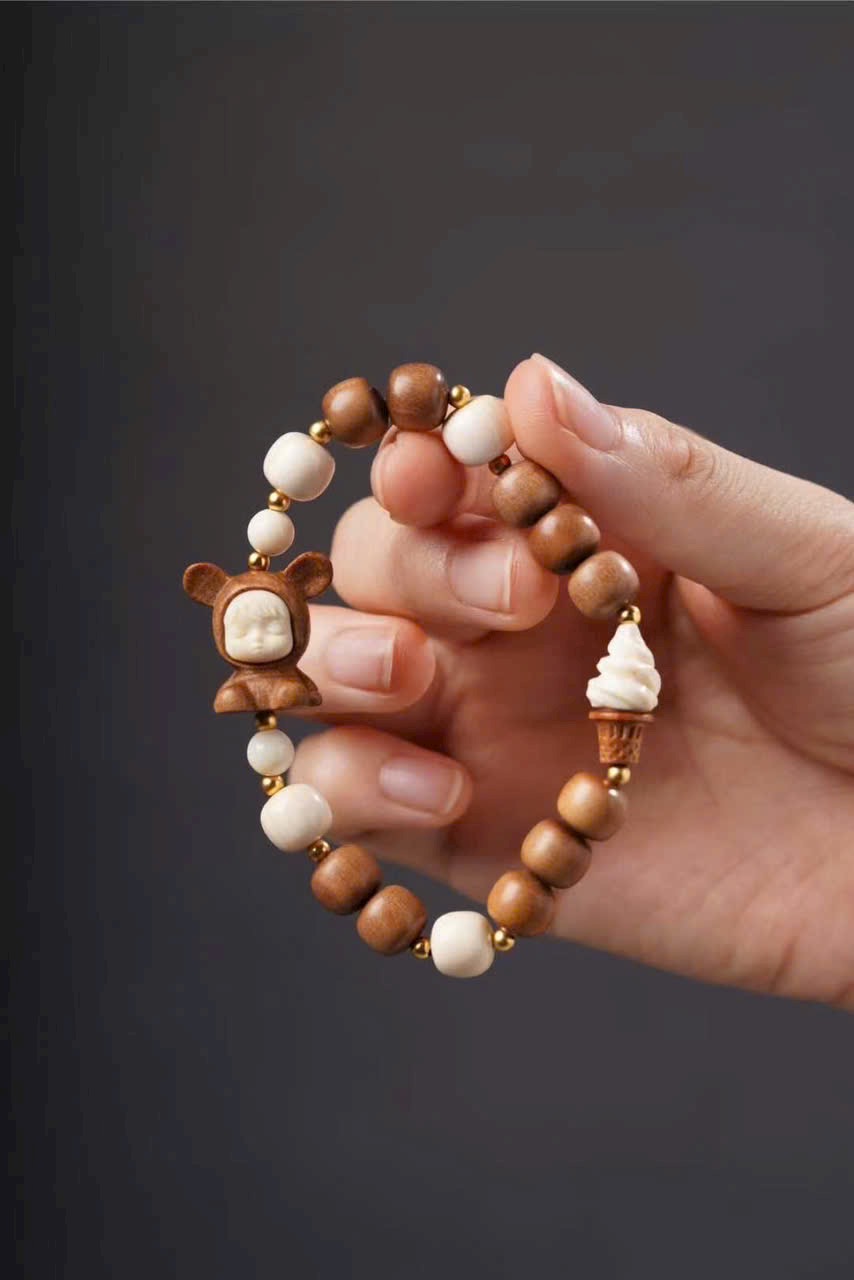 Gồm 10 hạt đàn hương 8x9mm, kèm charm n.gà voi ma mút “Bé Phúc Khí” (khoảng 2×2×1.2cm), charm “Kem” và hạt trụ n.gà voi ma mút 8x9mm.