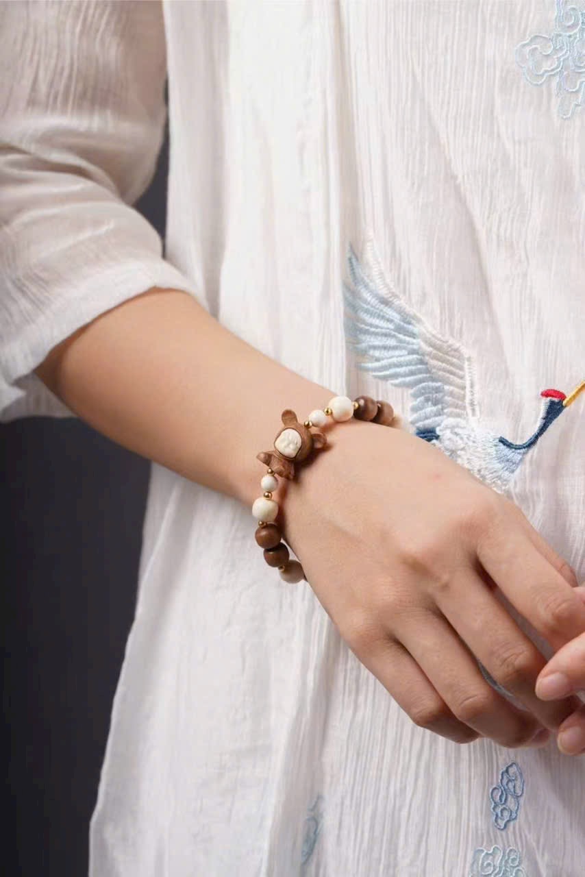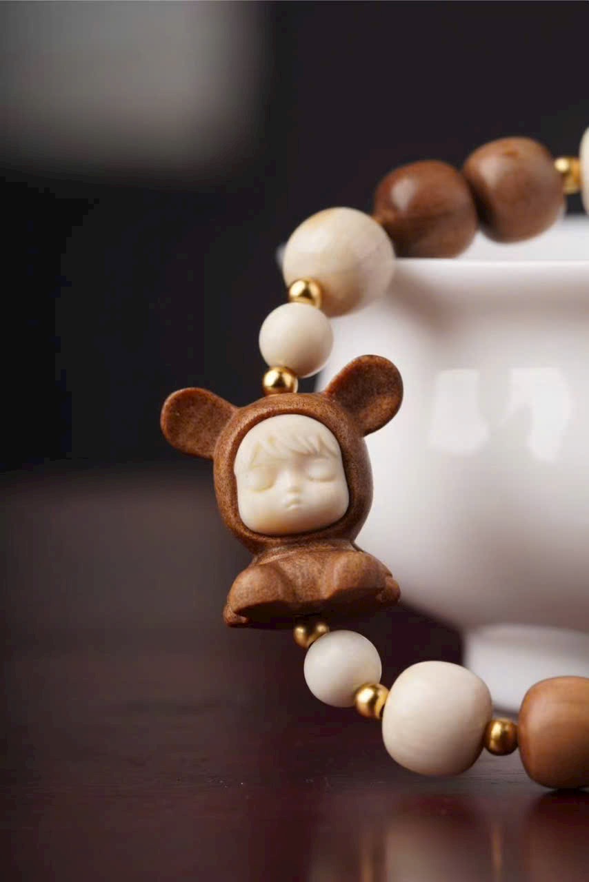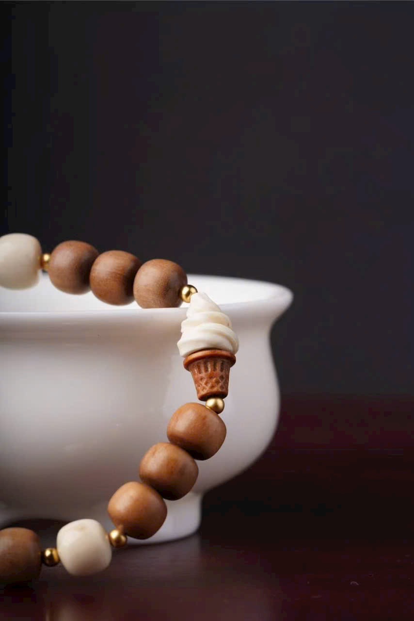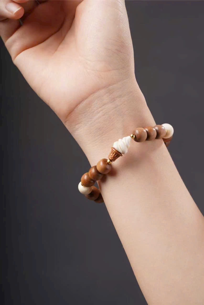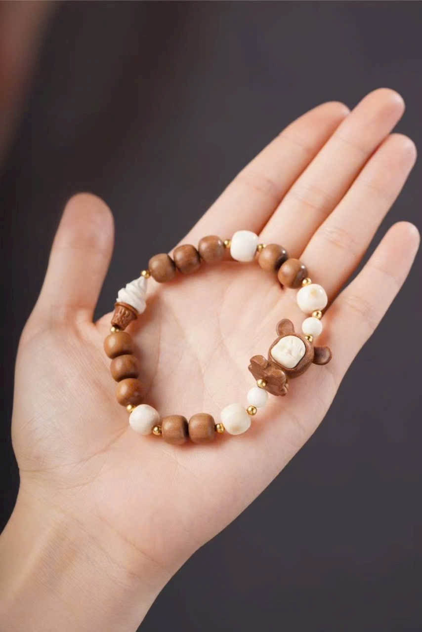 Gồm 10 hạt đàn hương 8x9mm, kèm charm n.gà voi ma mút “Bé Phúc Khí” (khoảng 2×2×1.2cm), charm “Kem” và hạt trụ n.gà voi ma mút 8x9mm.