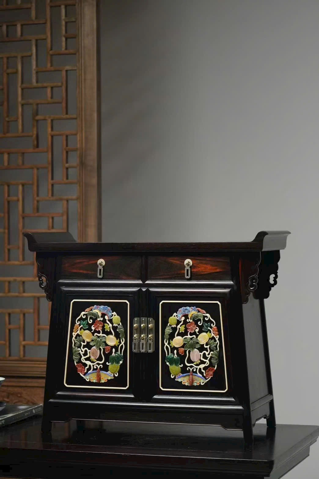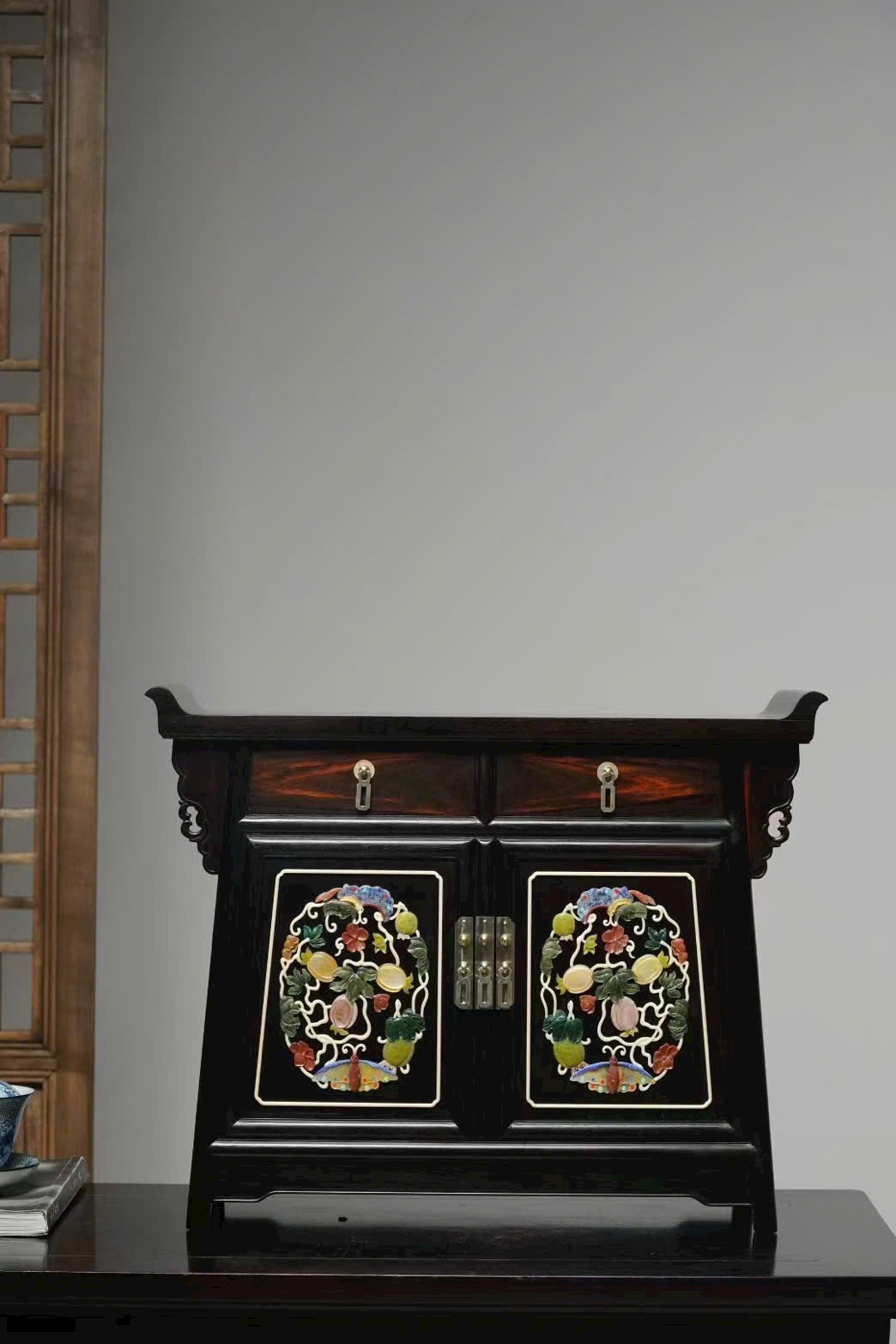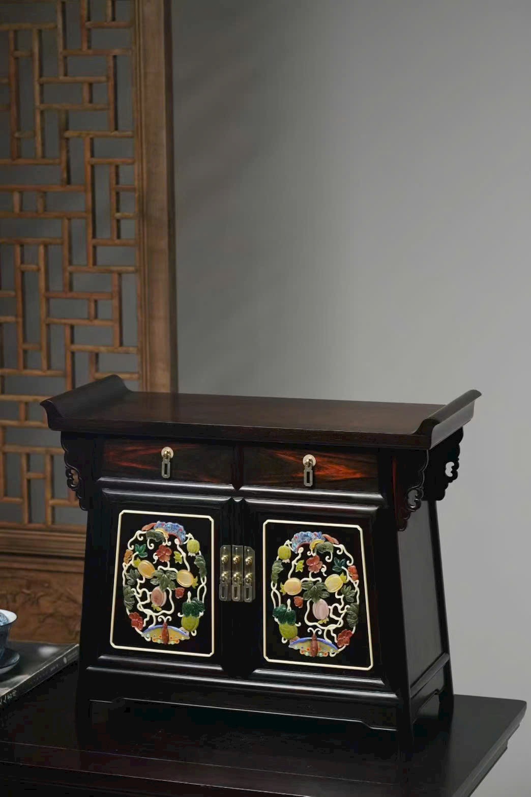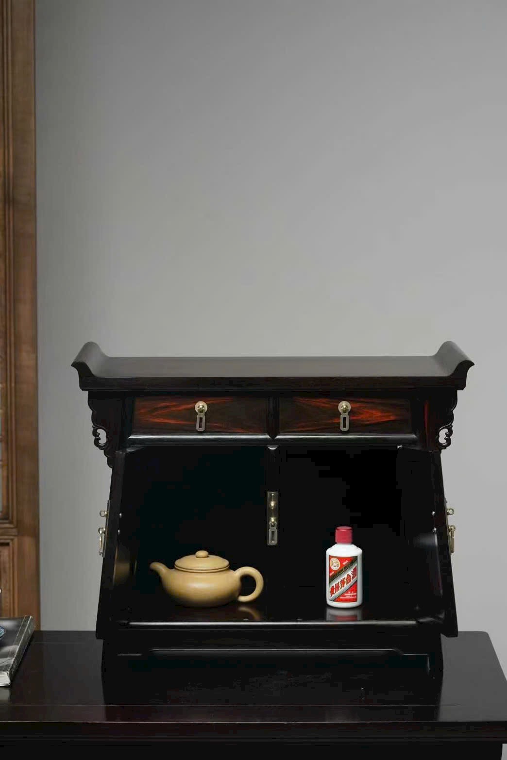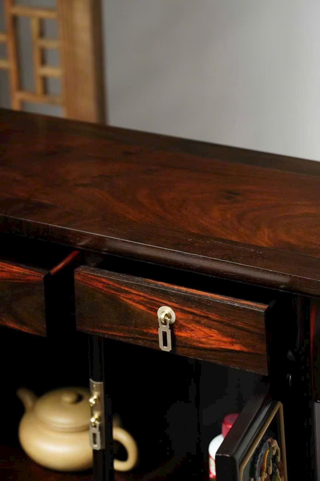 Chế tác từ gỗ trắc tuyển chọn, sắc gỗ đậm trầm, vân mịn rõ nét, kết cấu chắc chắn. Thiết kế nhị liên trù (hai khoang liền kề) cân đối, gọn gàng mà trang nhã.
