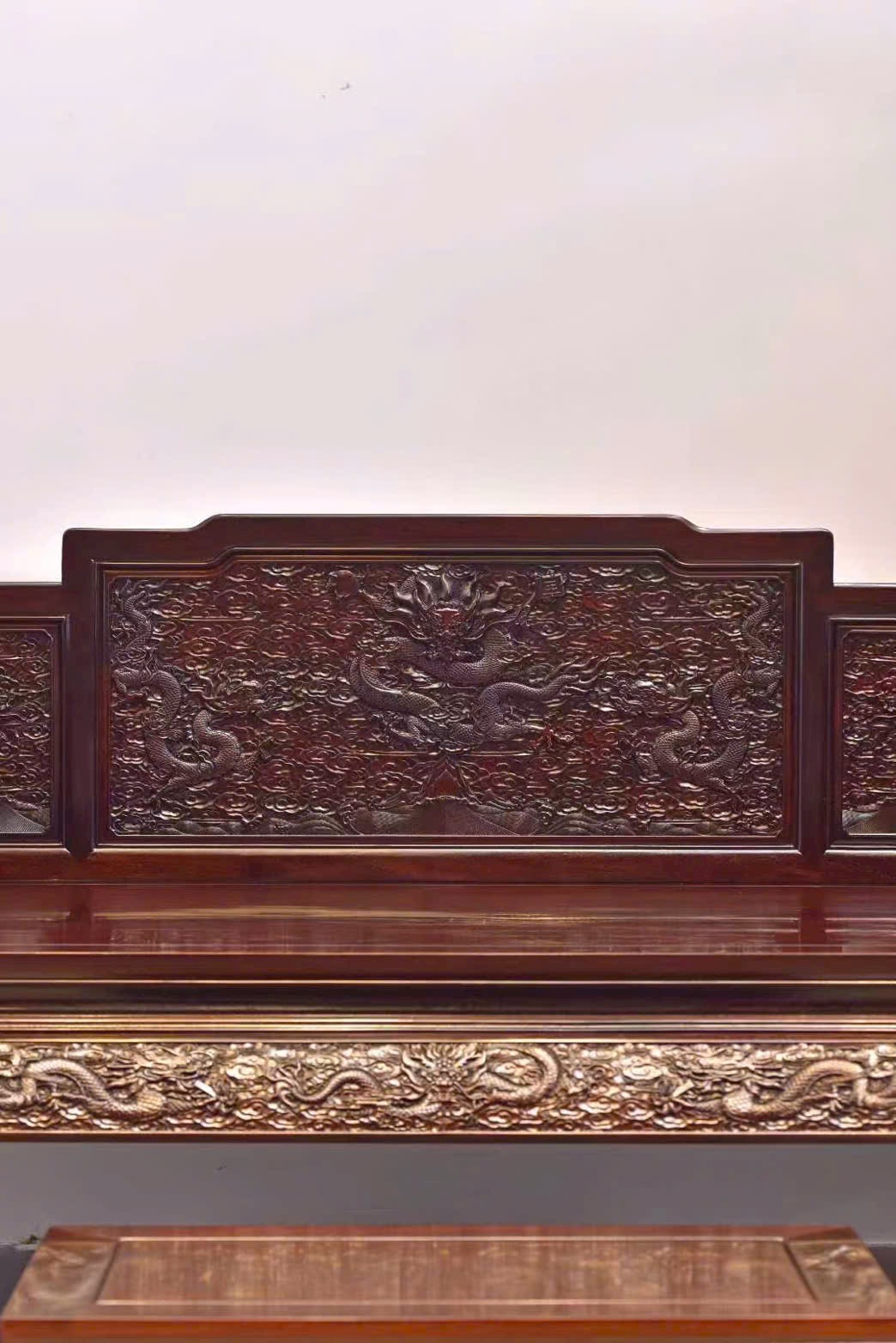 Bộ La Hán Sàng chạm rồng chế tác từ gỗ Tử Đàn Phi, thực hiện theo lối nhập mộc tam phân – chậm công tinh tác. Hoa văn rồng uốn lượn mạnh mẽ, phù điêu trọng công nổi khối sâu, tổng thể tinh xảo mà trang nhã.
