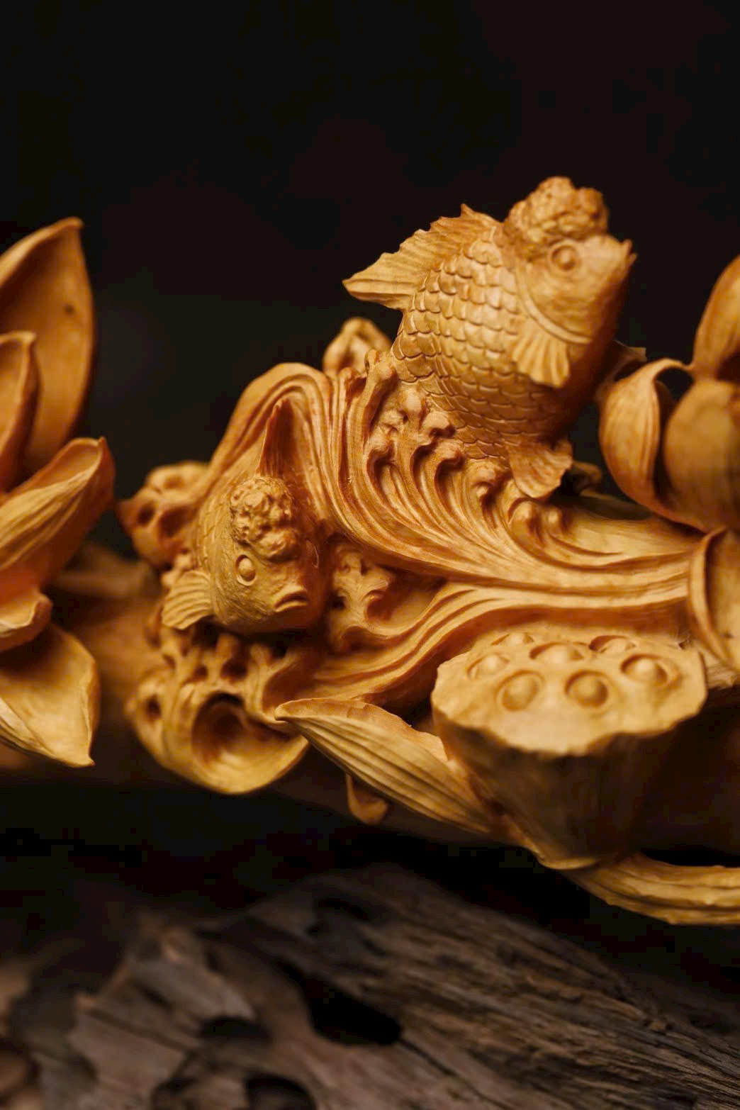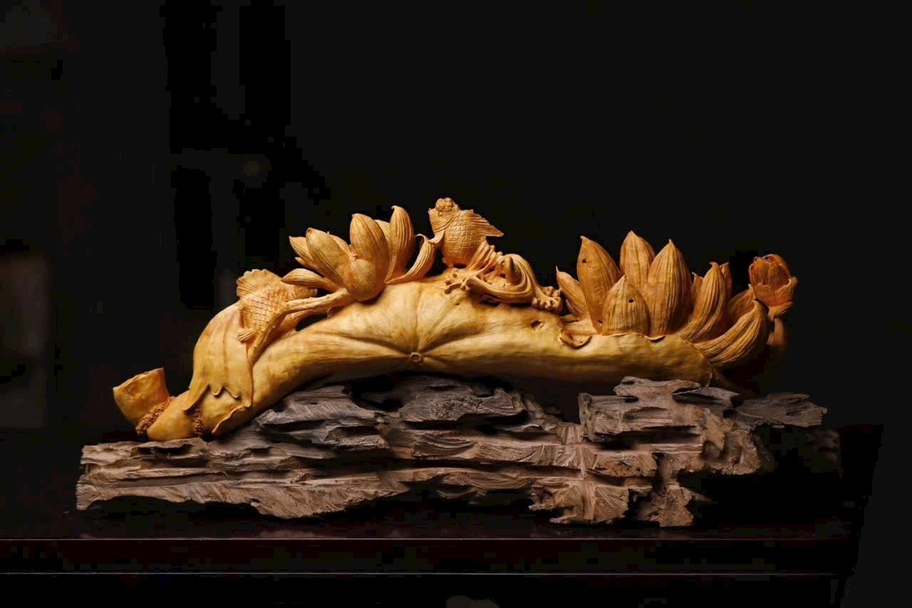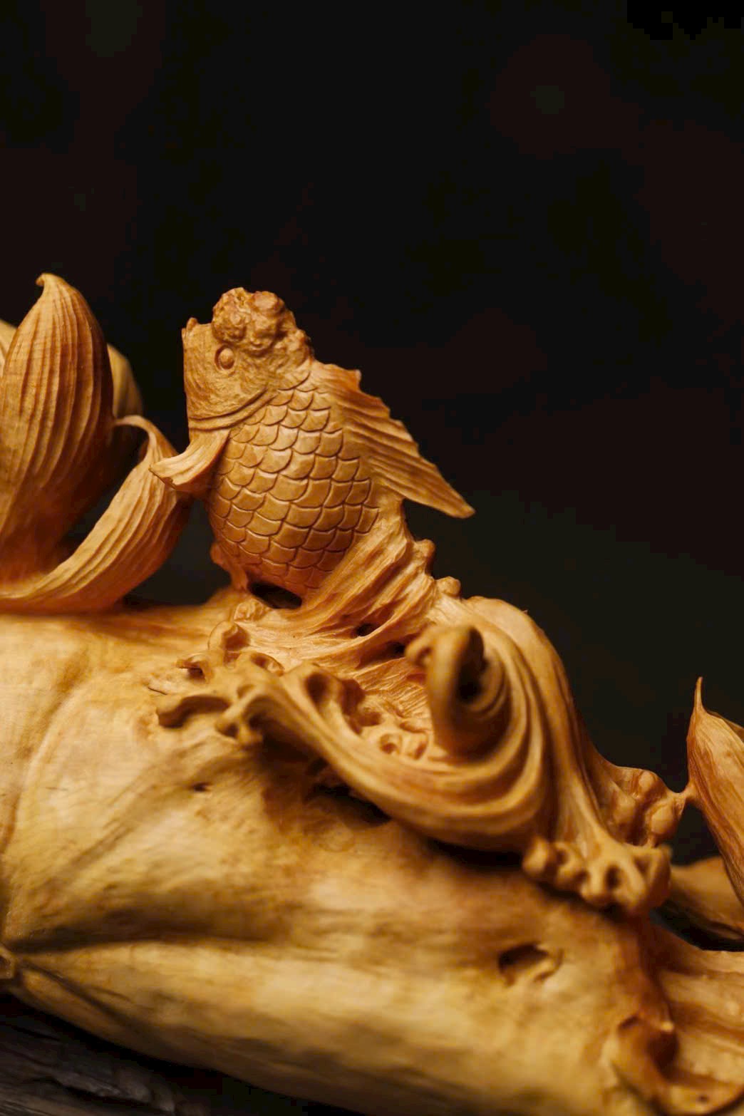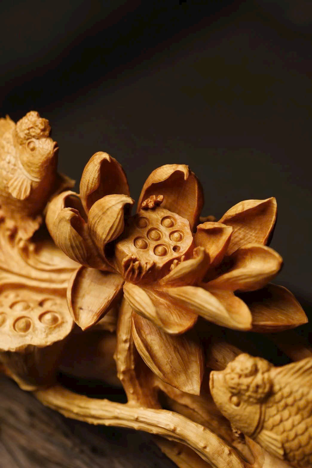 Được chế tác từ khối gỗ hoàng dương nguyên khối tuyển chọn, chạm khắc tinh xảo bằng đục tay. Lá sen xòe rộng như tán, đài sen căng tròn ẩn ngọc bên trong, cá chép uốn mình bơi lượn giữa sóng nước, từng vảy cá và gợn nước được khắc họa tỉ mỉ đến từng chi tiết.