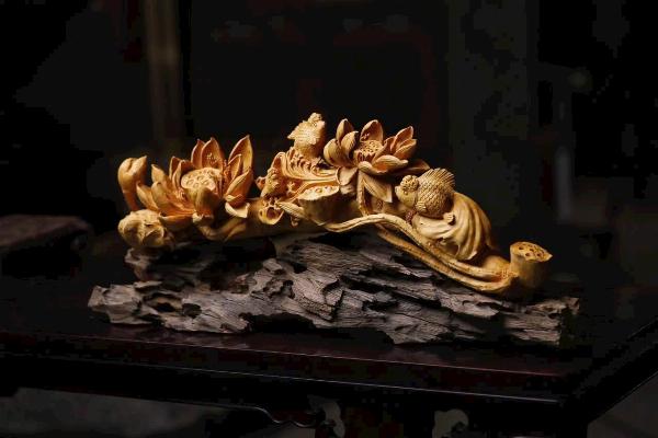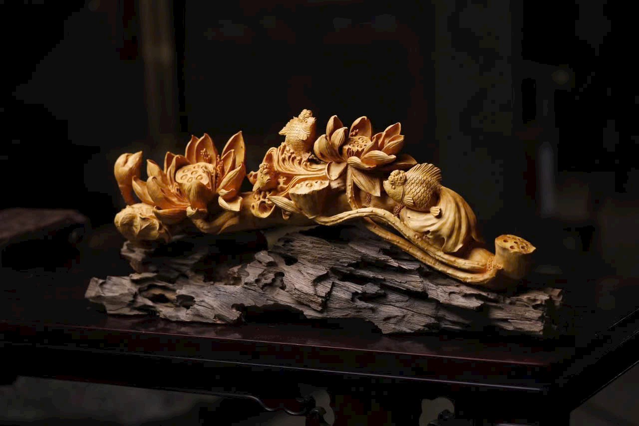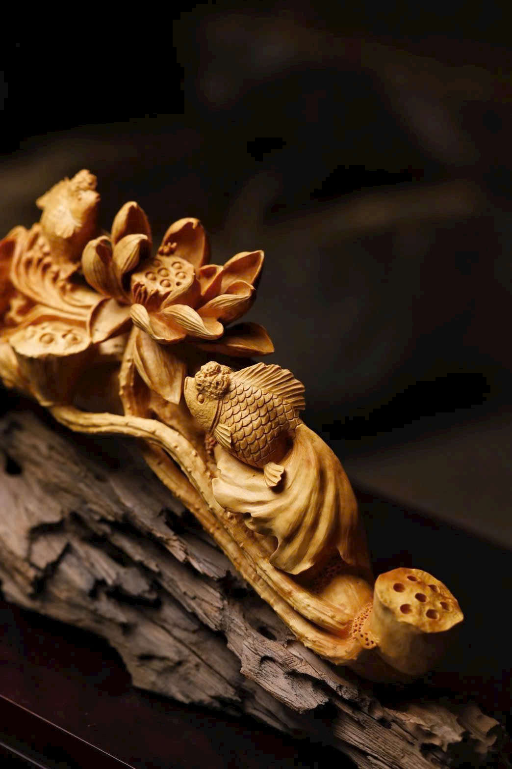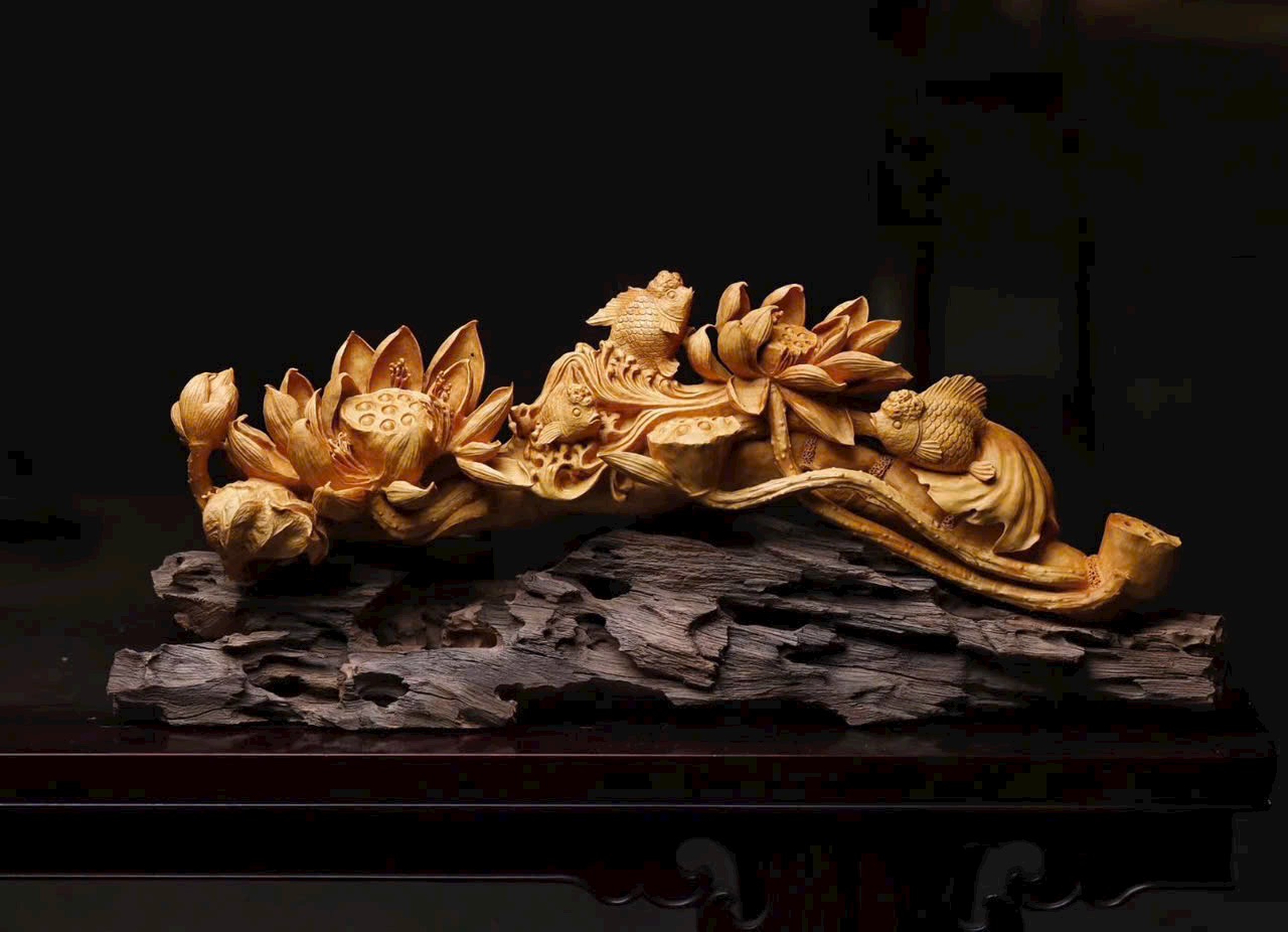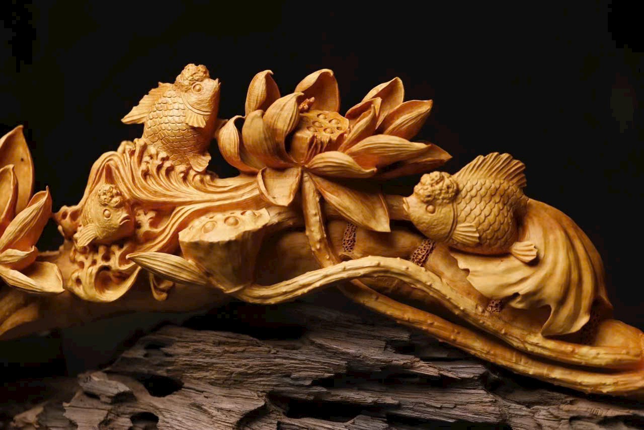 Được chế tác từ khối gỗ hoàng dương nguyên khối tuyển chọn, chạm khắc tinh xảo bằng đục tay. Lá sen xòe rộng như tán, đài sen căng tròn ẩn ngọc bên trong, cá chép uốn mình bơi lượn giữa sóng nước, từng vảy cá và gợn nước được khắc họa tỉ mỉ đến từng chi tiết.