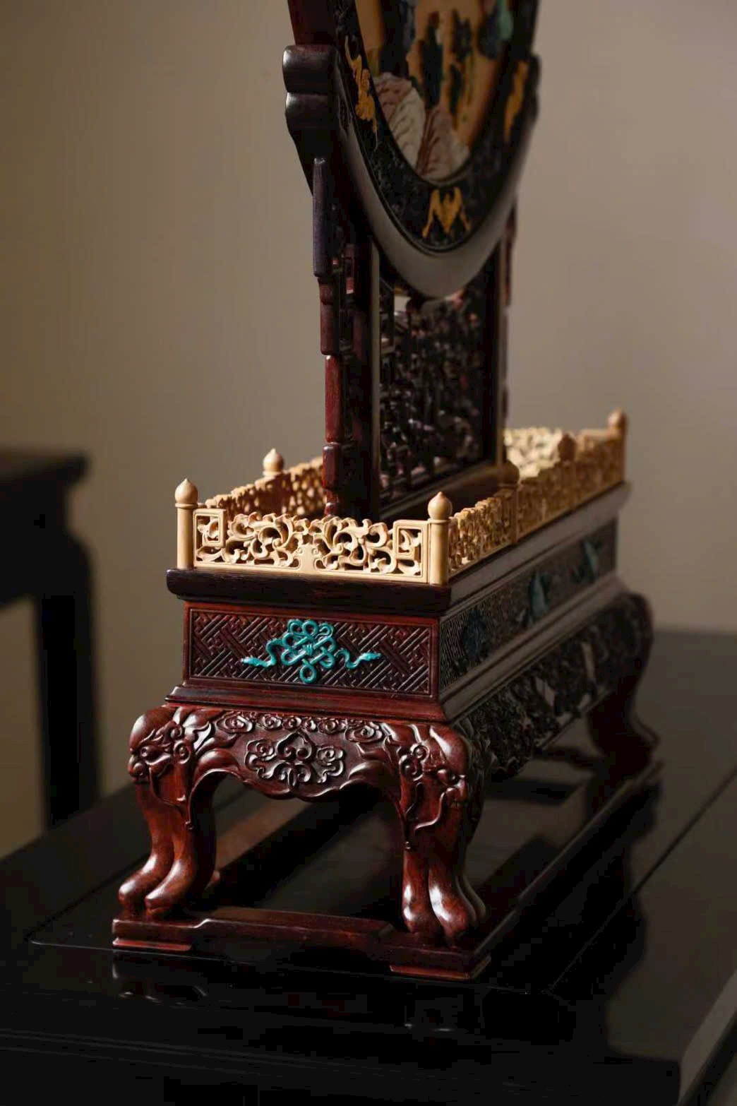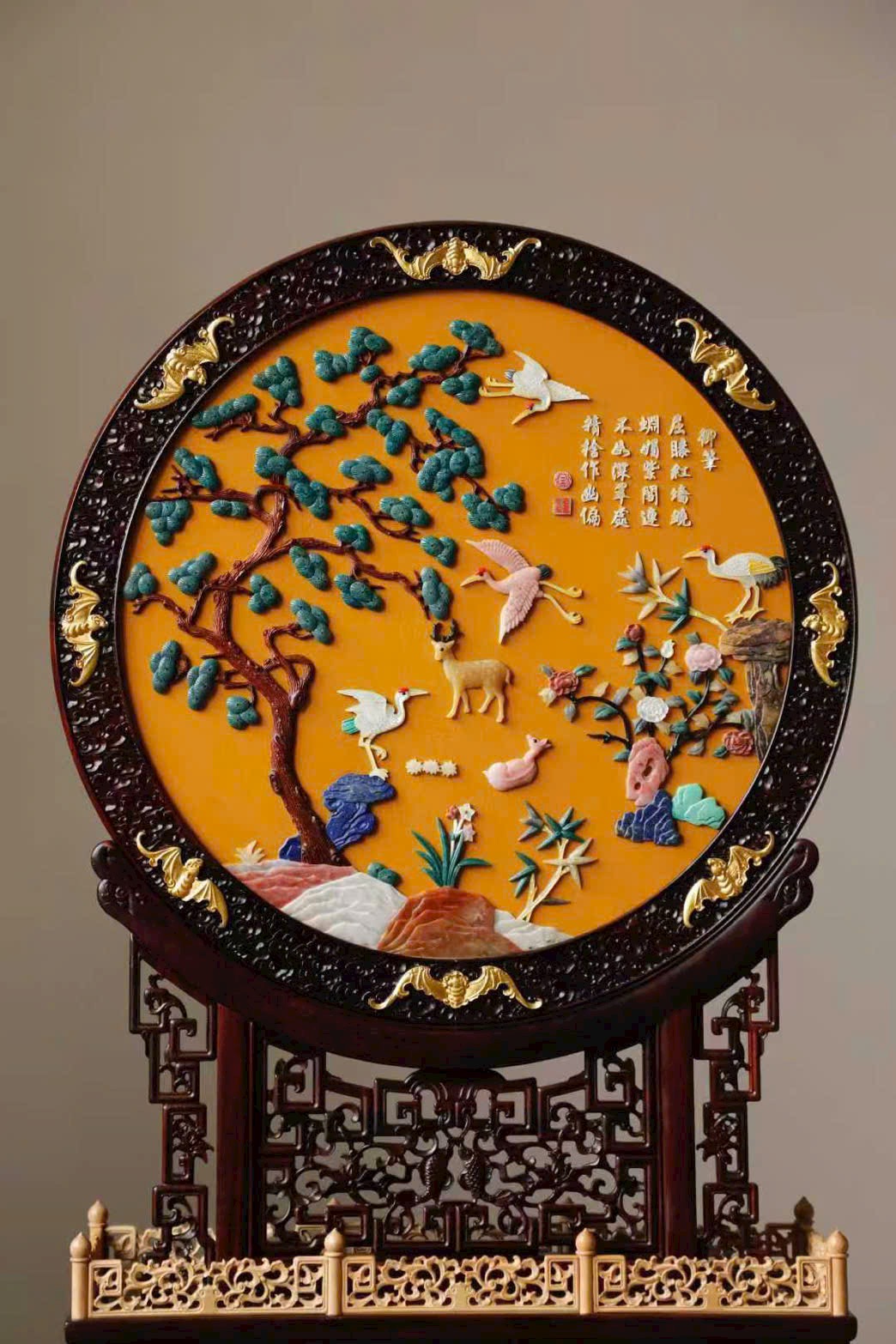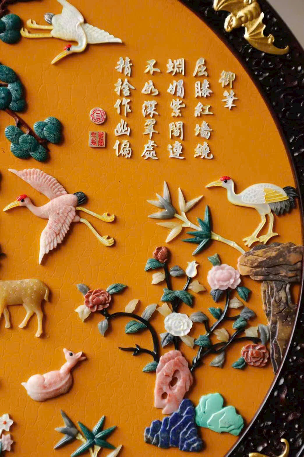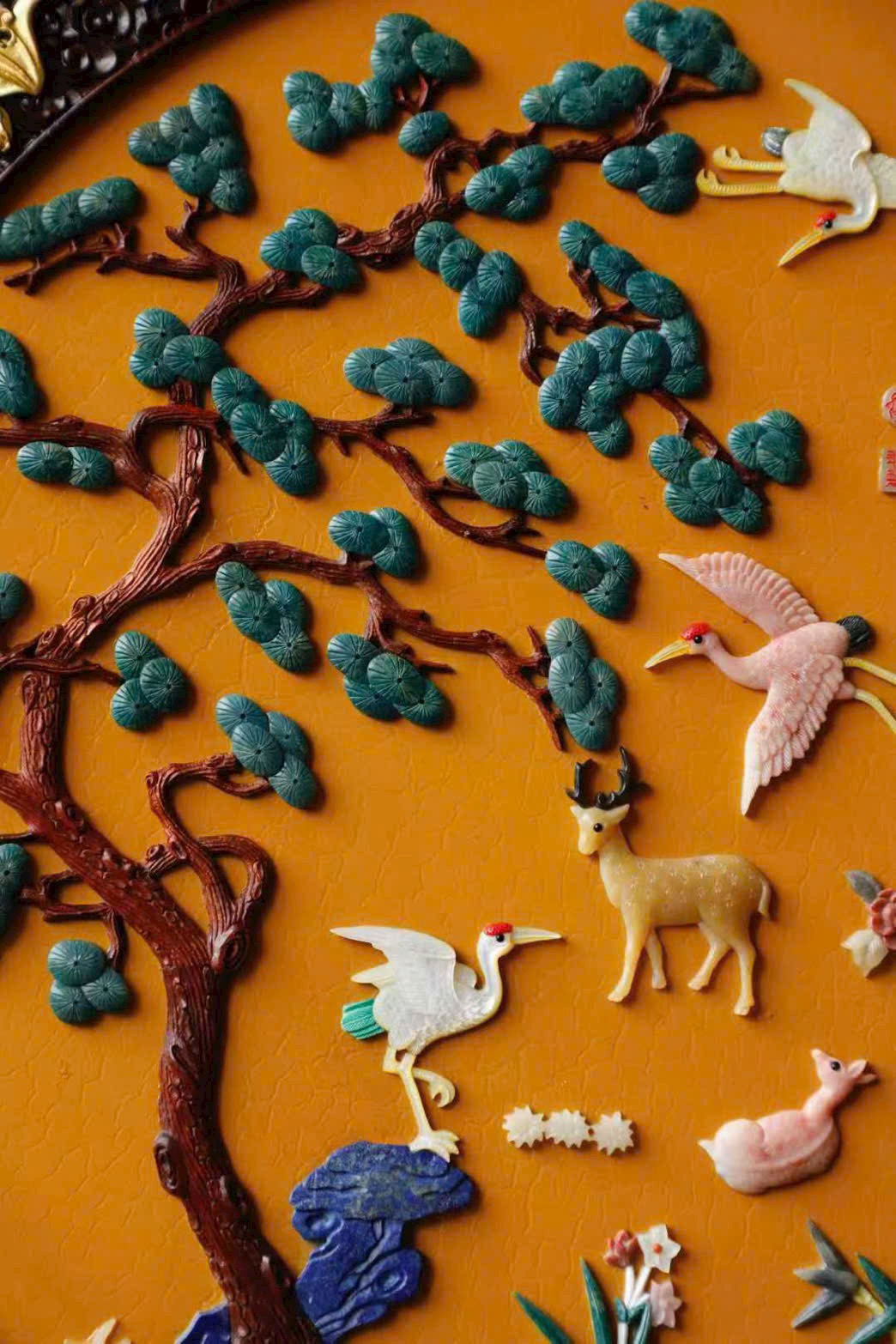 Mặt trước khảm nổi “Hạc lộc đồng xuân – Tùng hạc diên niên” bằng trân châu, cẩm thạch, phỉ thúy, ngà mammoth,…