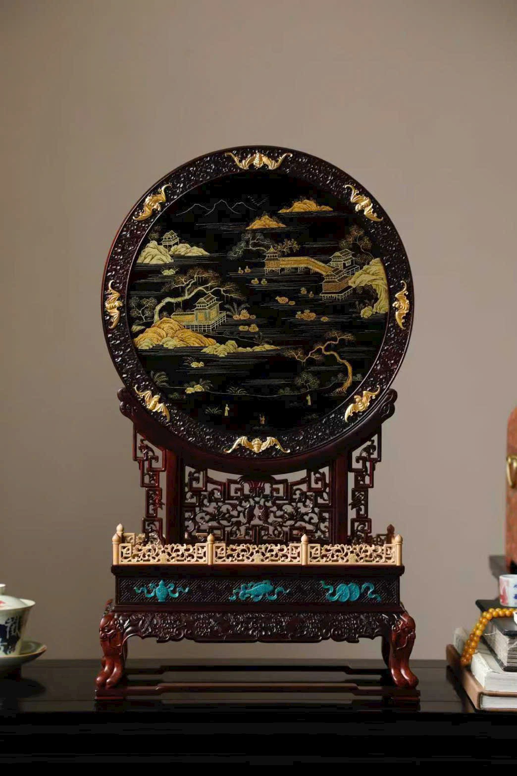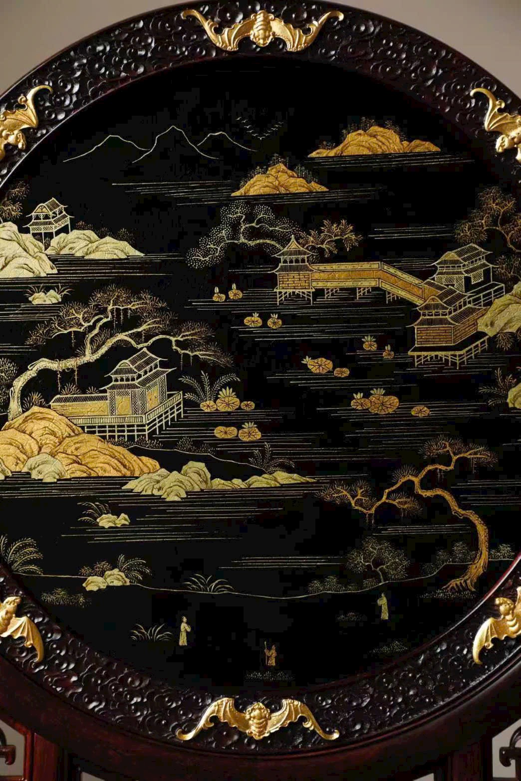 Mặt sau vẽ sơn thủy mạ kim sống động.
