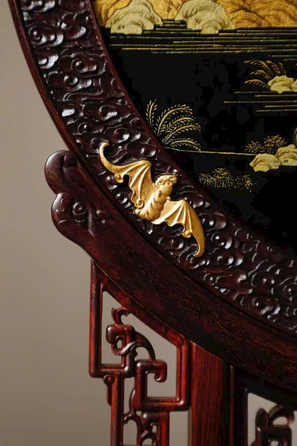 Kết cấu mộng truyền thống, chạm trổ tinh xảo: hoa văn cuốn thảo, song ngư, vân mây – điểm vàng kim dơi nổi bật, mang ý phúc khí tràn đầy.