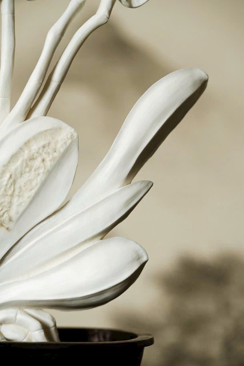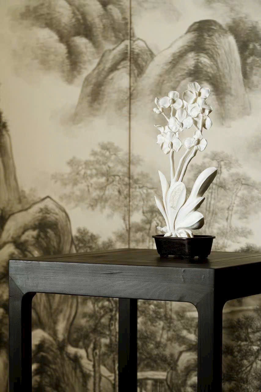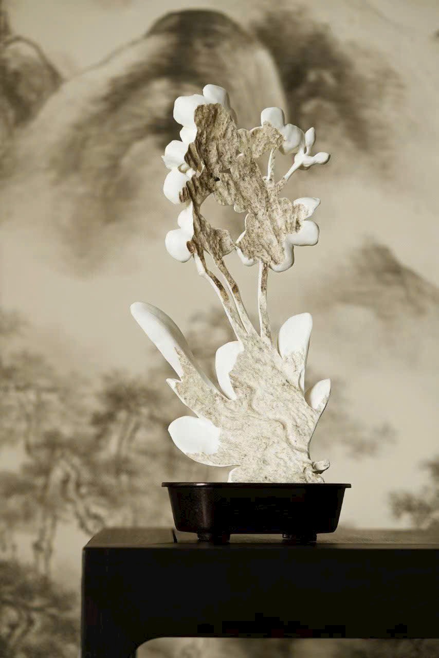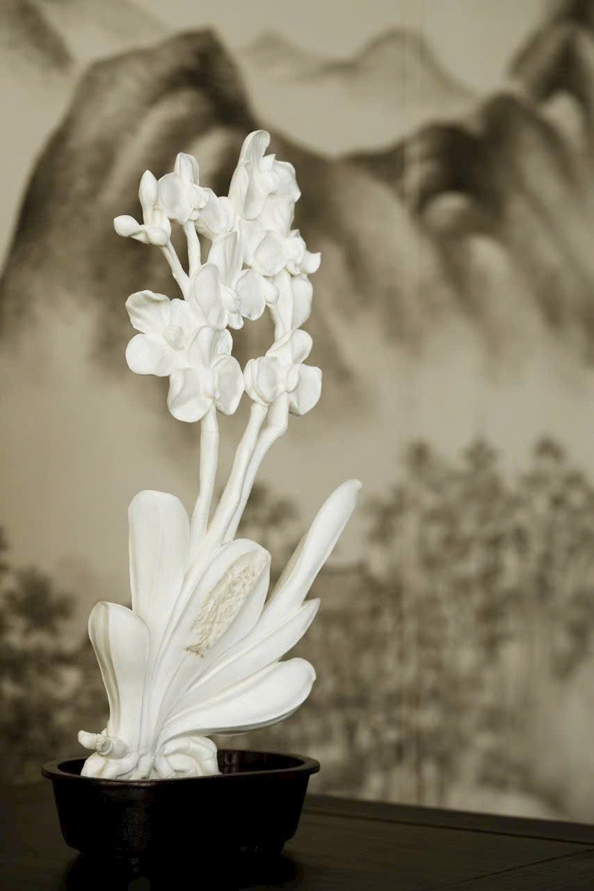 Tác phẩm chạm khắc từ một khối liền, bố cục tinh xảo. Hoa nở phú quý, cánh – nhụy – lá phân tầng rõ ràng, xử lý cận thực viễn hư giàu ý vị hội họa mà vẫn tả thực. Đường dao mộc mạc, nhã nhặn, cho thấy công phu và phẩm chất tay nghề. Hàm ý tốt lành, thích hợp làm thanh cung nhã ngoạn; bày trên án thư hay bàn trà, vẻ đẹp thanh khiết mà không phô trương.