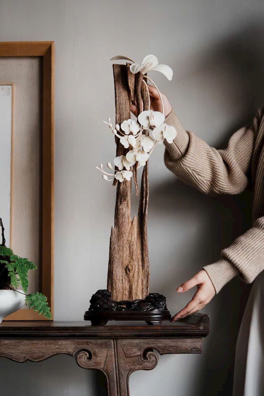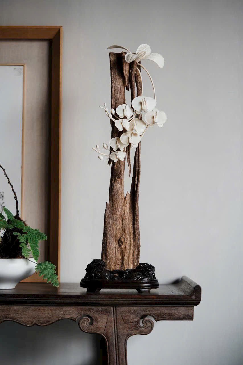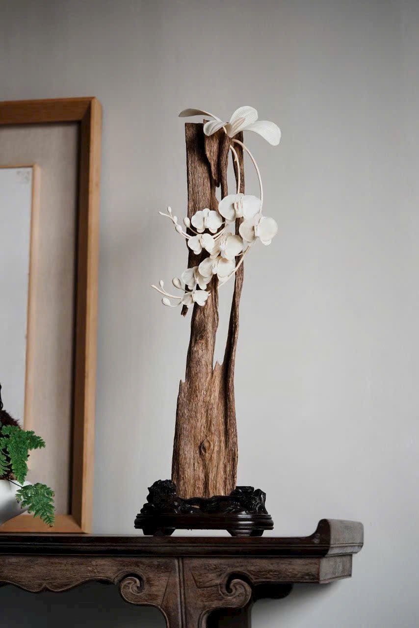 Trầm hương sánh mịn như mực, ng.à voi mamut trắng ngà tựa ánh trăng. Hồ điệp lan nhẹ nhàng như sắp bay, cánh lan xếp lớp, trong suốt, thấm ánh sáng. Tựa như cảnh u cốc dưới trăng, đặt trên án thư liền tỏa hương thanh nhã, lan khắp không gian.