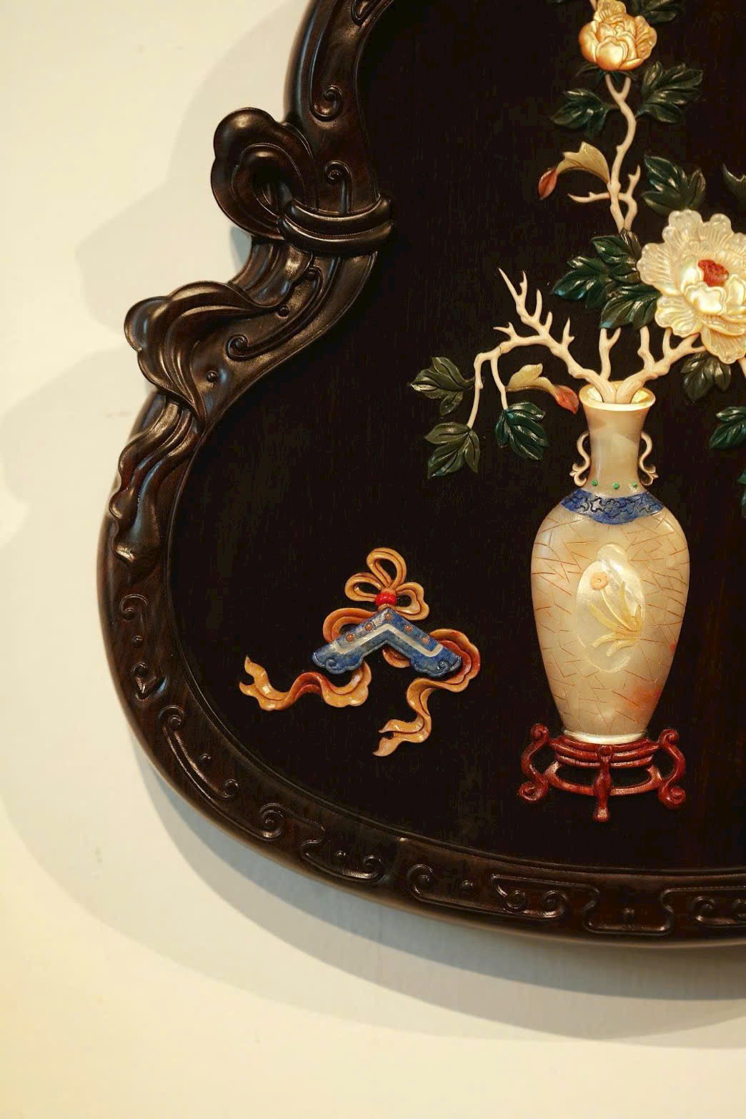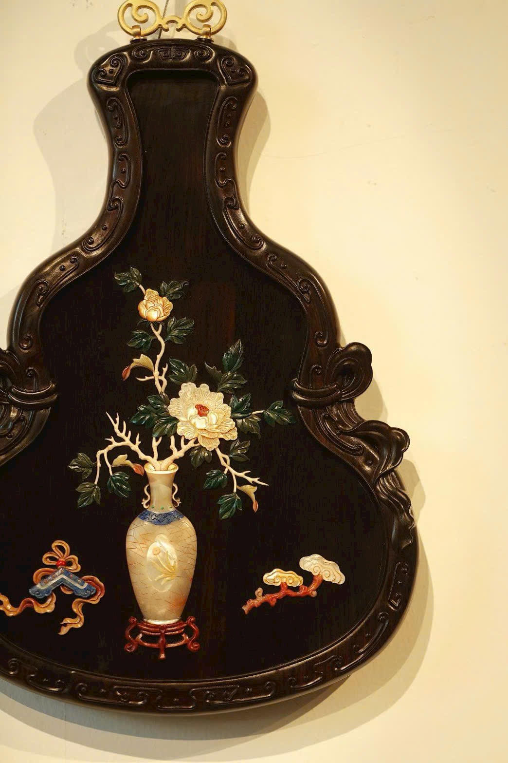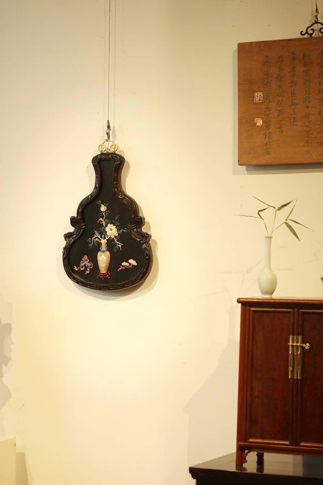 Tranh treo dáng hồ lô, khung tử quang đàn ghép khéo; tâm tranh bách bảo khảm tạo cảnh thanh cung tinh tế, bố cục lập thể, nhã nhặn. Biểu trưng phúc lộc – cát tường như ý, là lựa chọn lý tưởng cho phòng khách, thư phòng.