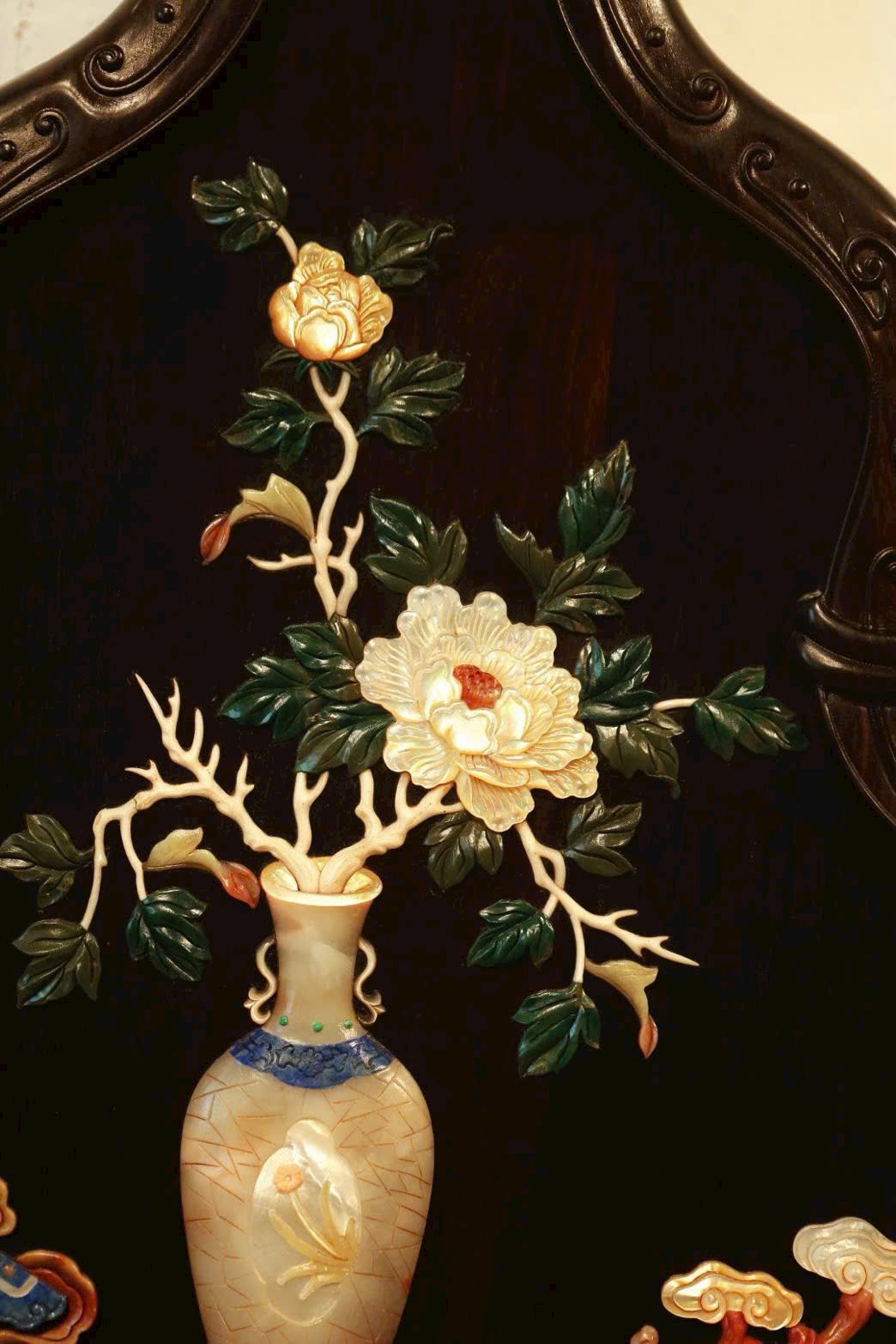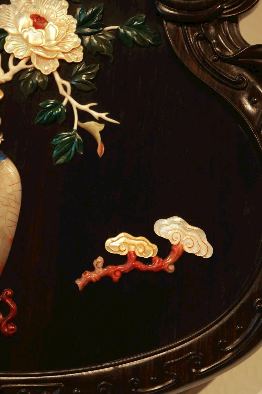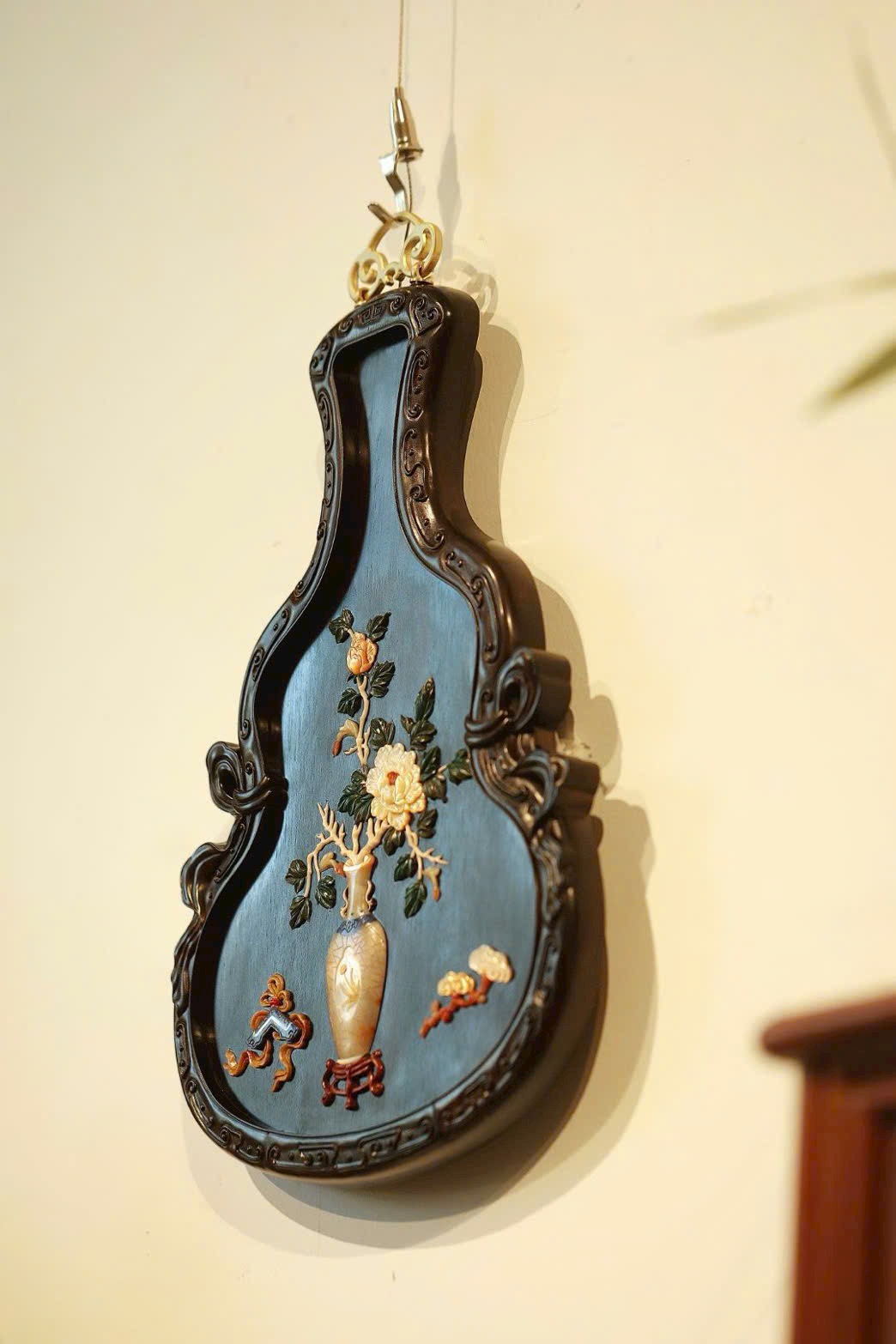 Tranh treo dáng hồ lô, khung tử quang đàn ghép khéo; tâm tranh bách bảo khảm tạo cảnh thanh cung tinh tế, bố cục lập thể, nhã nhặn. Biểu trưng phúc lộc – cát tường như ý, là lựa chọn lý tưởng cho phòng khách, thư phòng.