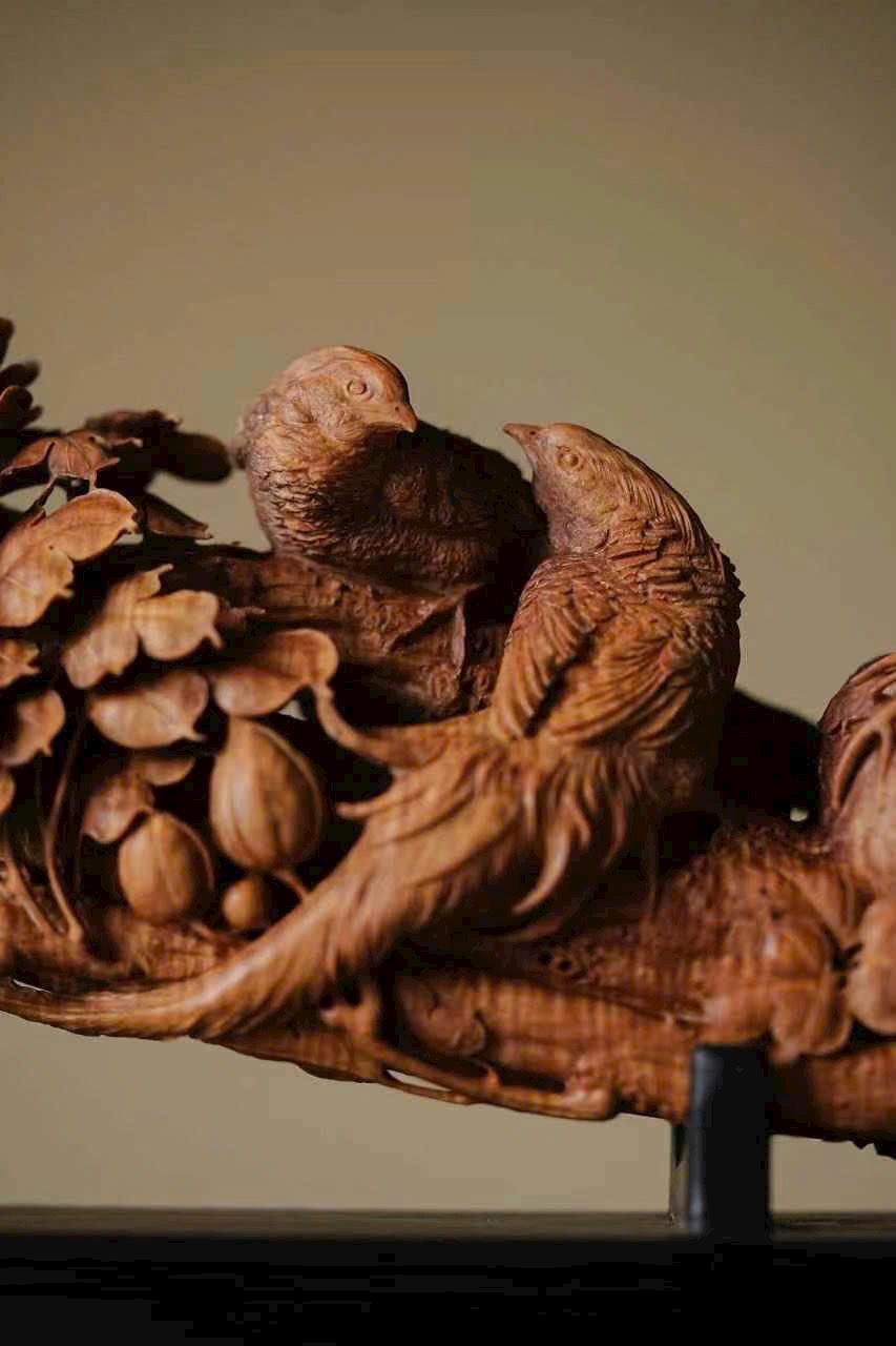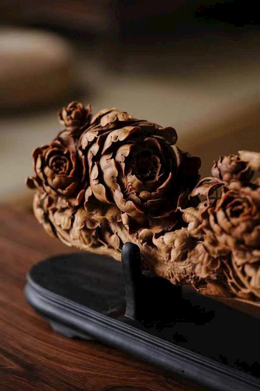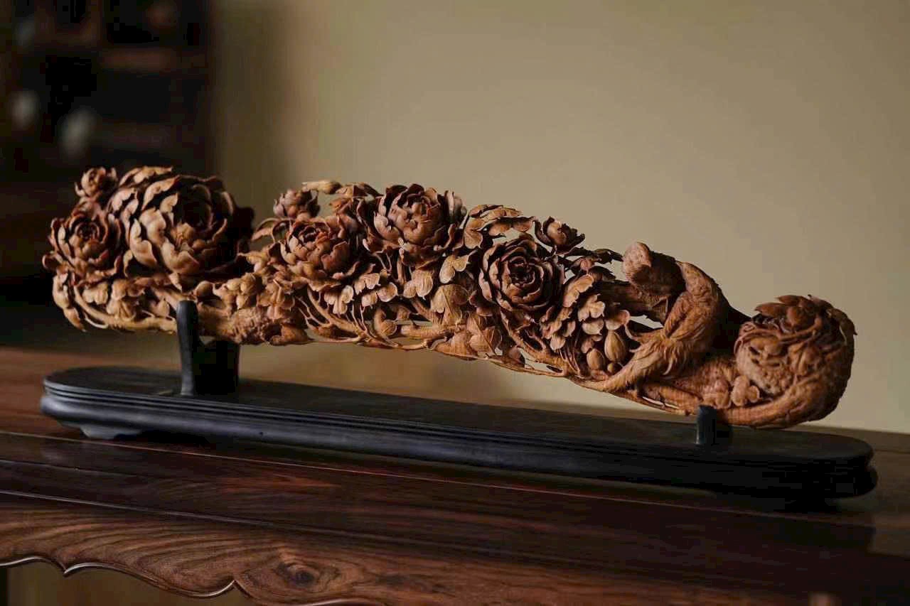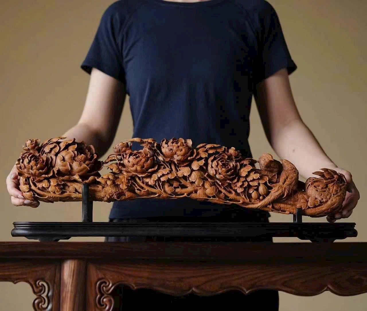 Hoa nở tầng tầng lớp lớp, chim đậu trên cành ngoái nhìn, lông vũ chạm khắc sống động. Kỹ thuật điêu khắc tinh xảo, hương thơm dịu nhẹ lan tỏa.