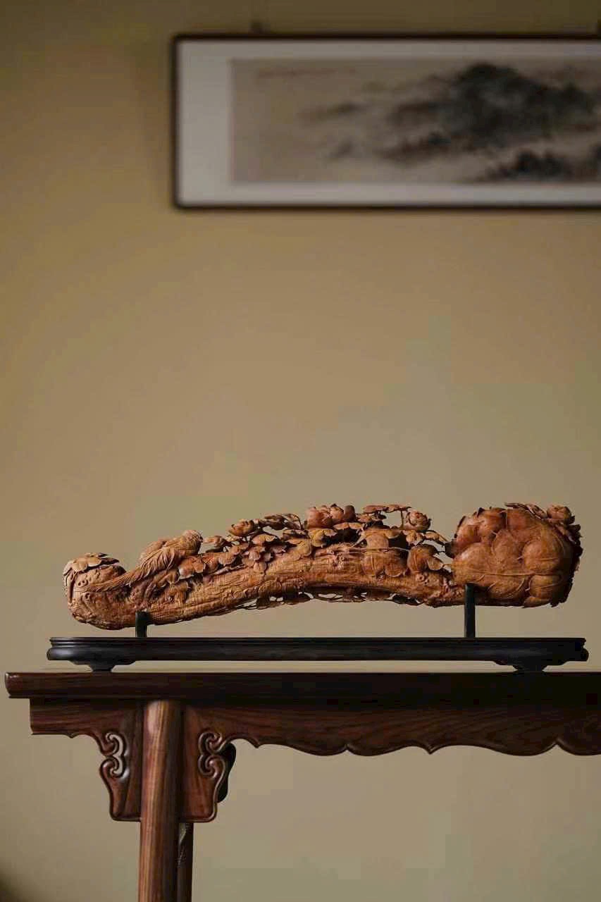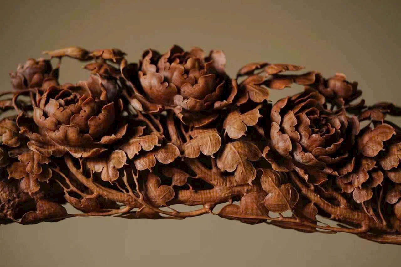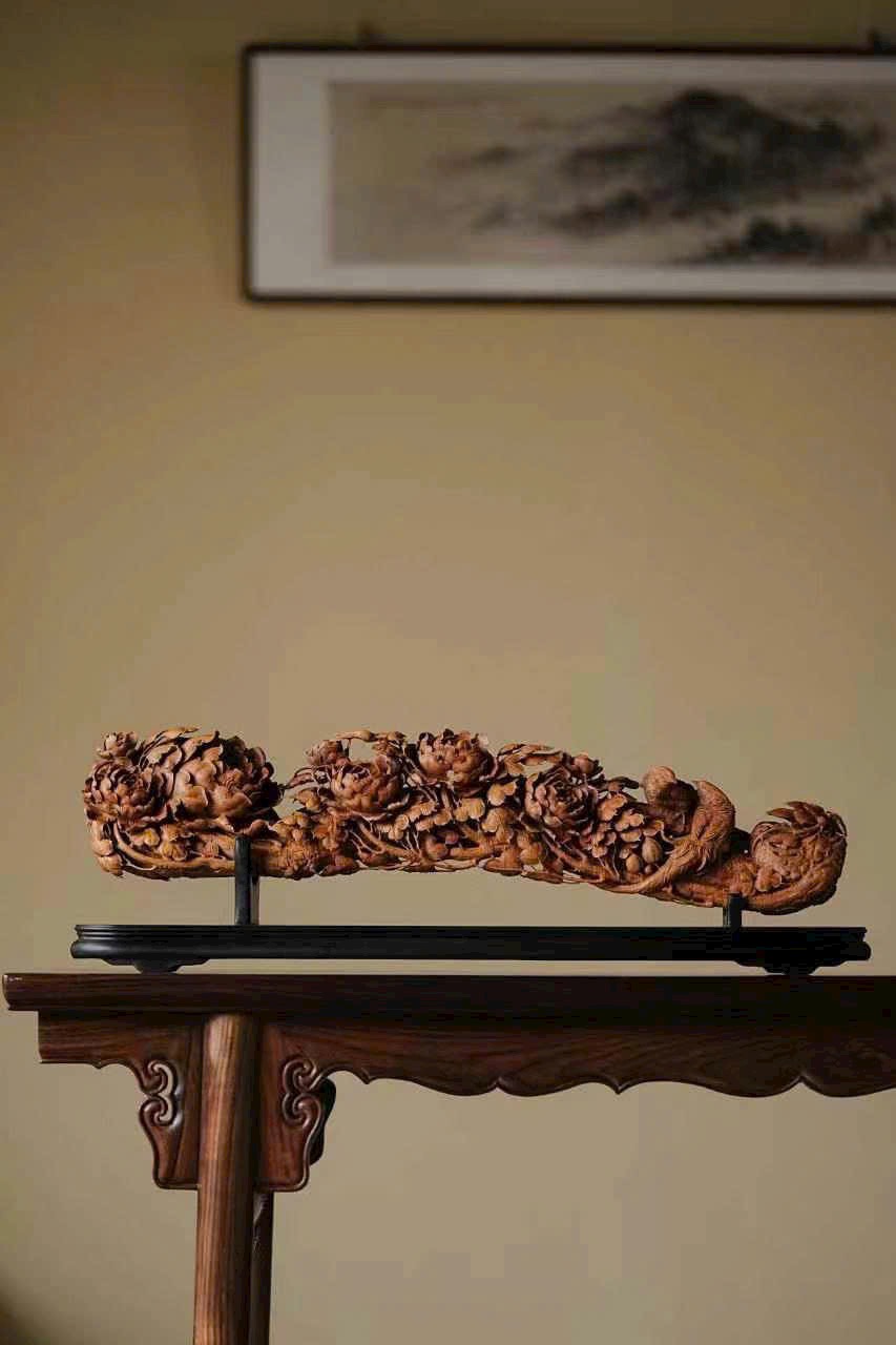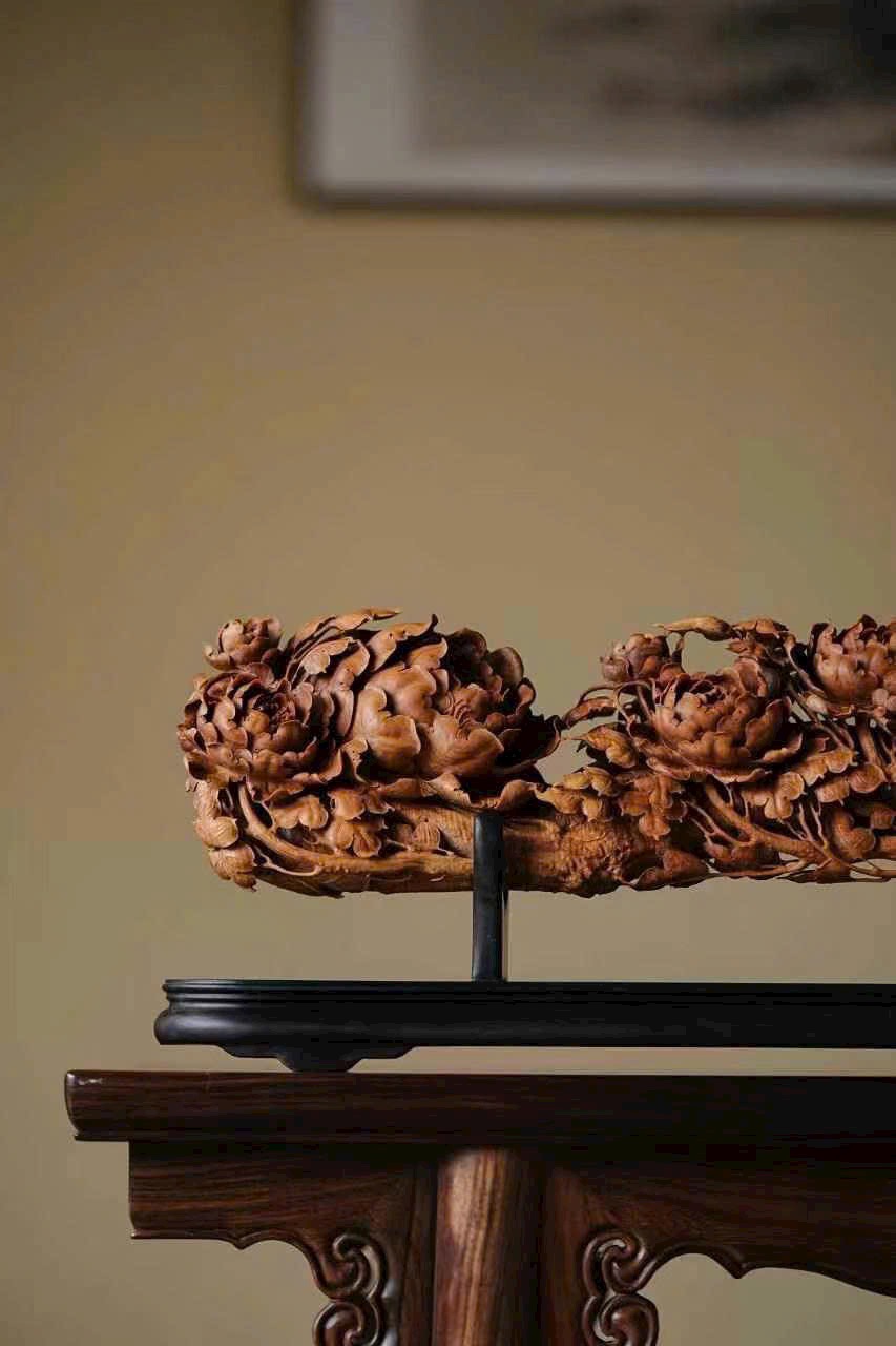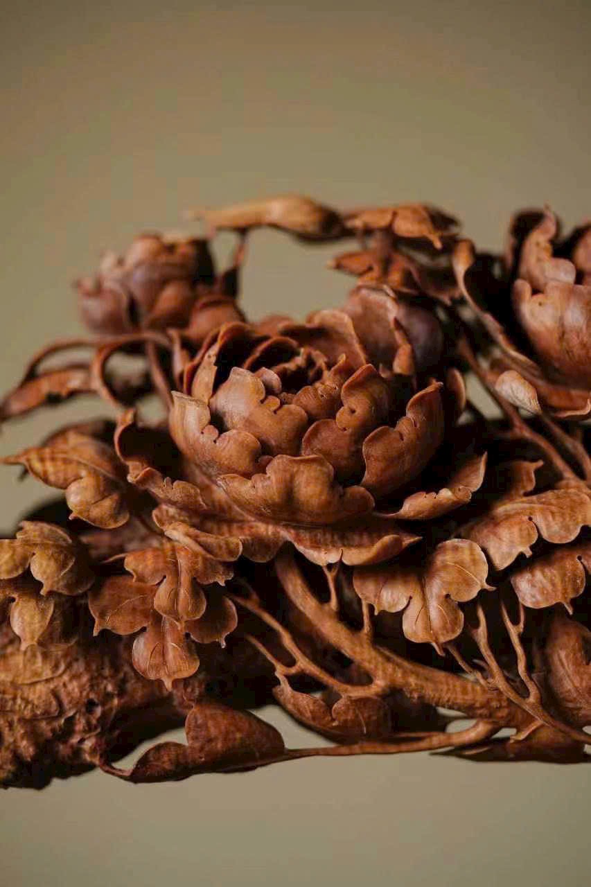 Hoa nở tầng tầng lớp lớp, chim đậu trên cành ngoái nhìn, lông vũ chạm khắc sống động. Kỹ thuật điêu khắc tinh xảo, hương thơm dịu nhẹ lan tỏa.