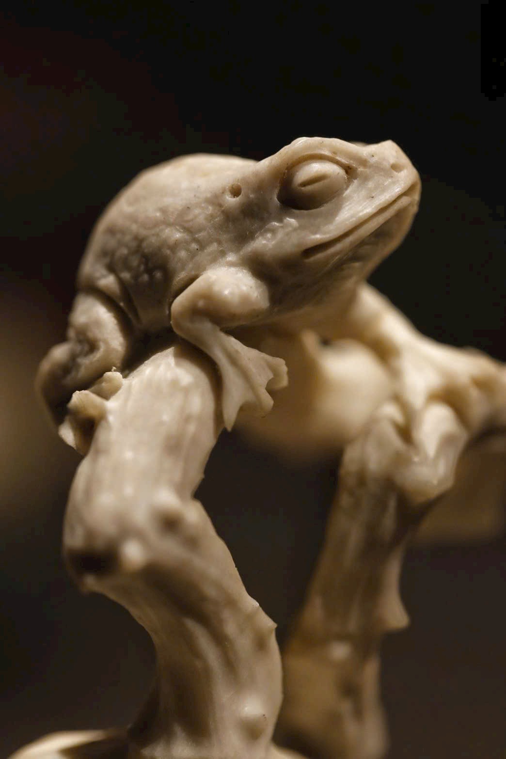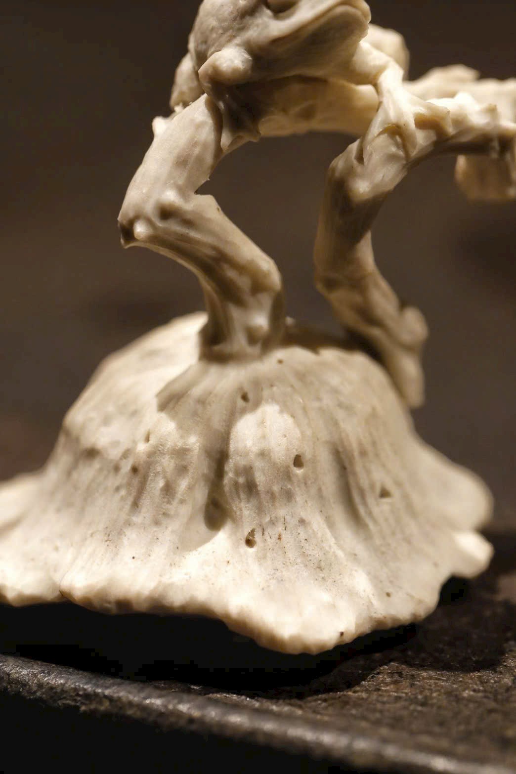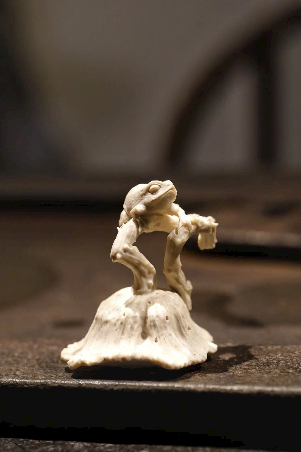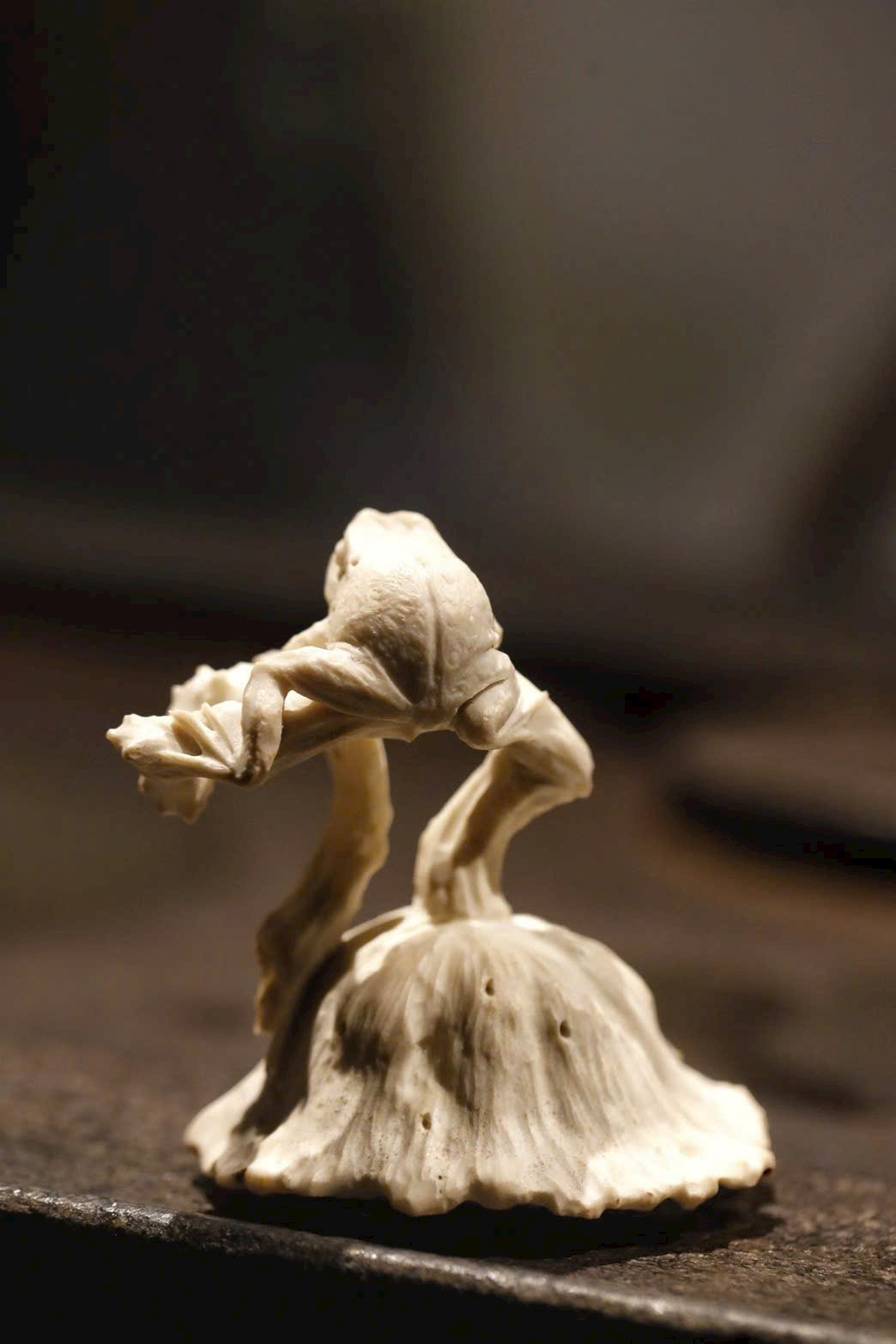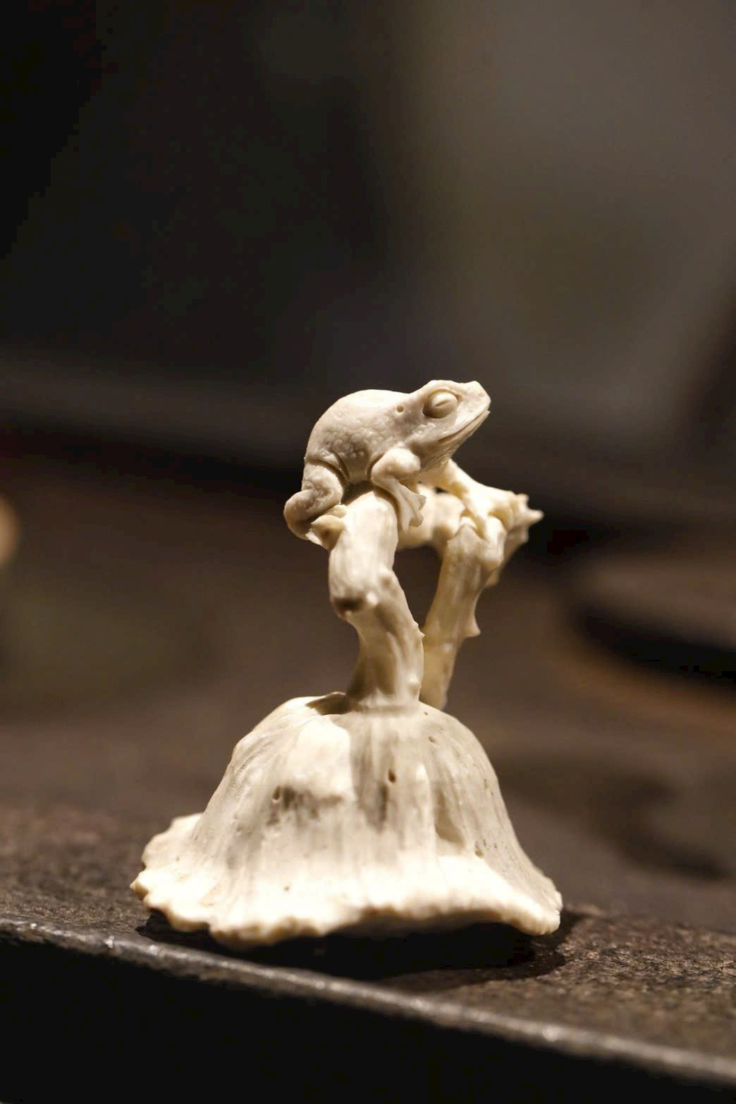 Chú ếch được khắc họa sinh động, dáng ngồi vững chãi trên cành đài sen, đường nét cơ thể tinh tế chân thực. Đài sen tượng trưng cho phúc lộc và con đàn cháu đống, còn ếch là biểu tượng của sức sống dồi dào, sinh khí thịnh vượng. Là món tiểu phẩm tao nhã, mang phong vị tự nhiên cho bàn trà.