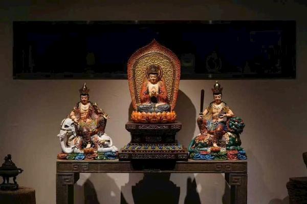 Chạm khắc tinh xảo, gương mặt thần thái sinh động, dáng vẻ cân đối hài hòa. Tam Thánh ngồi kiết già trang nghiêm, dung mạo từ bi thanh tịnh. Kết hợp tô vẽ dát vàng tỉ mỉ, hiệu quả thị giác lộng lẫy, huy hoàng rực rỡ.