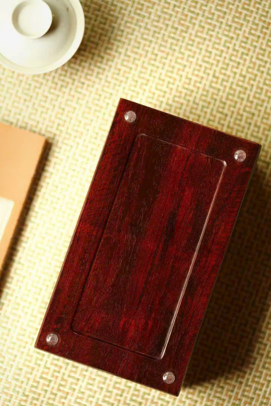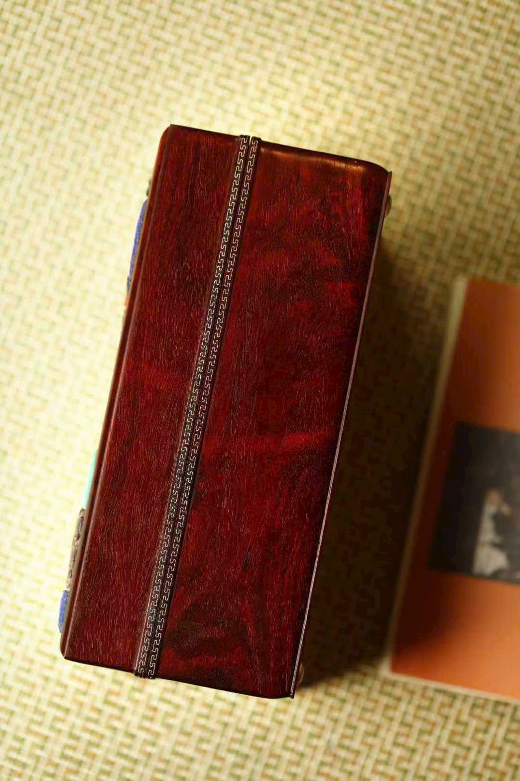Hộp chế tác từ tử đàn lão liệu, kết cấu mộng–then chuẩn mực, dáng hộp tinh xảo gọn gàng. Mặt hộp khảm bách bảo, thân viền tơ bạc họa văn hồi làm điểm nhấn trang trí, sắc màu tươi sáng nổi bật, toát lên khí chất tinh tế mà xa hoa.
