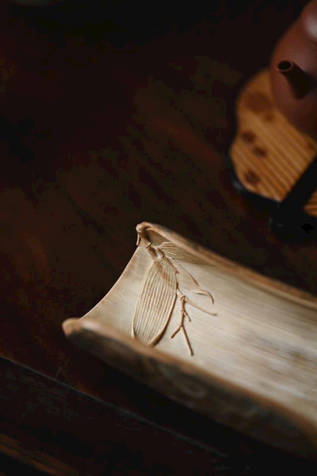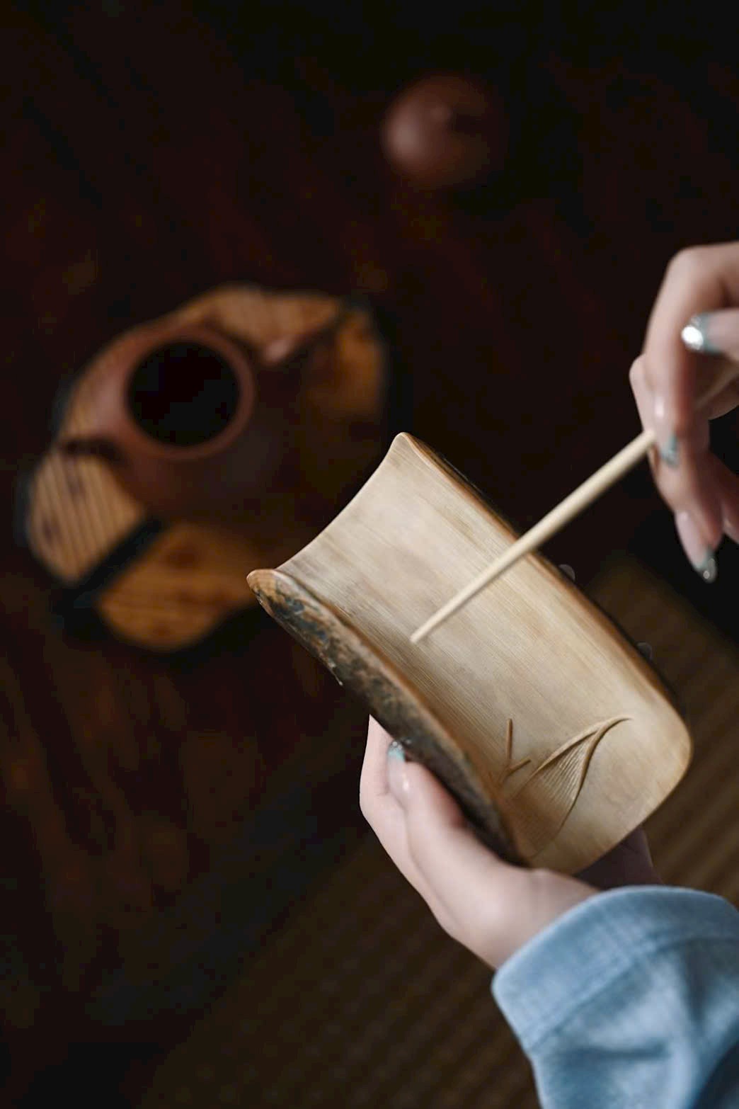 Sắc ng.à ấm áp nhuận mịn, được mài dũa tinh tế; chạm khắc lá trúc trong sáng thanh thoát, như lay động theo gió. Đường cong mềm mại, cầm nắm thoải mái, là lựa chọn tinh nhã cho trà án thanh lịch.