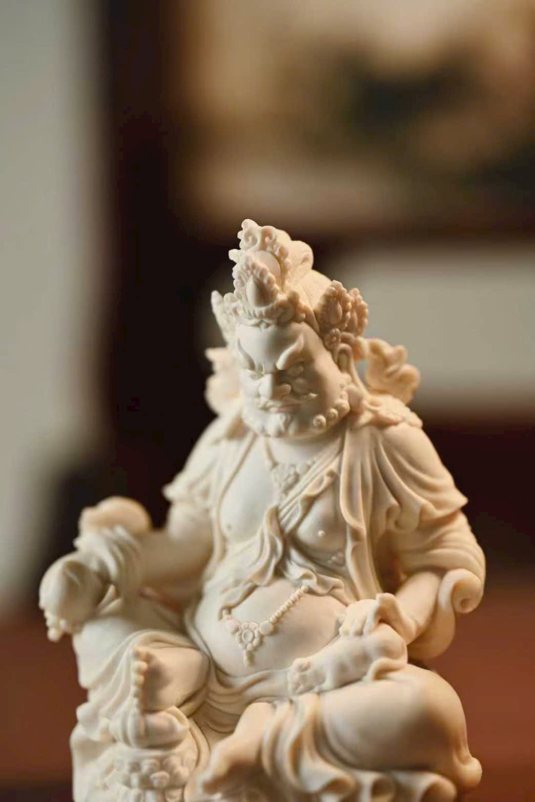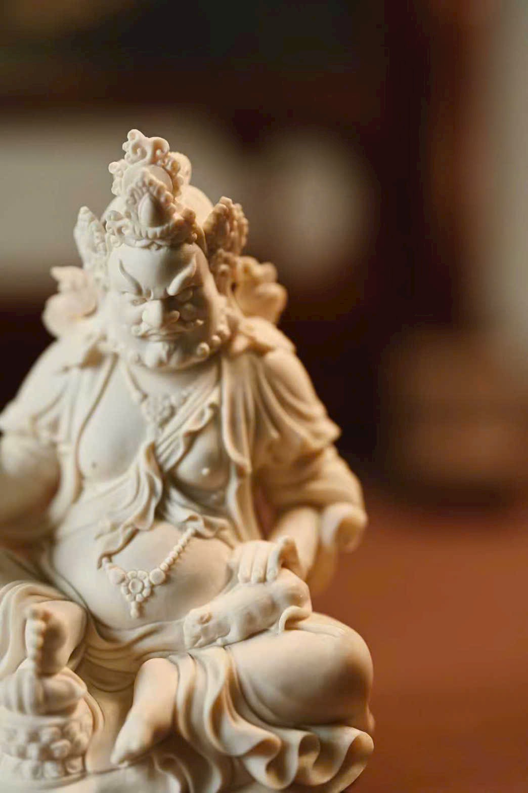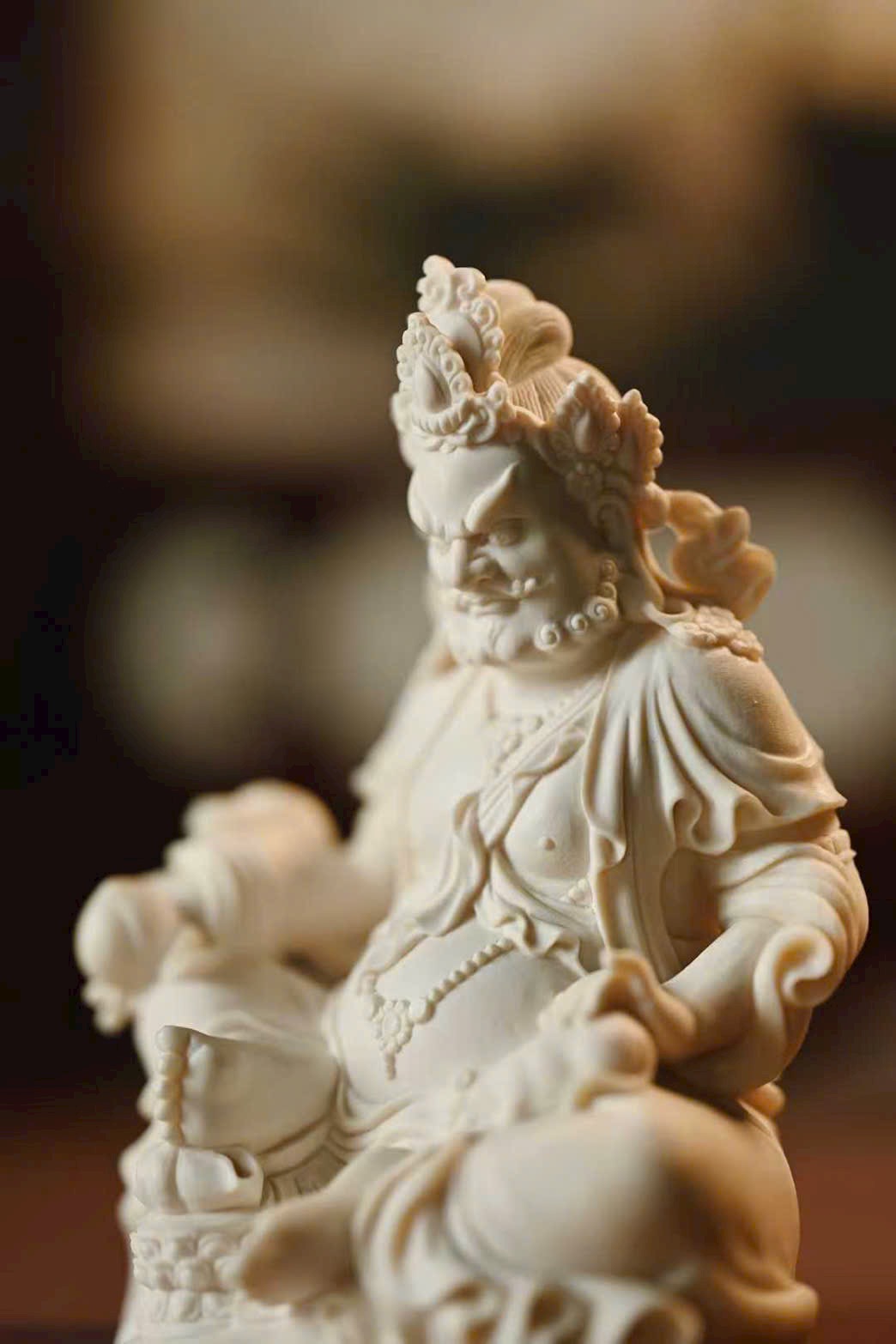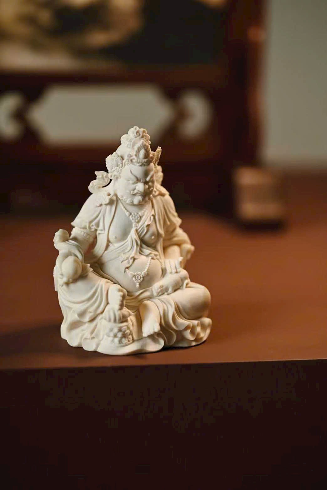 Đầu đội ngũ Phật quan, bụng tròn phúc mãn, hai tay rắn chắc hữu lực; tay phải cầm bảo vật như ý, tay trái nâng chuột nhả châu báu. Thân khoác thiên y, trang sức bằng châu ngọc anh lạc rực rỡ. Chân trái co lại trong tư thế kiết bàn, chân phải đạp lên bảo ốc, dáng ngồi như ý an tọa trên đài sen nguyệt luân, tượng trưng cho phúc lành thù thắng và cát tường viên mãn.