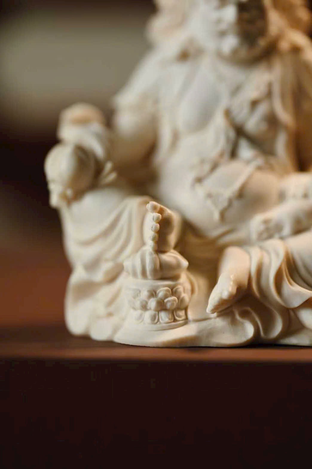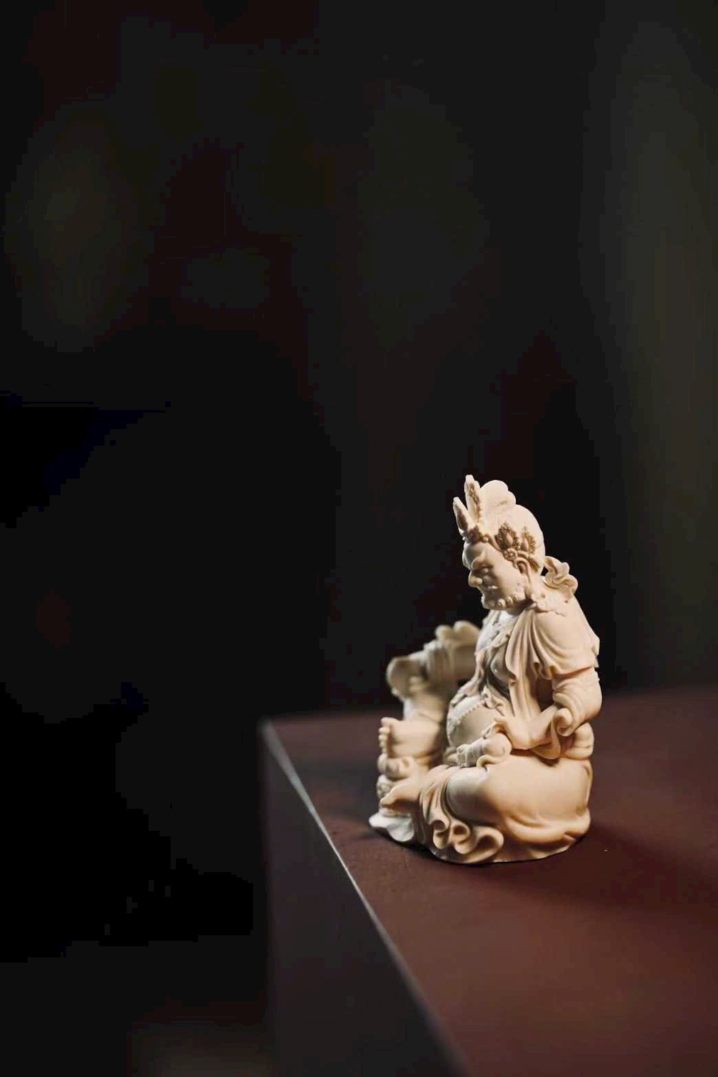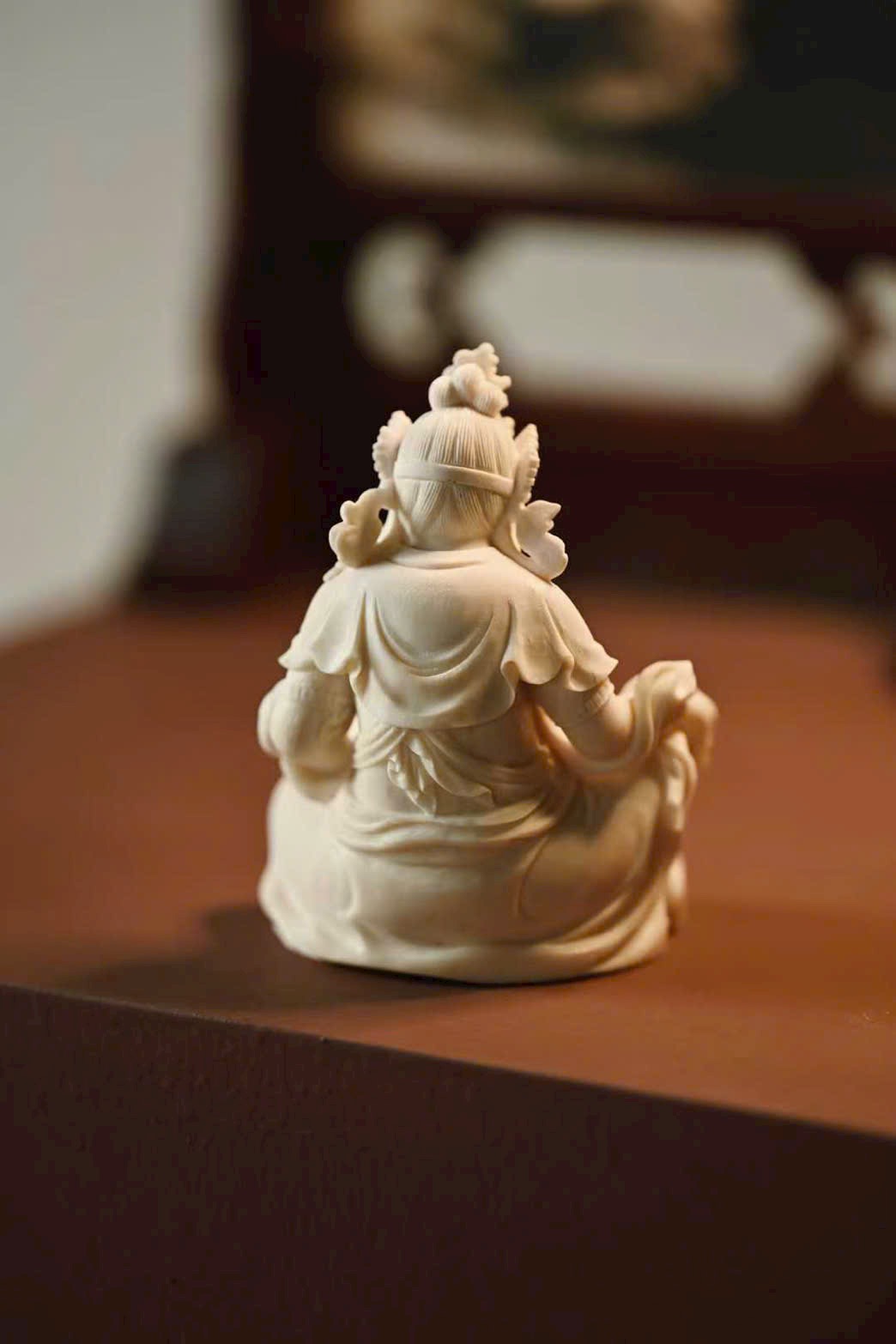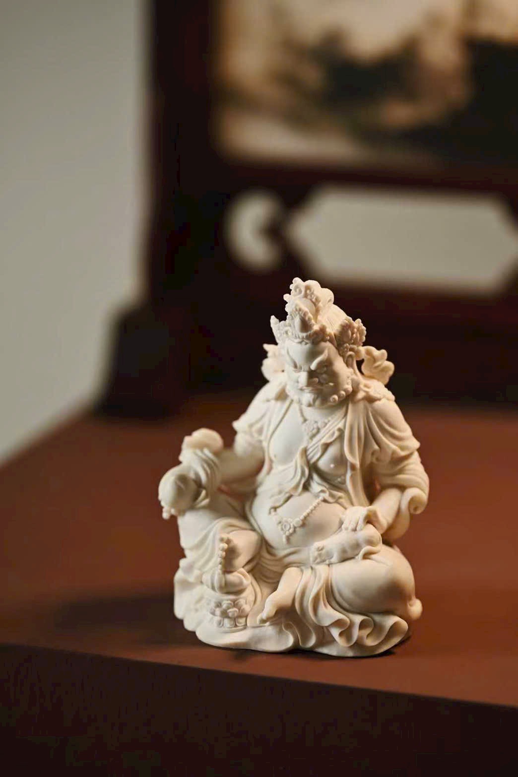 Đầu đội ngũ Phật quan, bụng tròn phúc mãn, hai tay rắn chắc hữu lực; tay phải cầm bảo vật như ý, tay trái nâng chuột nhả châu báu. Thân khoác thiên y, trang sức bằng châu ngọc anh lạc rực rỡ. Chân trái co lại trong tư thế kiết bàn, chân phải đạp lên bảo ốc, dáng ngồi như ý an tọa trên đài sen nguyệt luân, tượng trưng cho phúc lành thù thắng và cát tường viên mãn.