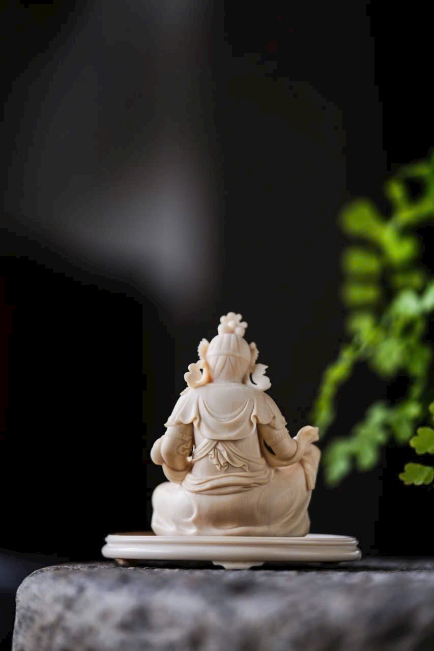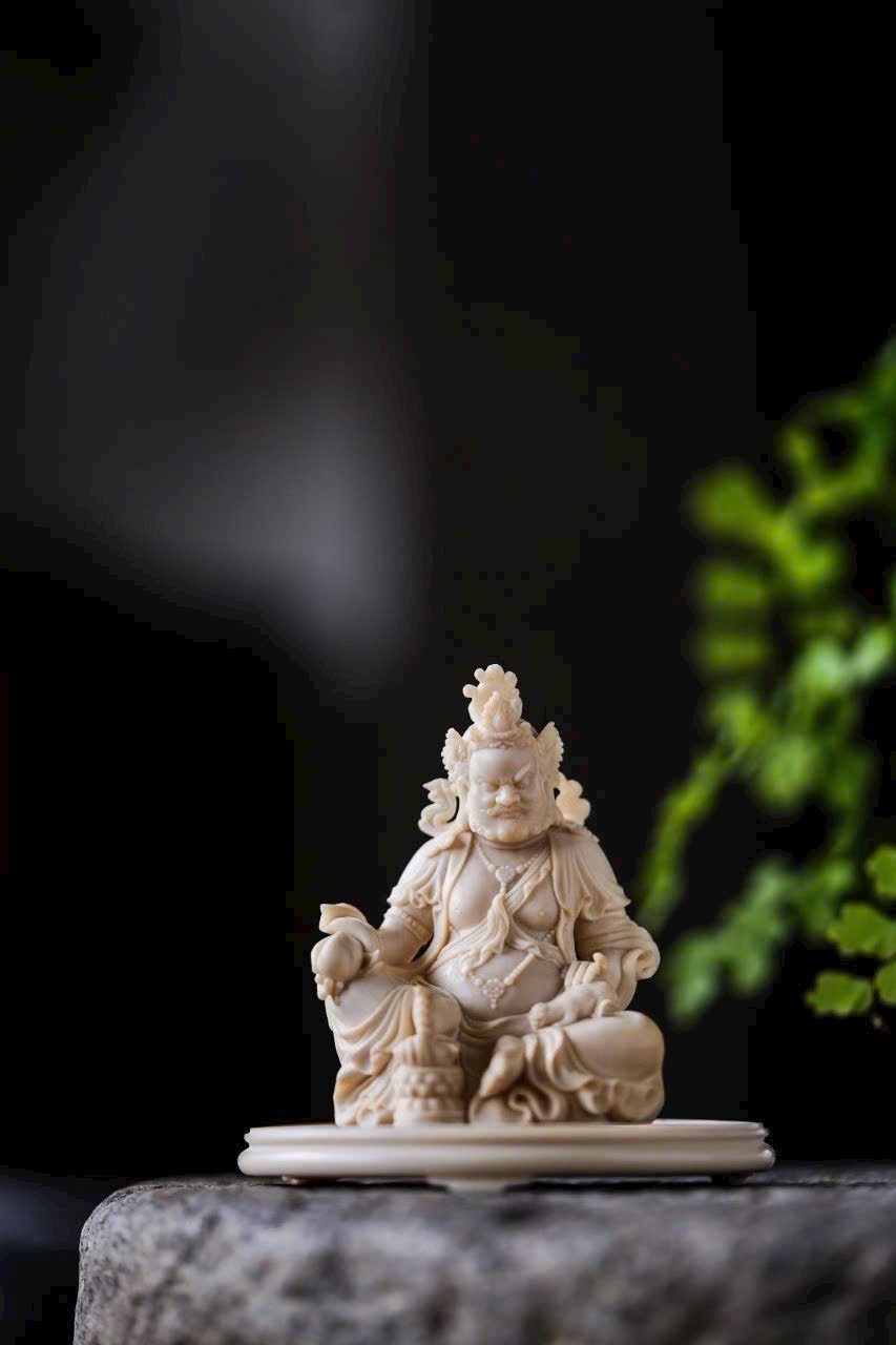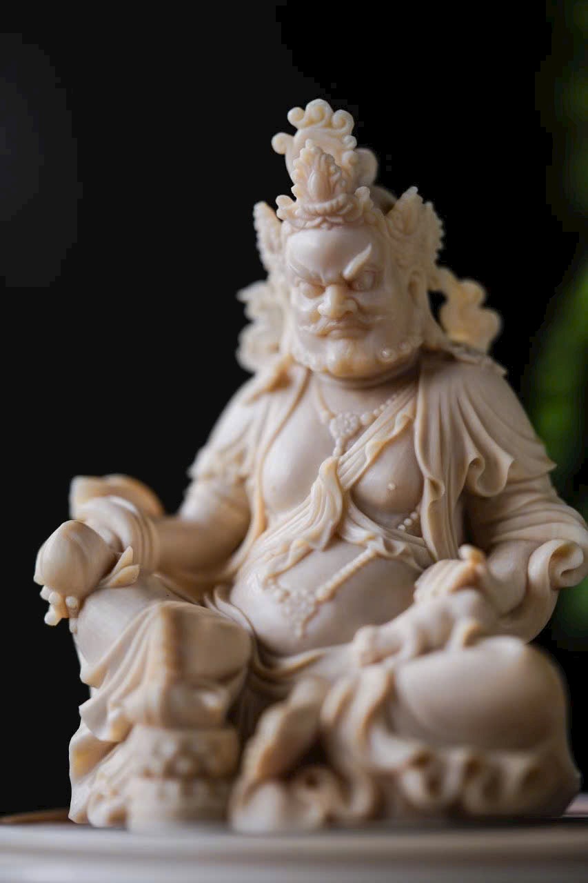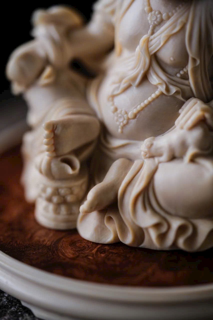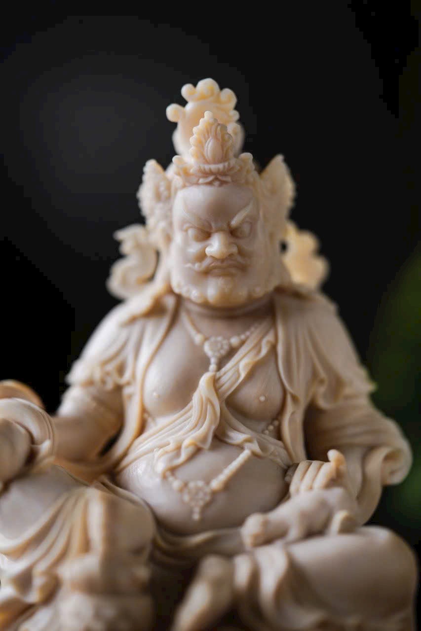 - Đội bảo quan, đeo ngọc quý, tay phải cầm bảo châu, tay trái đỡ chuột nhả châu đầy ắp. Trưng bày trên bàn giúp chiêu tài nạp lộc, phúc khí viên mãn, thêm phần thiền ý.