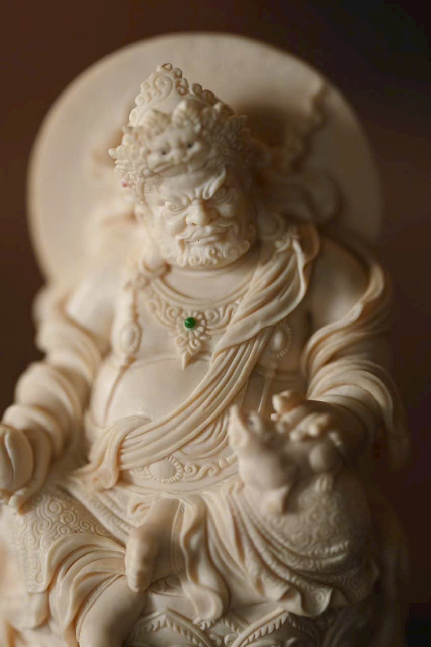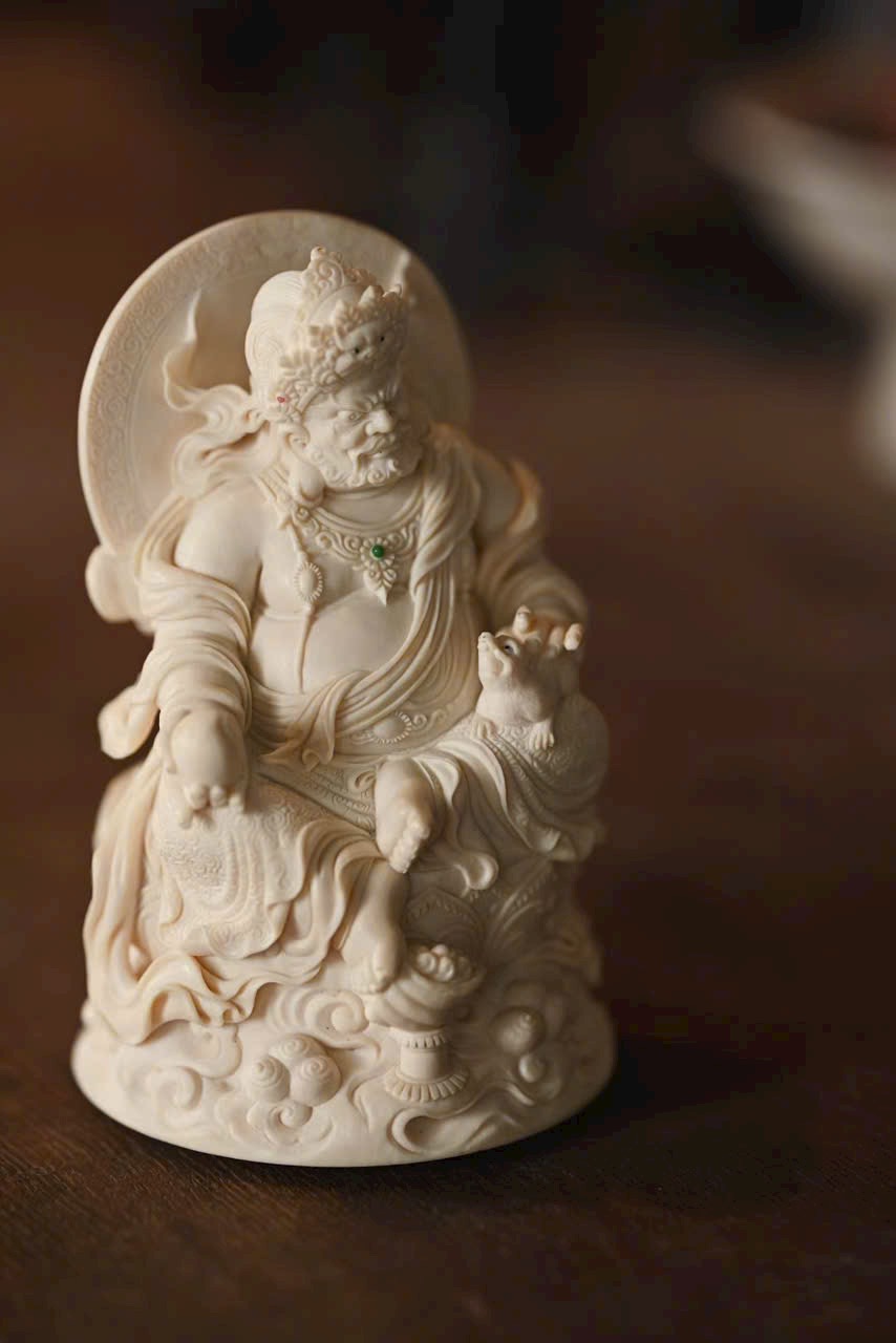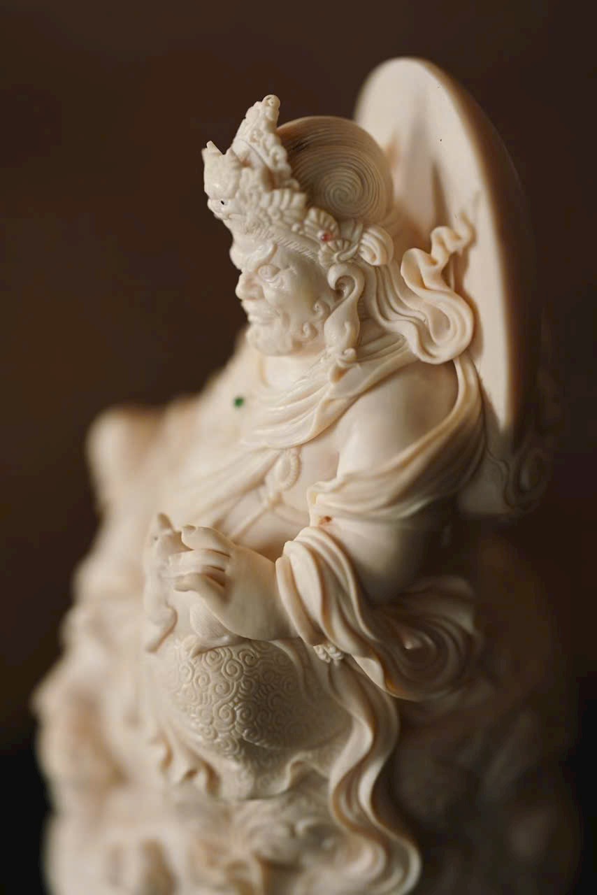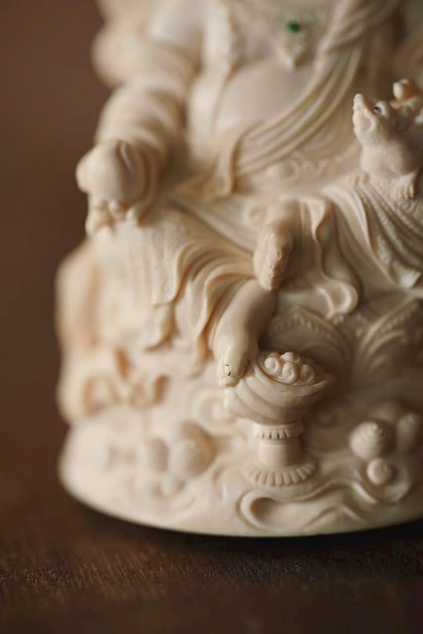 Chạm khắc thủ công tinh xảo, Hoàng Tài Thần thần thái uy nghi, tóc mảnh, bảo quan lộng lẫy, chuột nhả châu sống động, tượng trưng chiêu tài tụ bảo.
