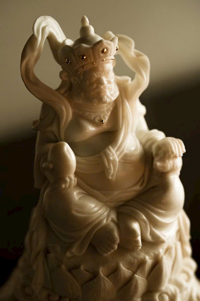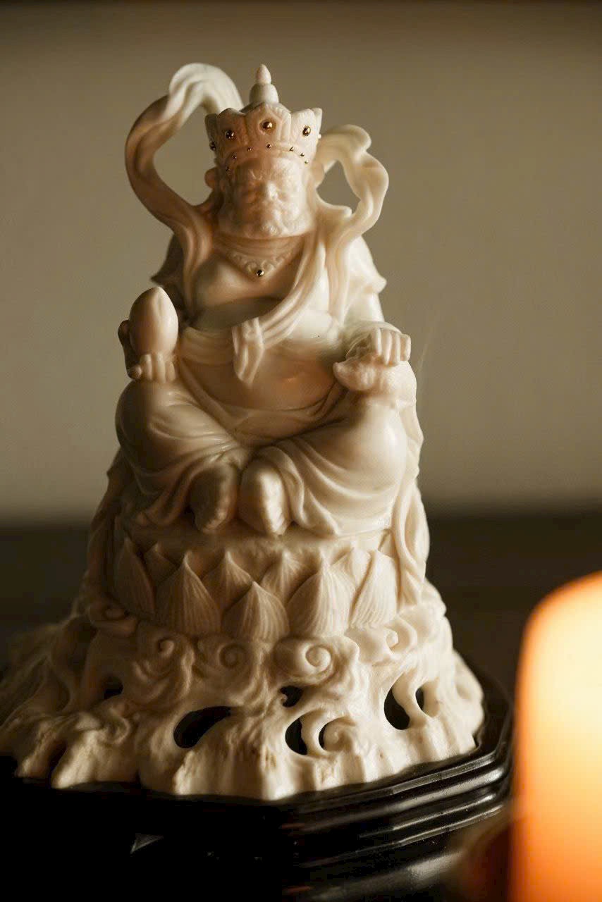 Hai mắt mở tròn, uy nghi oai phong; một tay nâng nhẹ con chuột ngậm bảo vật, một tay cầm đào, toát lên vẻ từ bi mà uy nghiêm, trang nghiêm và đặc sắc.