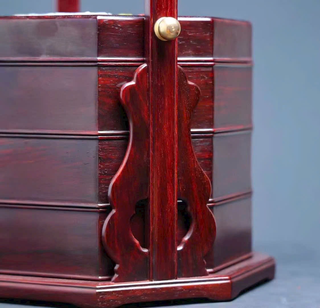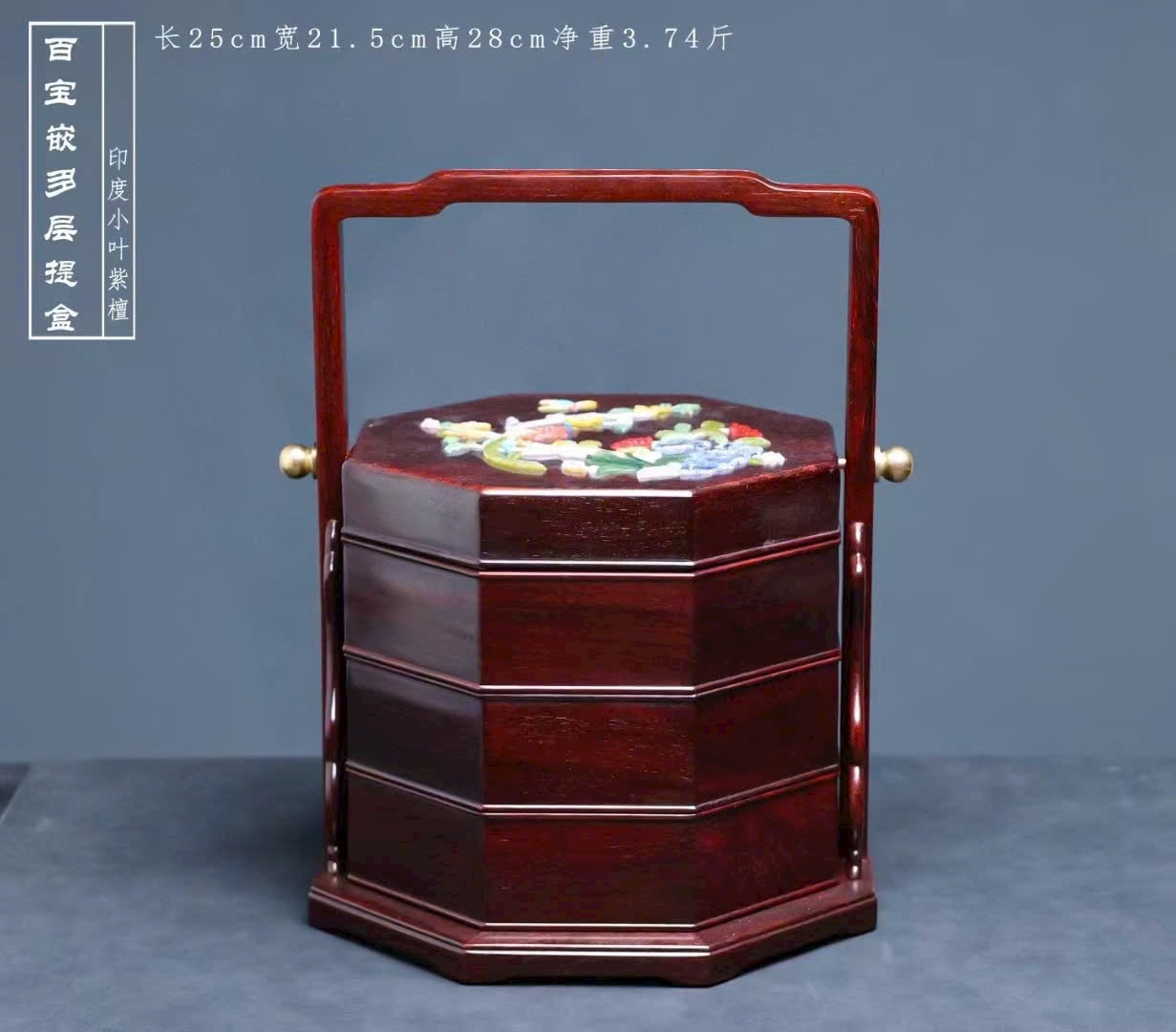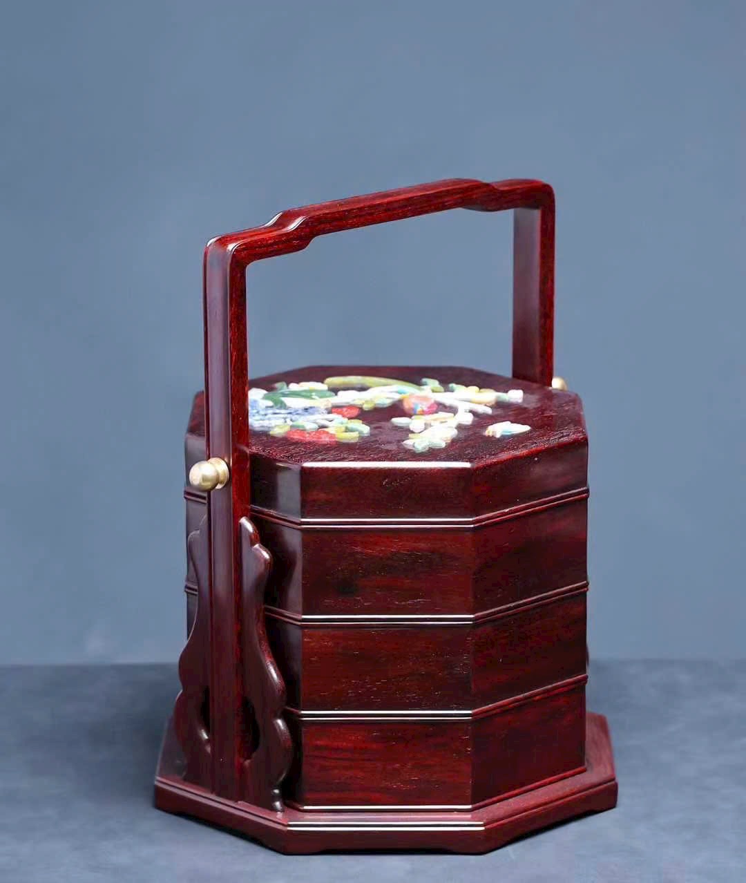 🌿 Gỗ tử đàn Ấn Độ lá nhỏ bách bảo 《Hộp bát giác xách tay – Hoa khai phú quý》