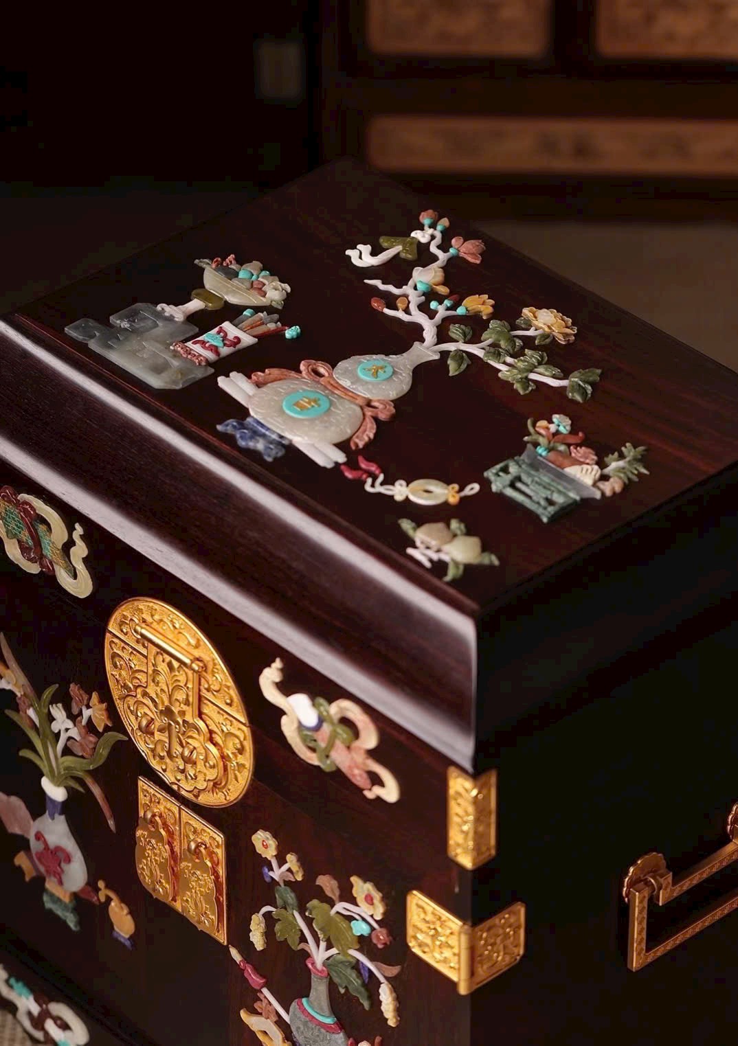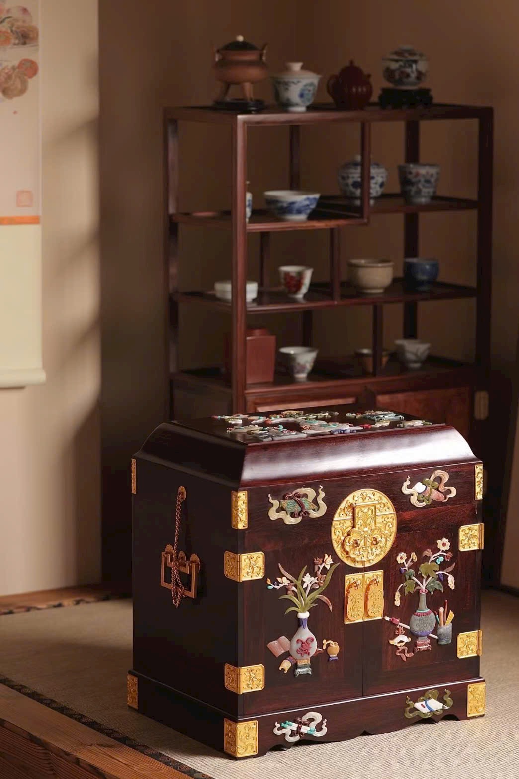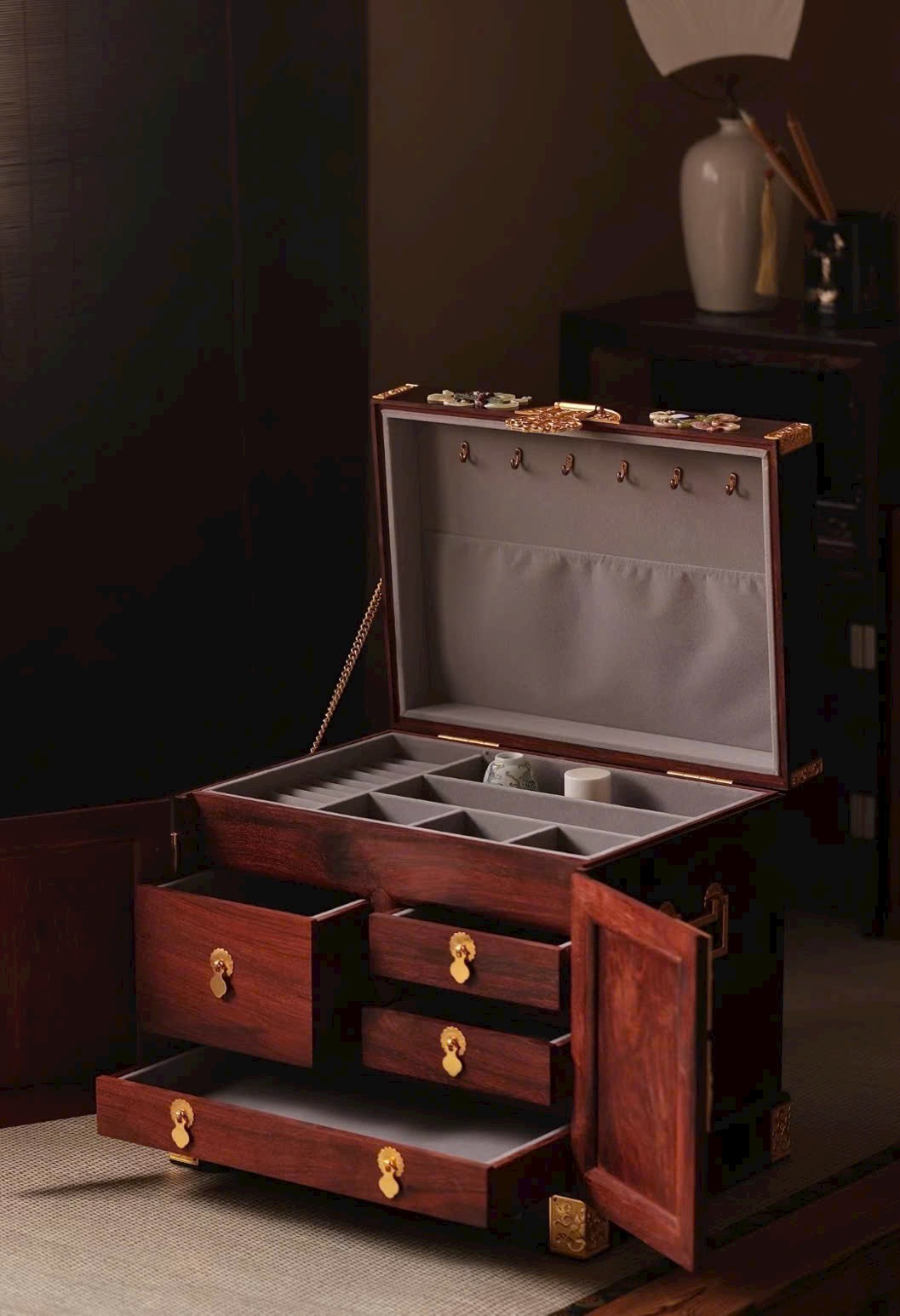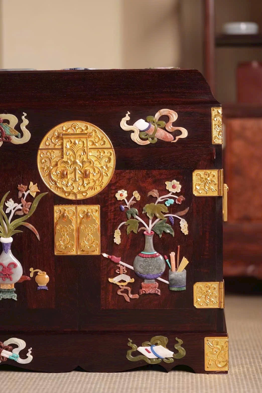 Chế tác từ gỗ già nguyên tấm, thuộc kích thước lớn siêu hiếm hiện có trên thị trường. Màu gỗ nhã nhặn, kết cấu mộng thủ công, dáng thức tinh xảo, khảm nạm trân bảo đa dạng, phong vận thanh nhã tinh mỹ. Thiết kế nhiều tầng ngăn kéo, cất giữ đồ đạc ổn định và tinh tế. Đặt trong phòng nhã thất, vừa ngắm vừa thấy vui mắt.