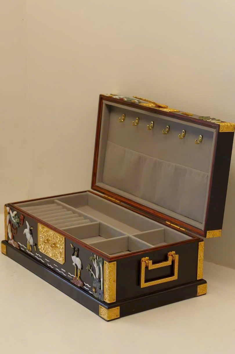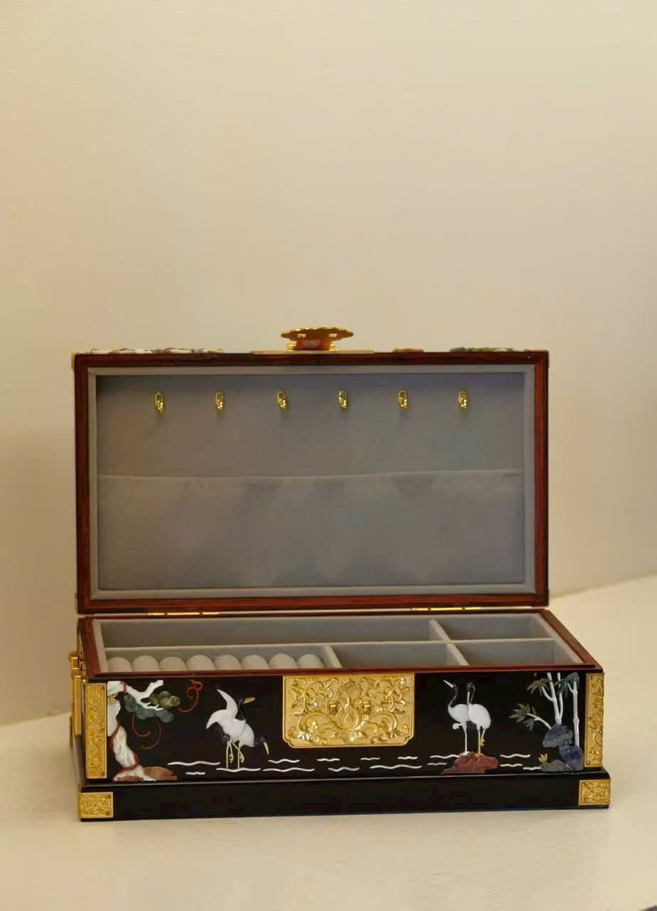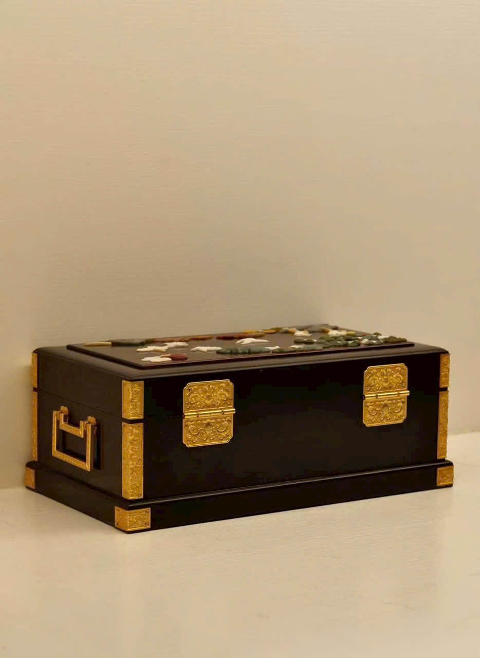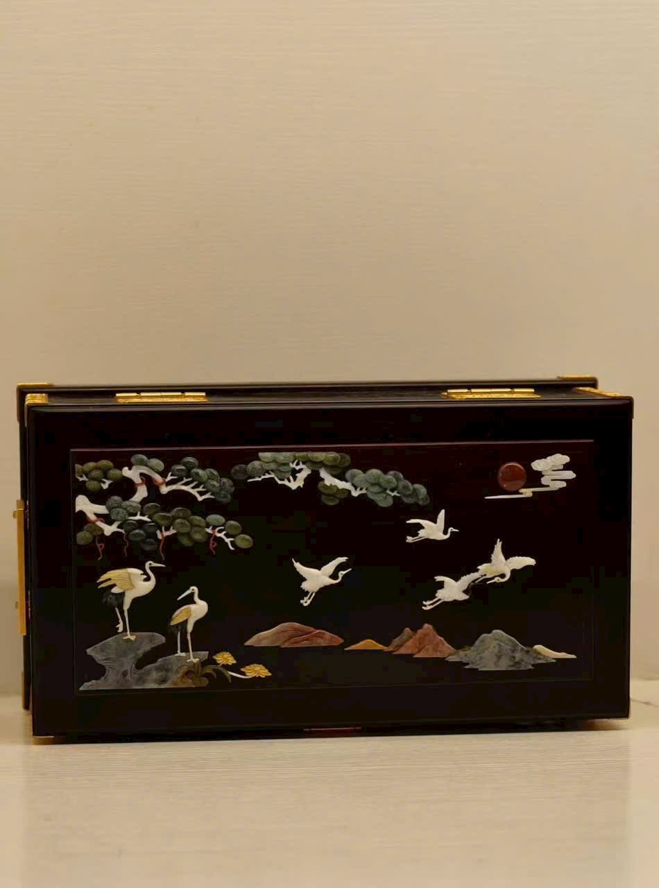 Chế tác từ gỗ tử đàn quý hiếm, sắc gỗ trầm sâu như màn đêm, chất gỗ rắn chắc, đường vân ẩn chứa dấu ấn thời gian tĩnh lặng. Trên thân hộp, kỹ nghệ khảm bách bảo tỏa sáng rực rỡ: ngọc thạch, xà cừ… qua bàn tay nghệ nhân hóa thành cảnh tiên hạc lăng vân, tùng thạch hiên ngang, giàu khí vận cát tường.