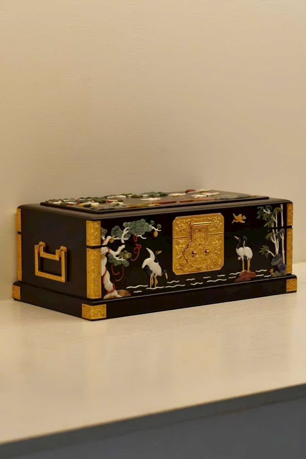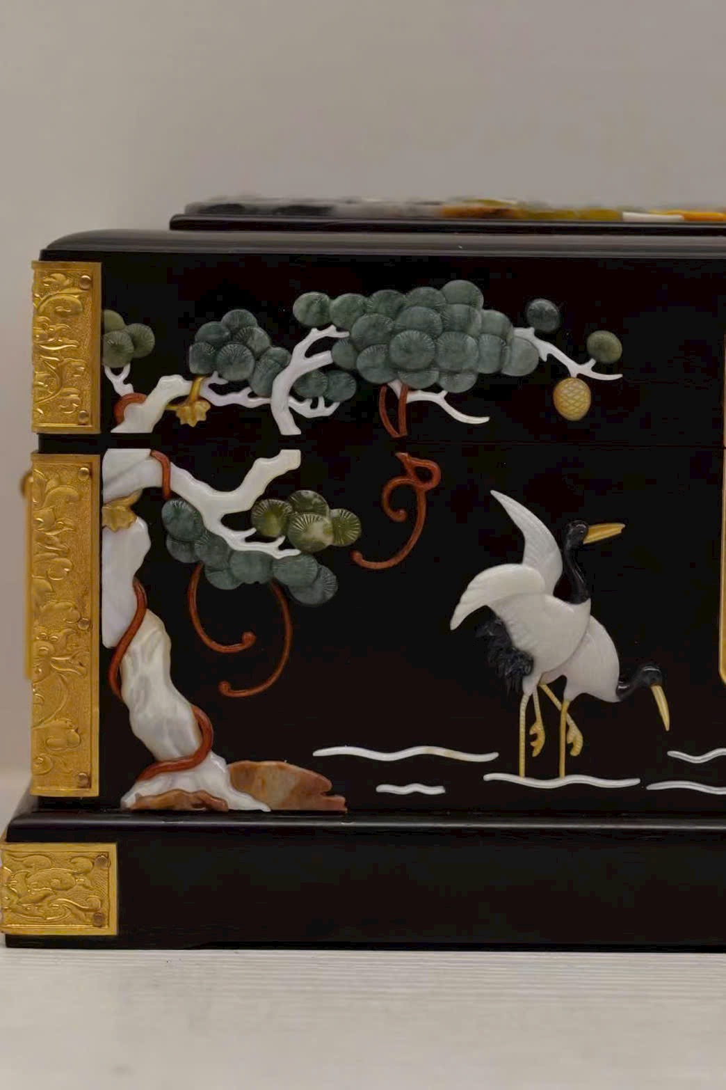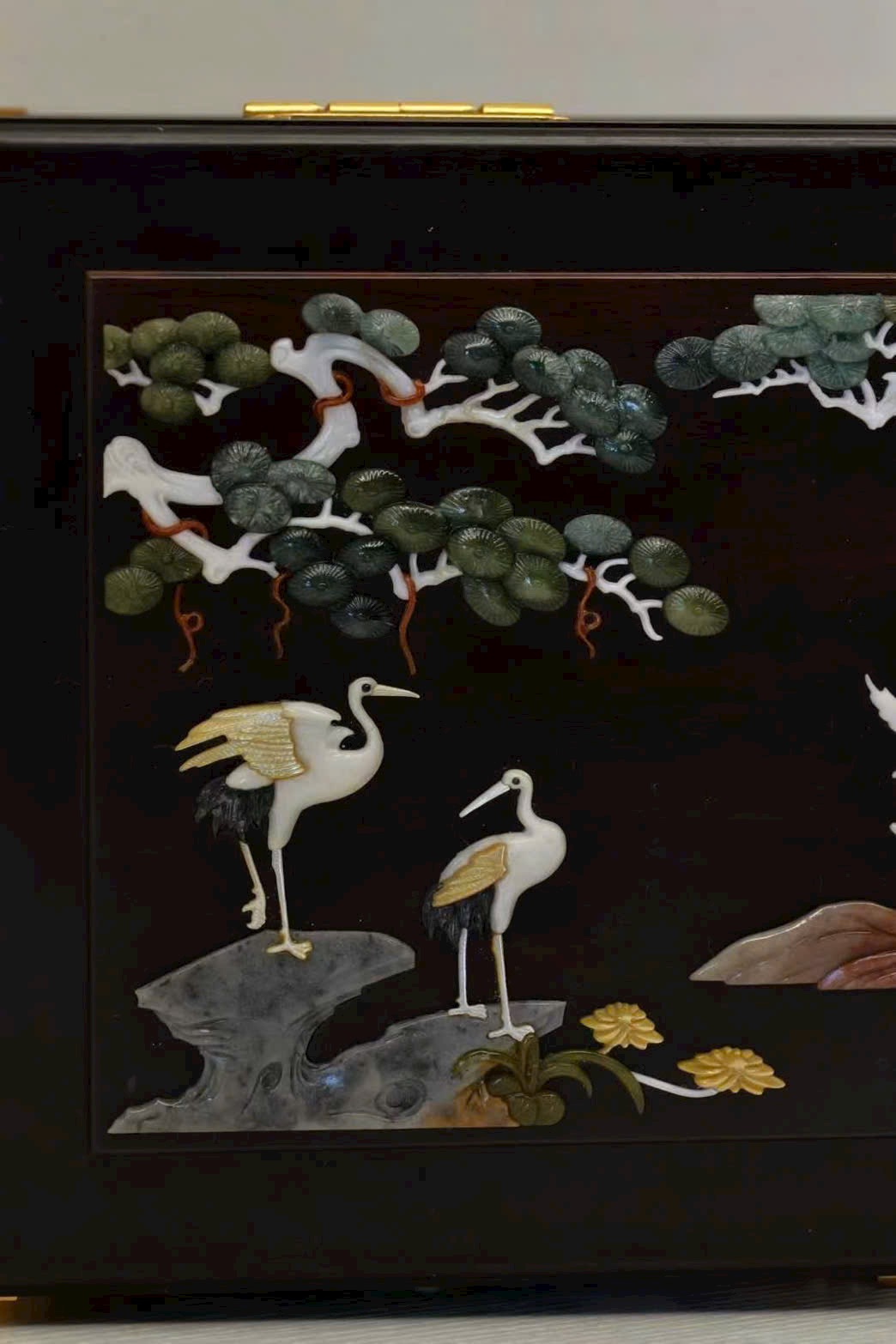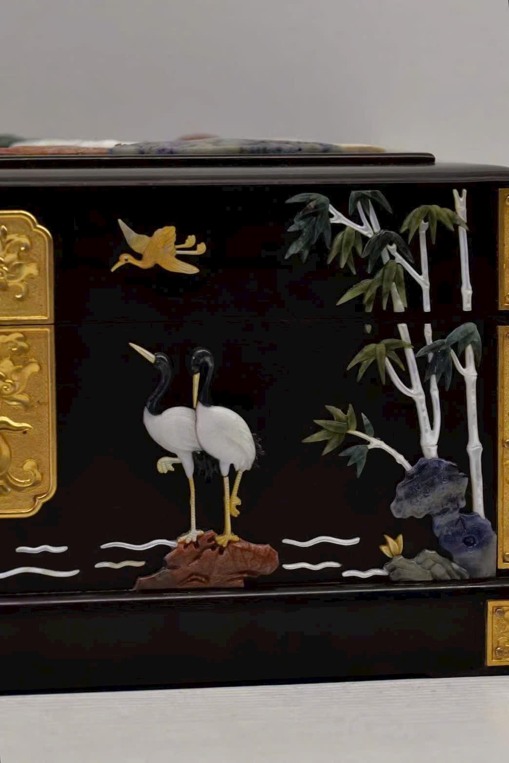Chế tác từ gỗ tử đàn quý hiếm, sắc gỗ trầm sâu như màn đêm, chất gỗ rắn chắc, đường vân ẩn chứa dấu ấn thời gian tĩnh lặng. Trên thân hộp, kỹ nghệ khảm bách bảo tỏa sáng rực rỡ: ngọc thạch, xà cừ… qua bàn tay nghệ nhân hóa thành cảnh tiên hạc lăng vân, tùng thạch hiên ngang, giàu khí vận cát tường.
