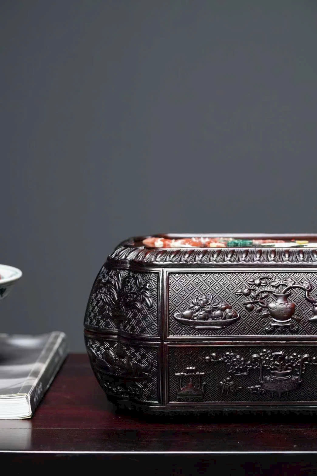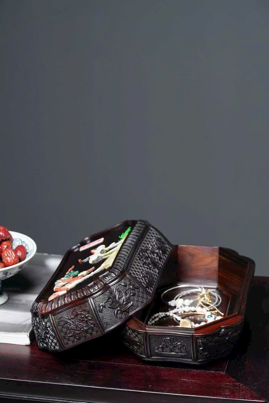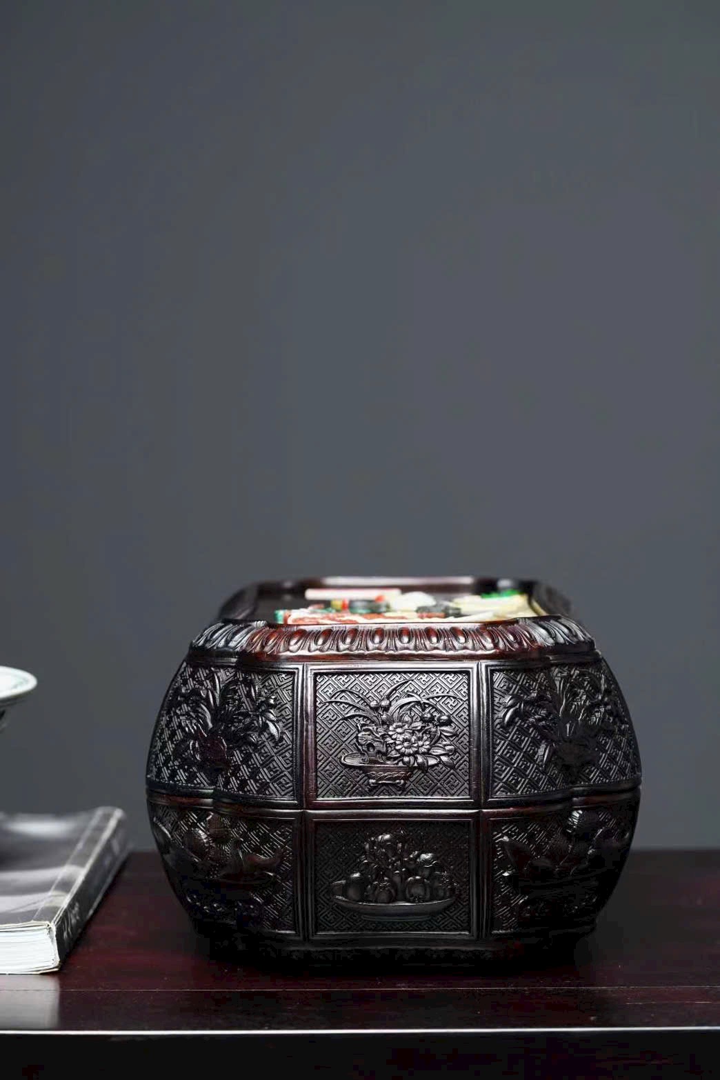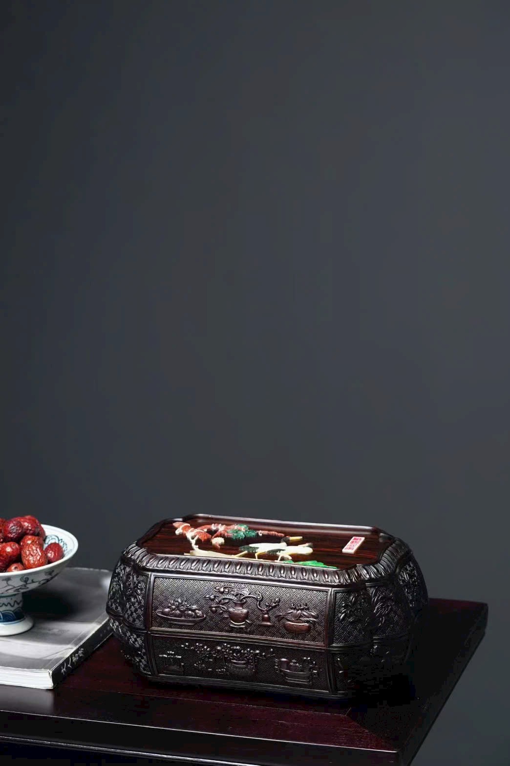Chất liệu gỗ trắc đỏ, kiểu dáng trang nhã, phù hợp đựng đồ thư phòng, sưu tầm và trưng bày.