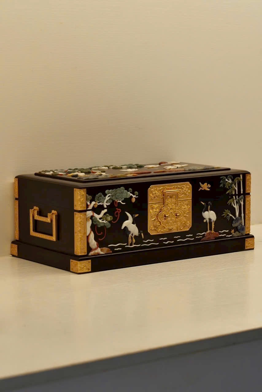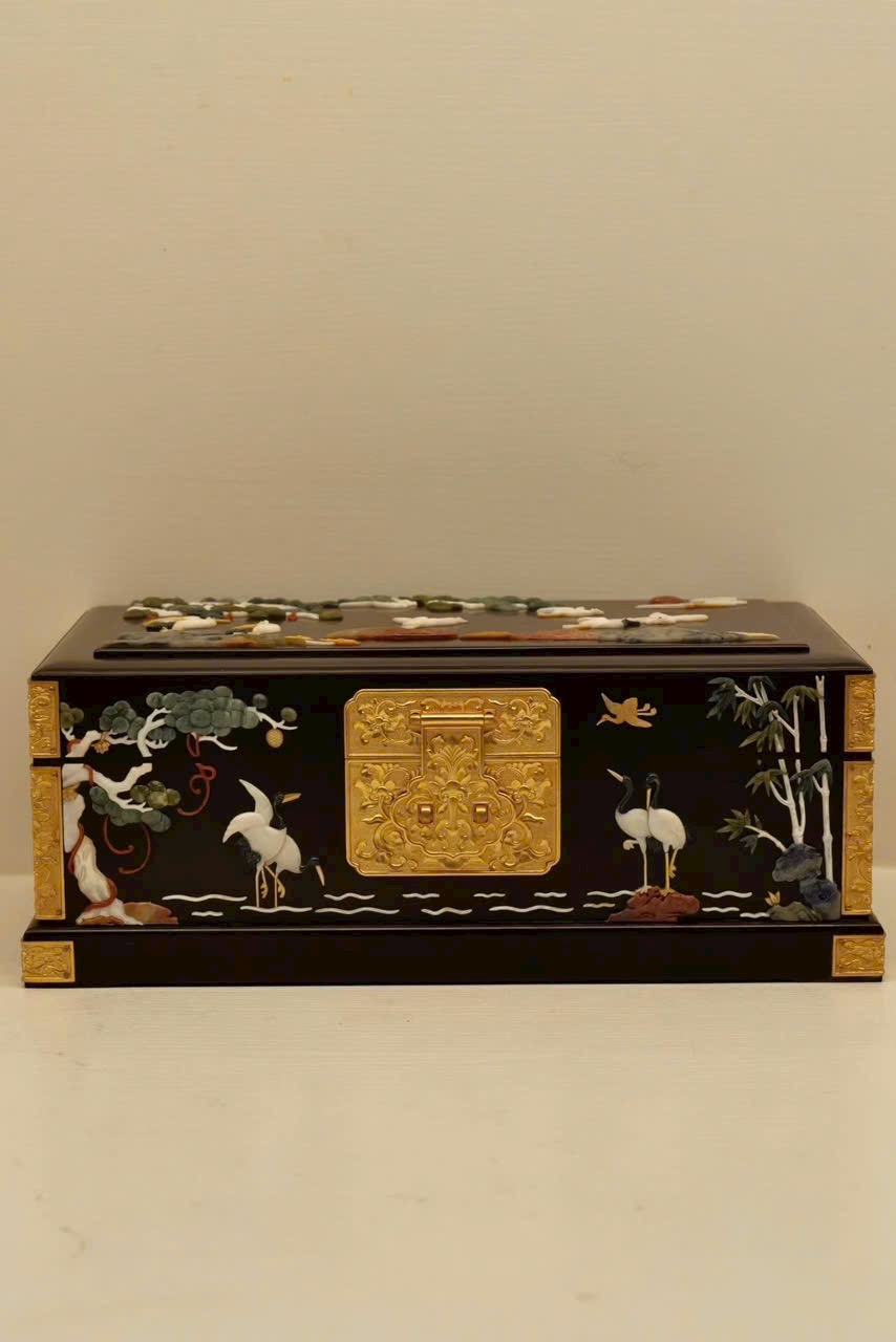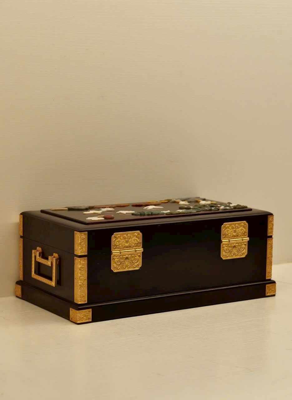 🌿 Hộp Gia Bảo Tùng Hạc – chế tác từ gỗ tử đàn quý hiếm, sắc gỗ trầm như đêm, vân gỗ mang dấu ấn thời gian.